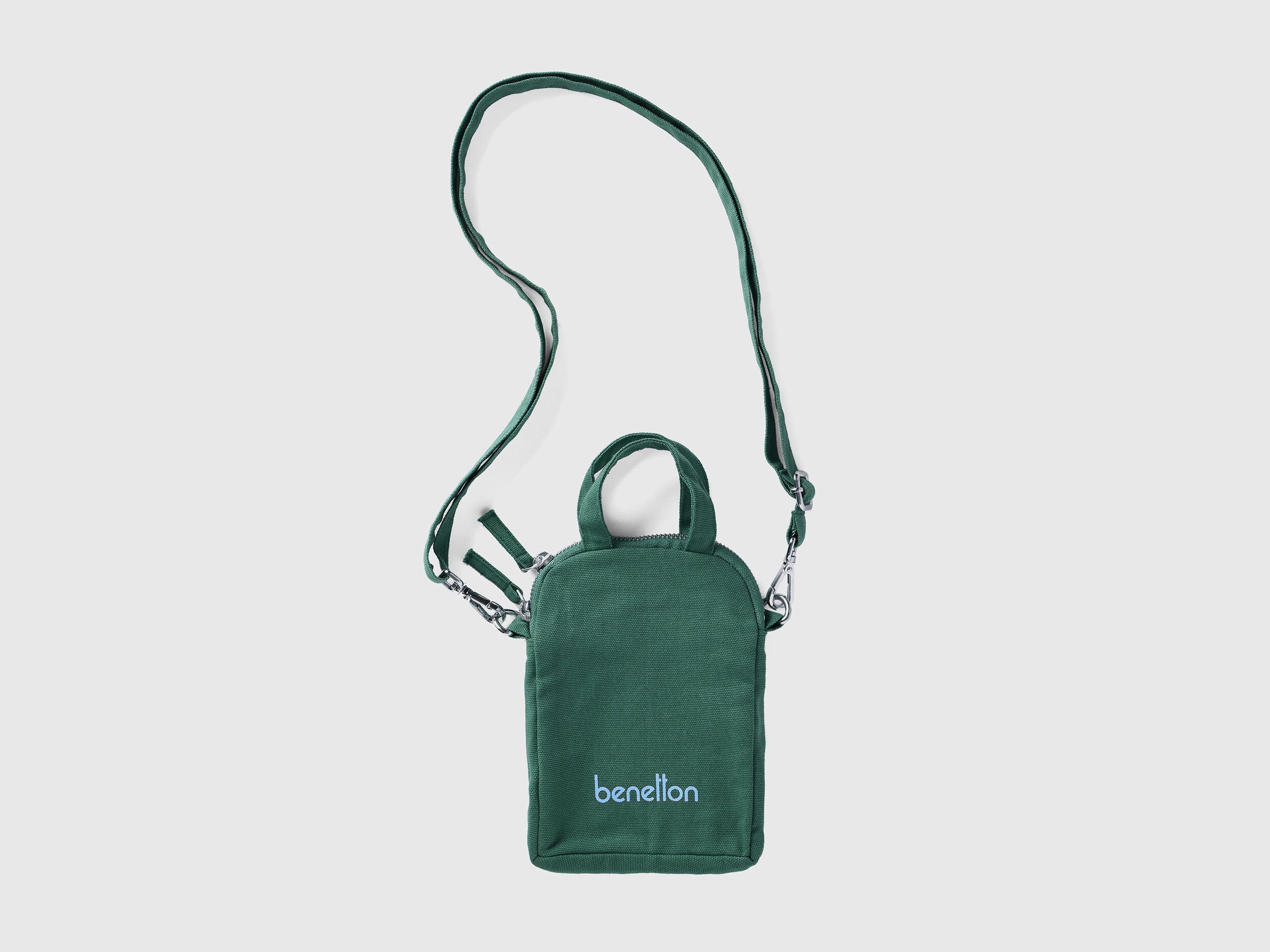 Cell phone holder in pure cotton canvas with adjustable and removable shoulder strap. Opening with zip and zip puller and double handles at the head. Contrasting logo printed on one side. Practical, functional and trendy