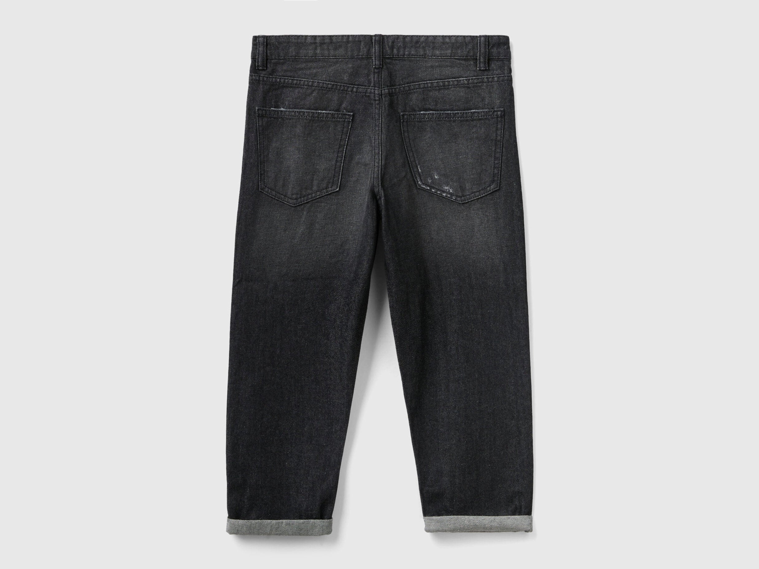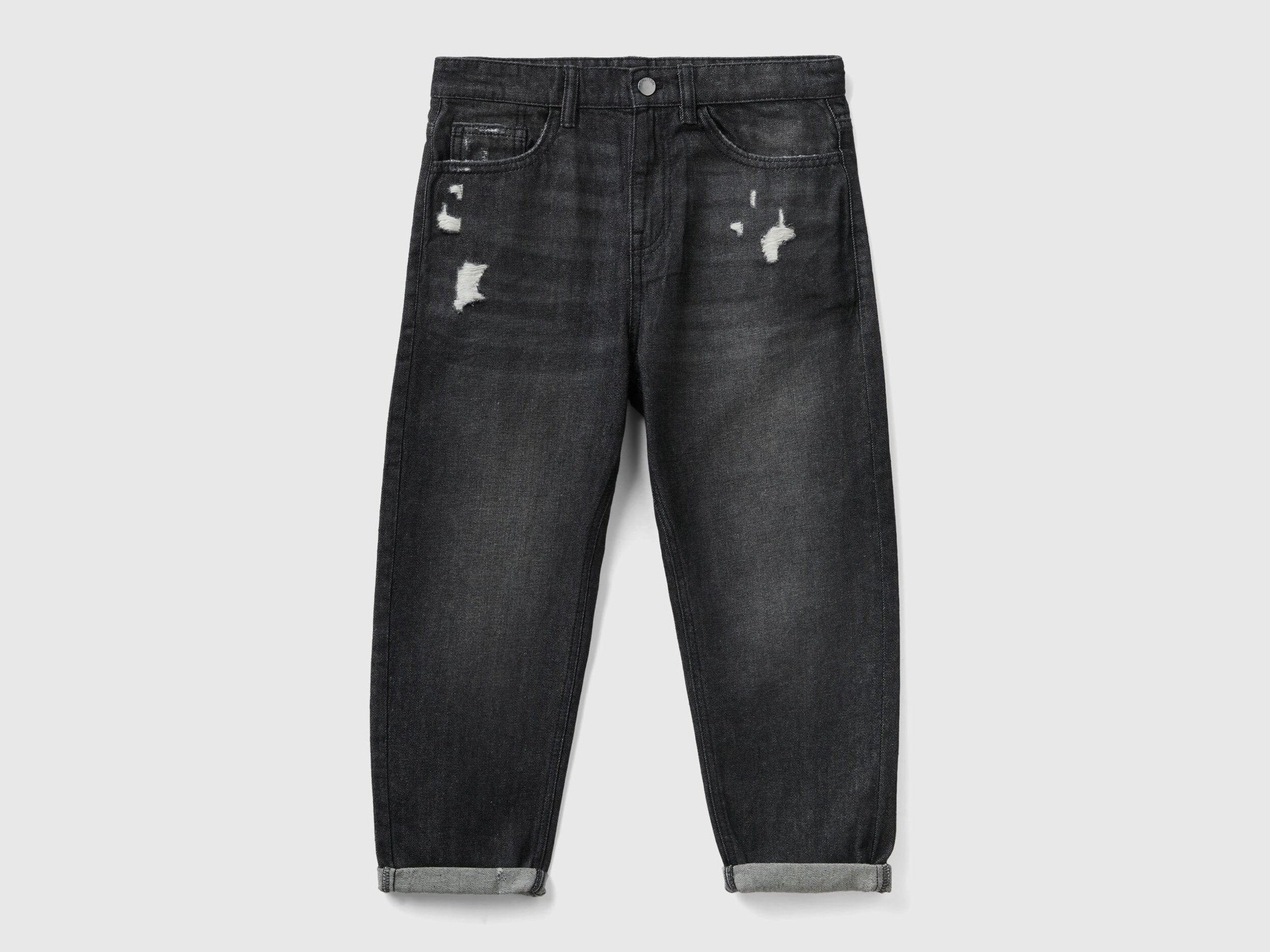 Long trousers in pure cotton denim with a worn look. Five pocket design with rips and cuffed bottoms. Practical front zip and button opening. Balloon fit, for super modern looks.