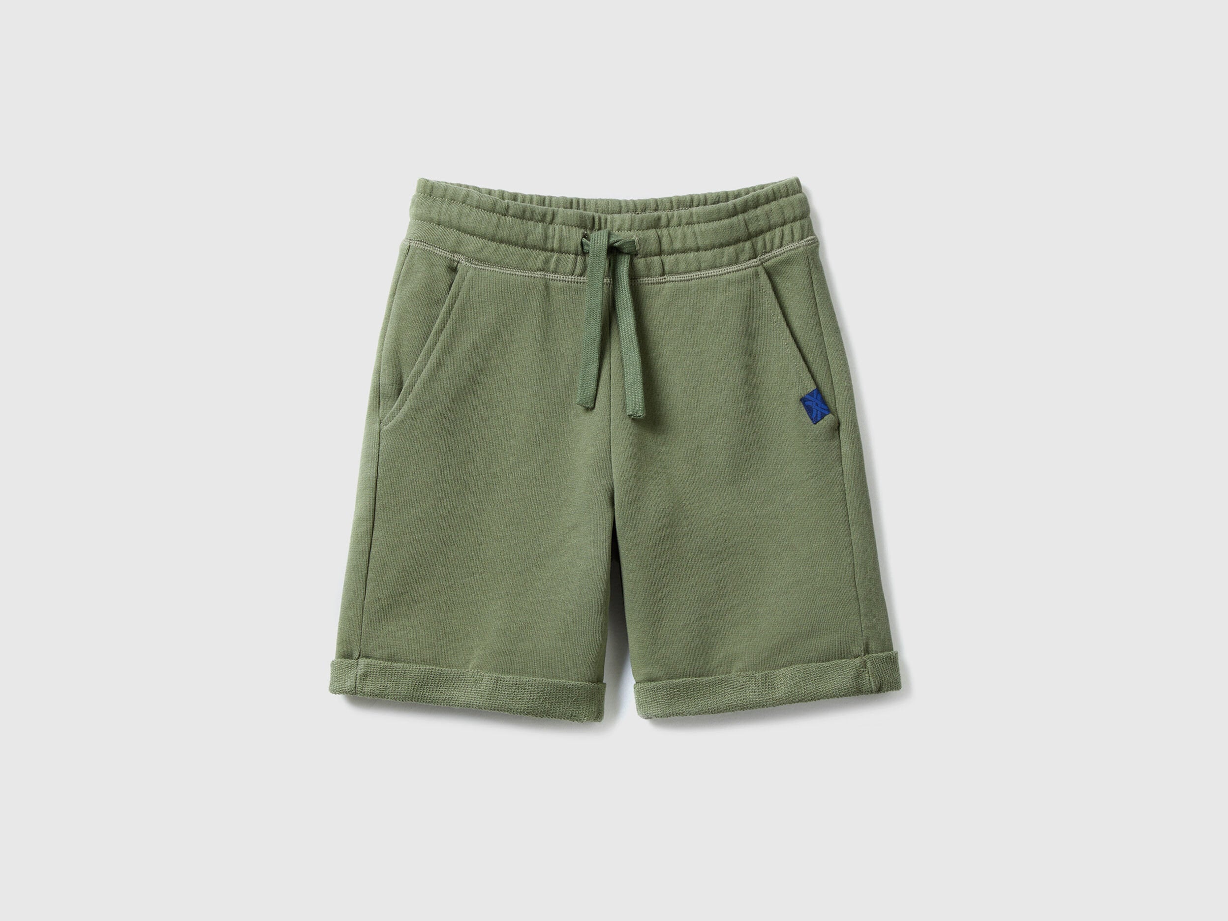 Spring-weight organic cotton fleece shorts. Waist with internal elastic and drawstring, front pockets and cuff fixed at the bottom of the leg. Sporty look and practicality. Article made with fabric containing at least 95% organic cotton.