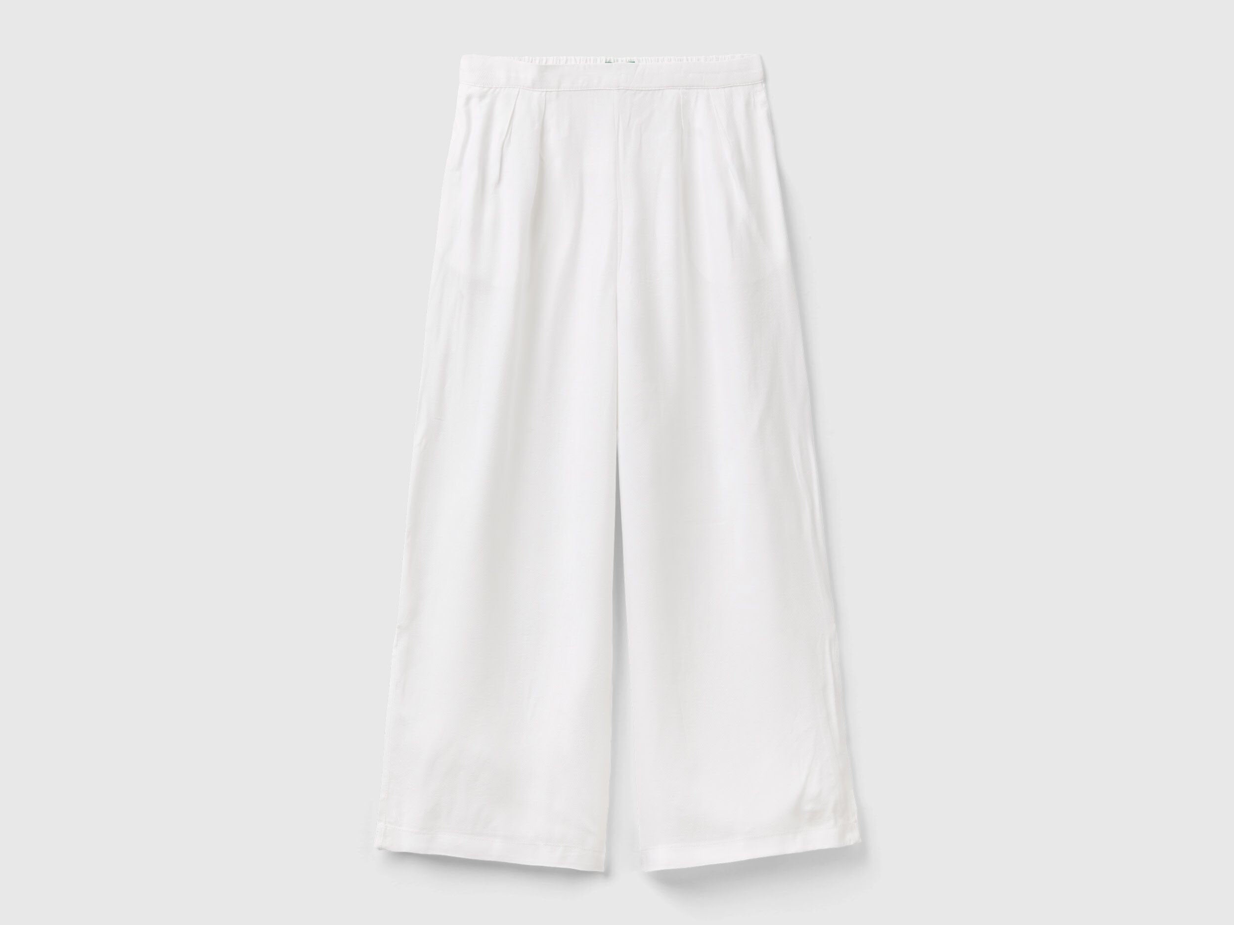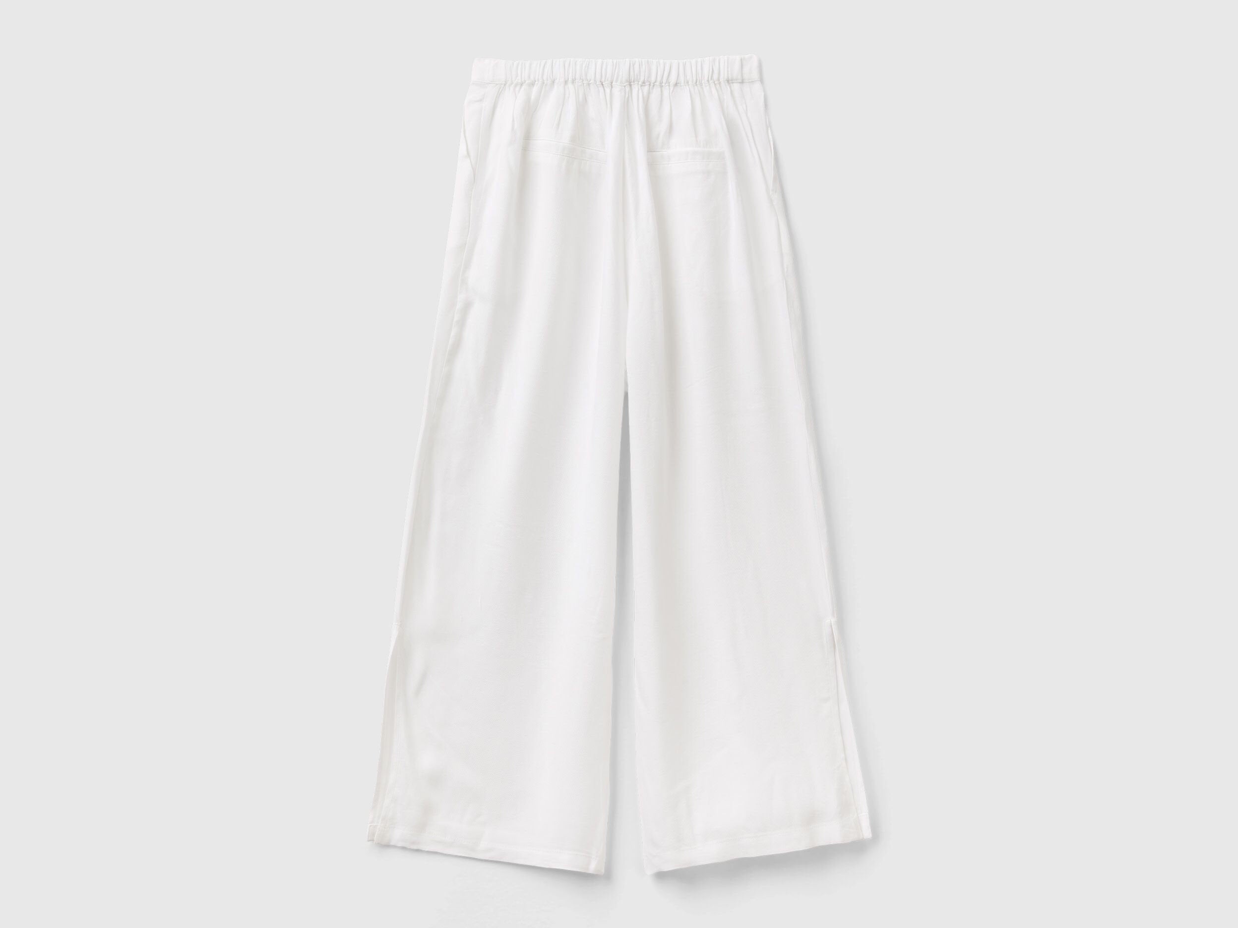 Long trousers in flowy pure viscose fabric. Palazzo cut with darts at the front and slits at the bottom. Waist with internal elastic on the back, front pockets and welt pockets on the back. Feminine and versatile, also ideal for special occasions.