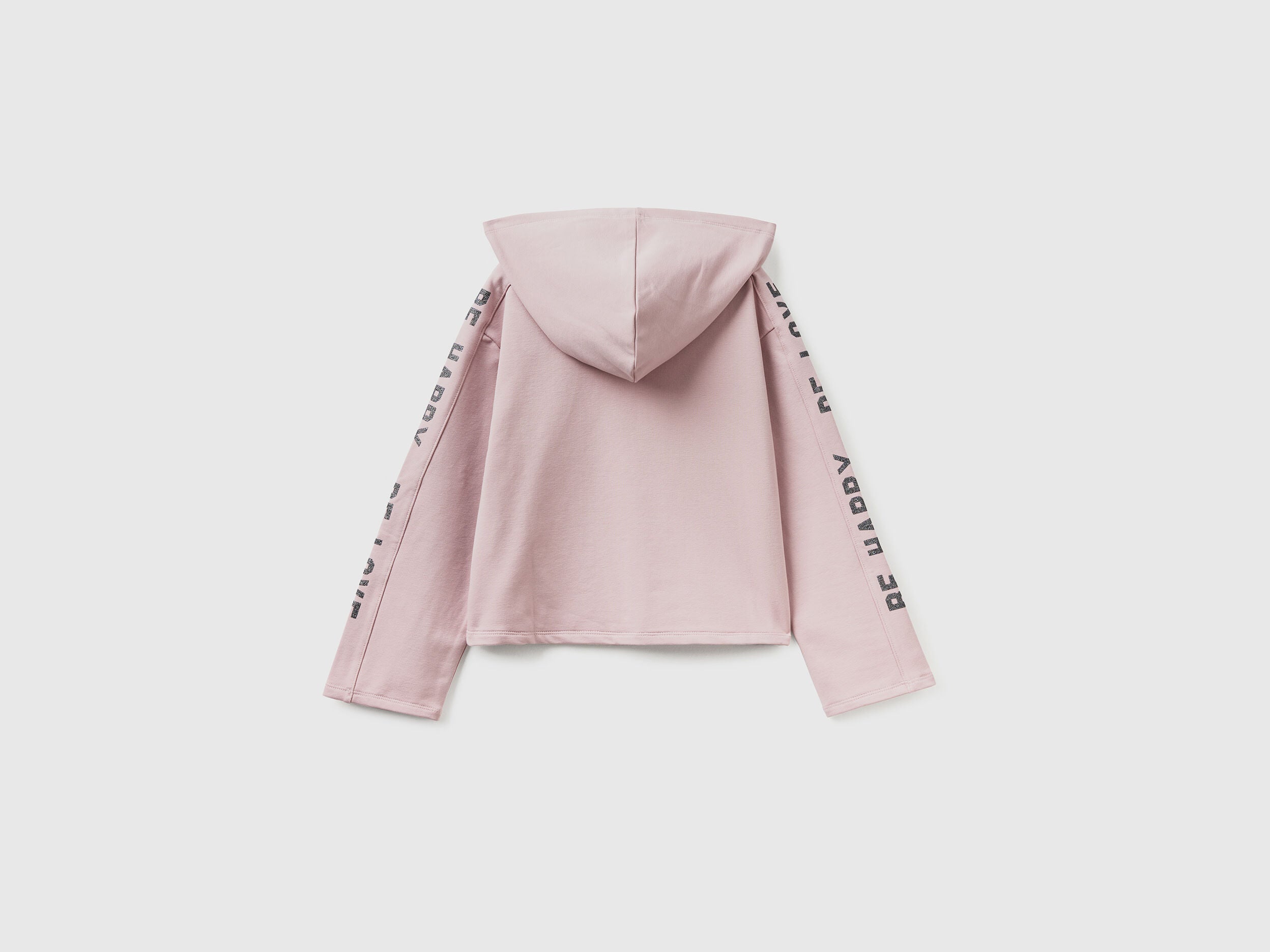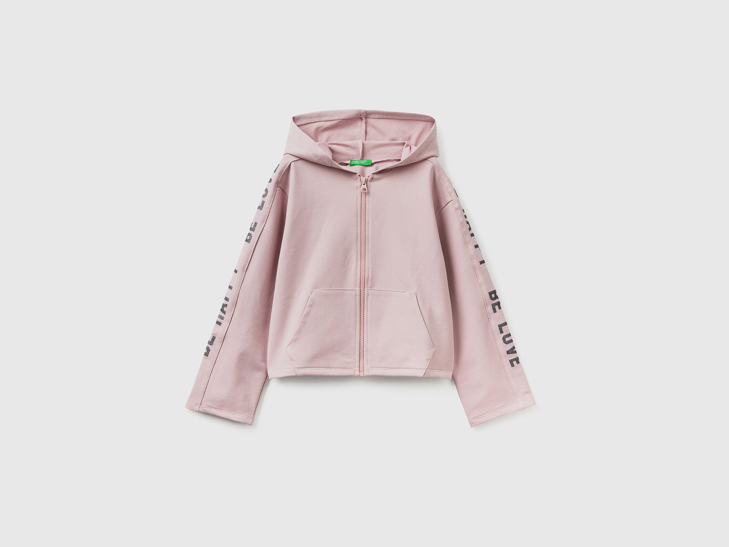 Hoodie with boxy fit in warm stretch cotton. Slogan print with glitter along the sleeves, zip opening and front patch pockets. For sporty and cool looks.