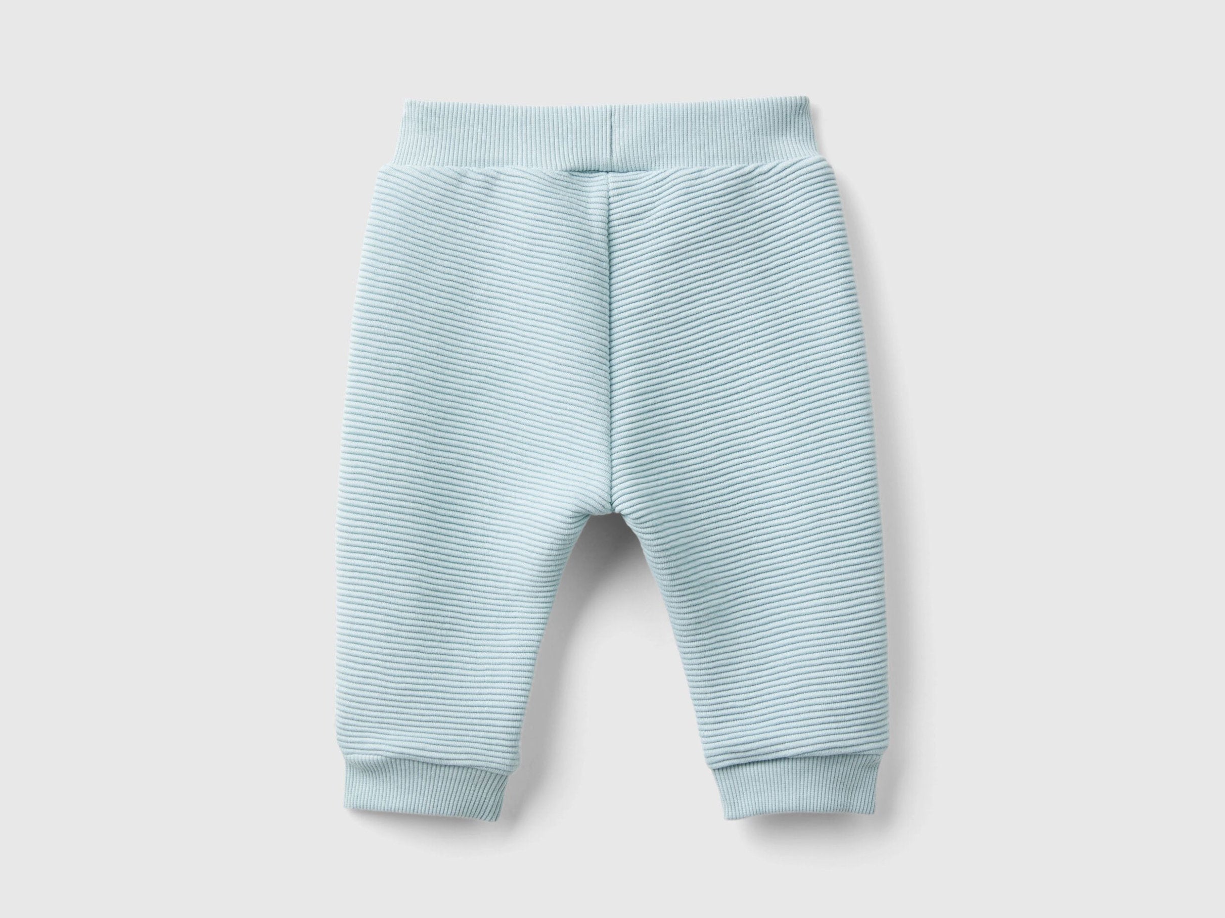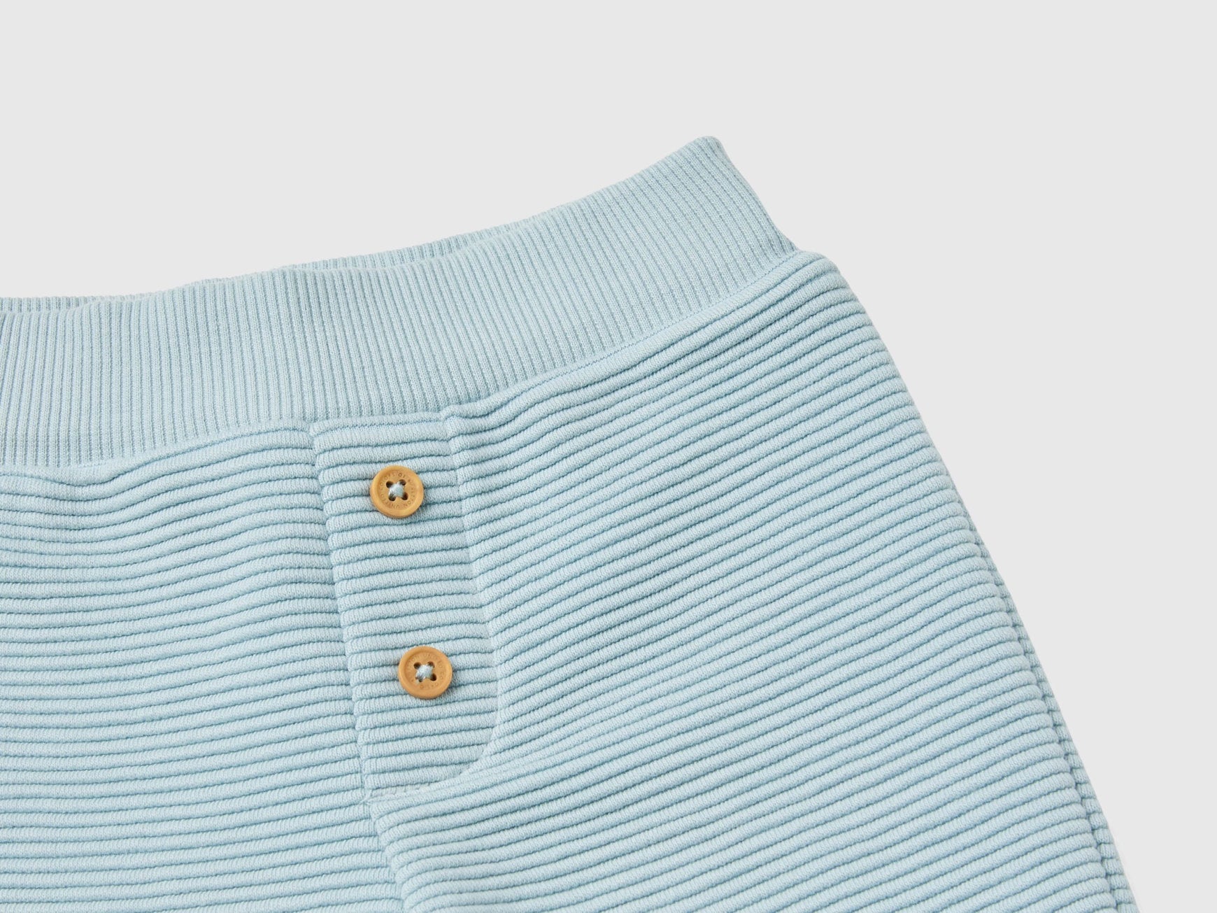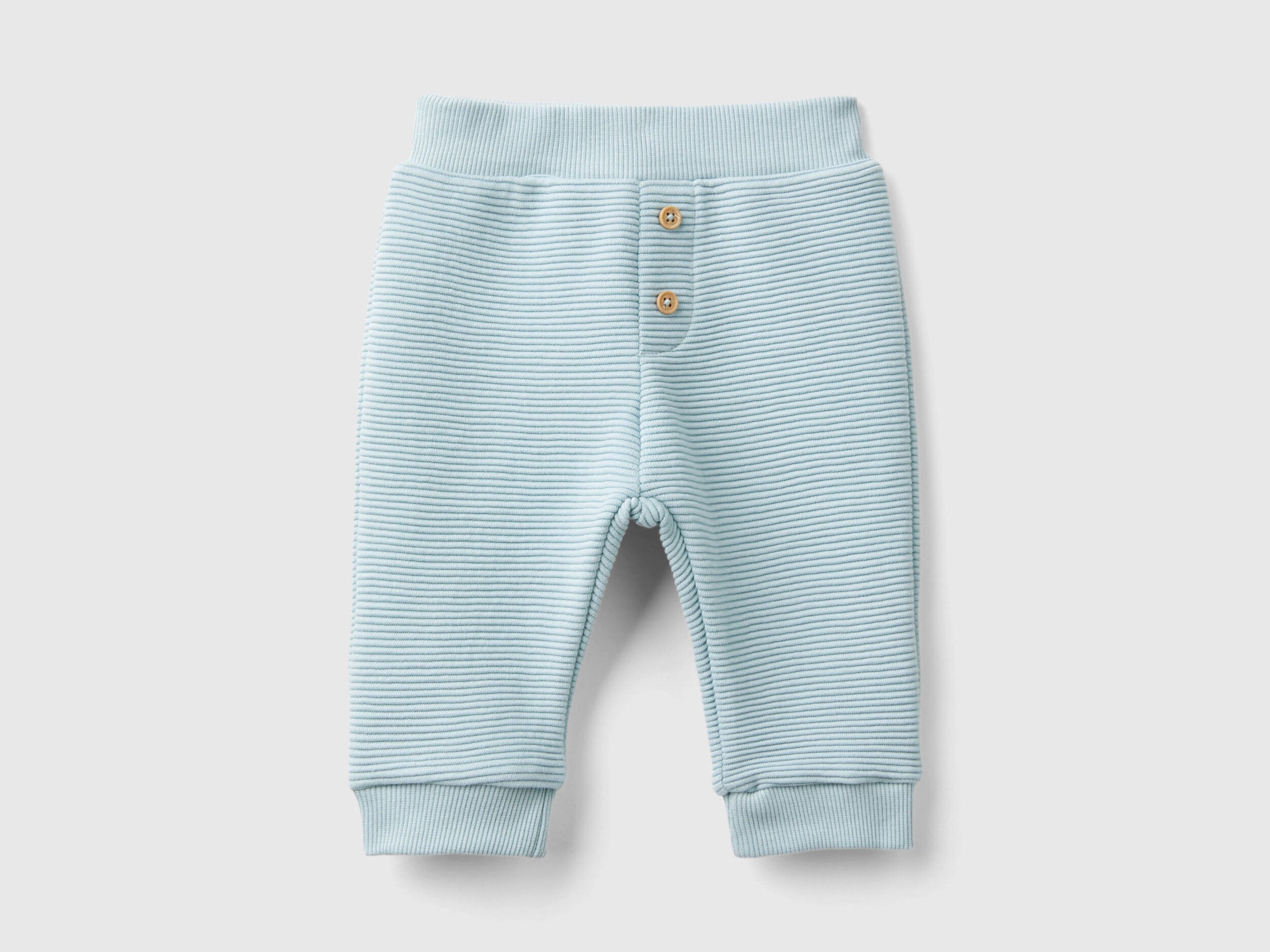 Long trousers in ribbed cotton blend with a warm feel. Internal elastic waistband, mock flap with wood effect buttons. Soft, comfy and delicate on the skin.
