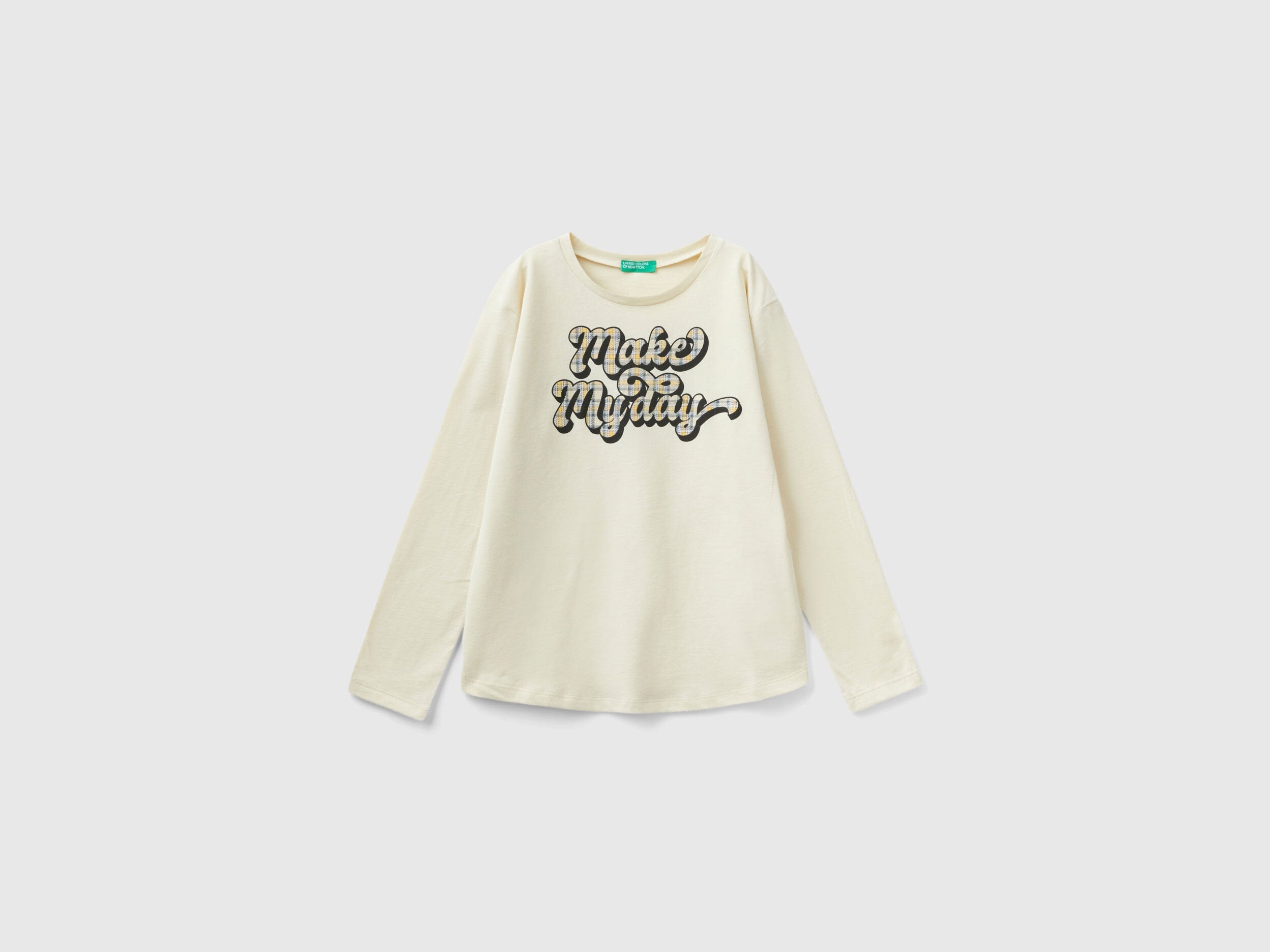Long sleeve t-shirt in warm pure cotton. Round neckline, rounded bottom and glittery text print on the front. Sparkling and feminine, for everyday outfits.