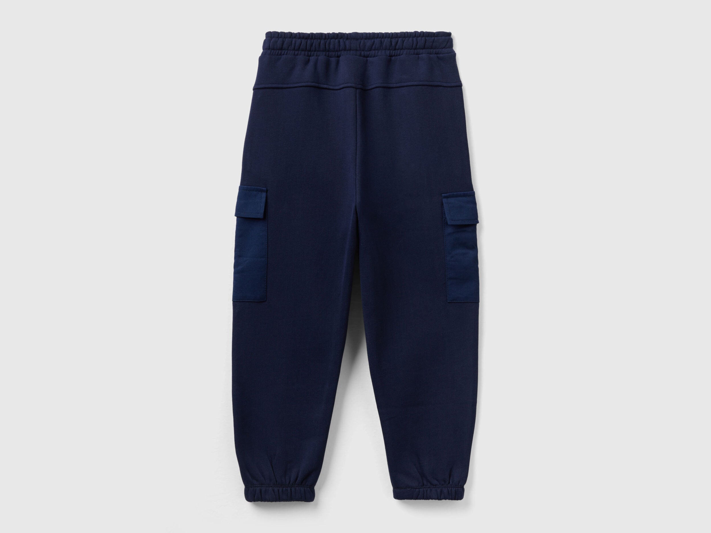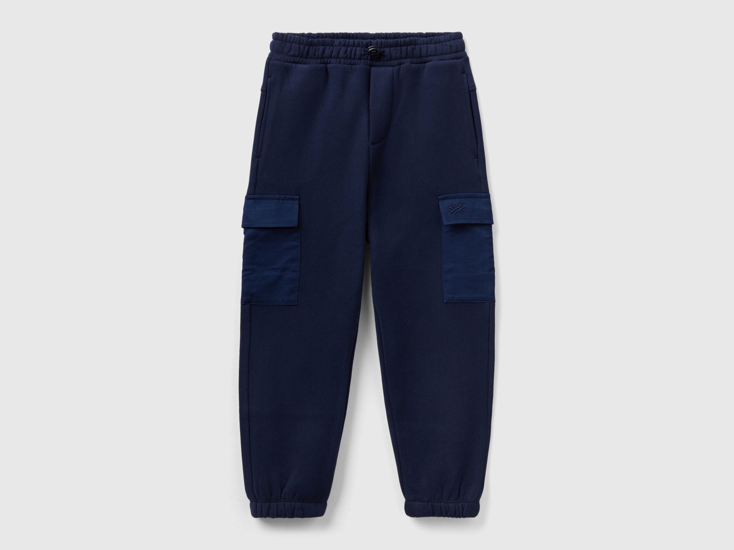 Long sweatpants in warm cotton blend. Loose fit, elastic waist with drawstring and cord stoppers. Pockets inserted into the sides and large patch pockets with flap on the side, logo embroidered on the left pocket. Cool and sporty attitude.