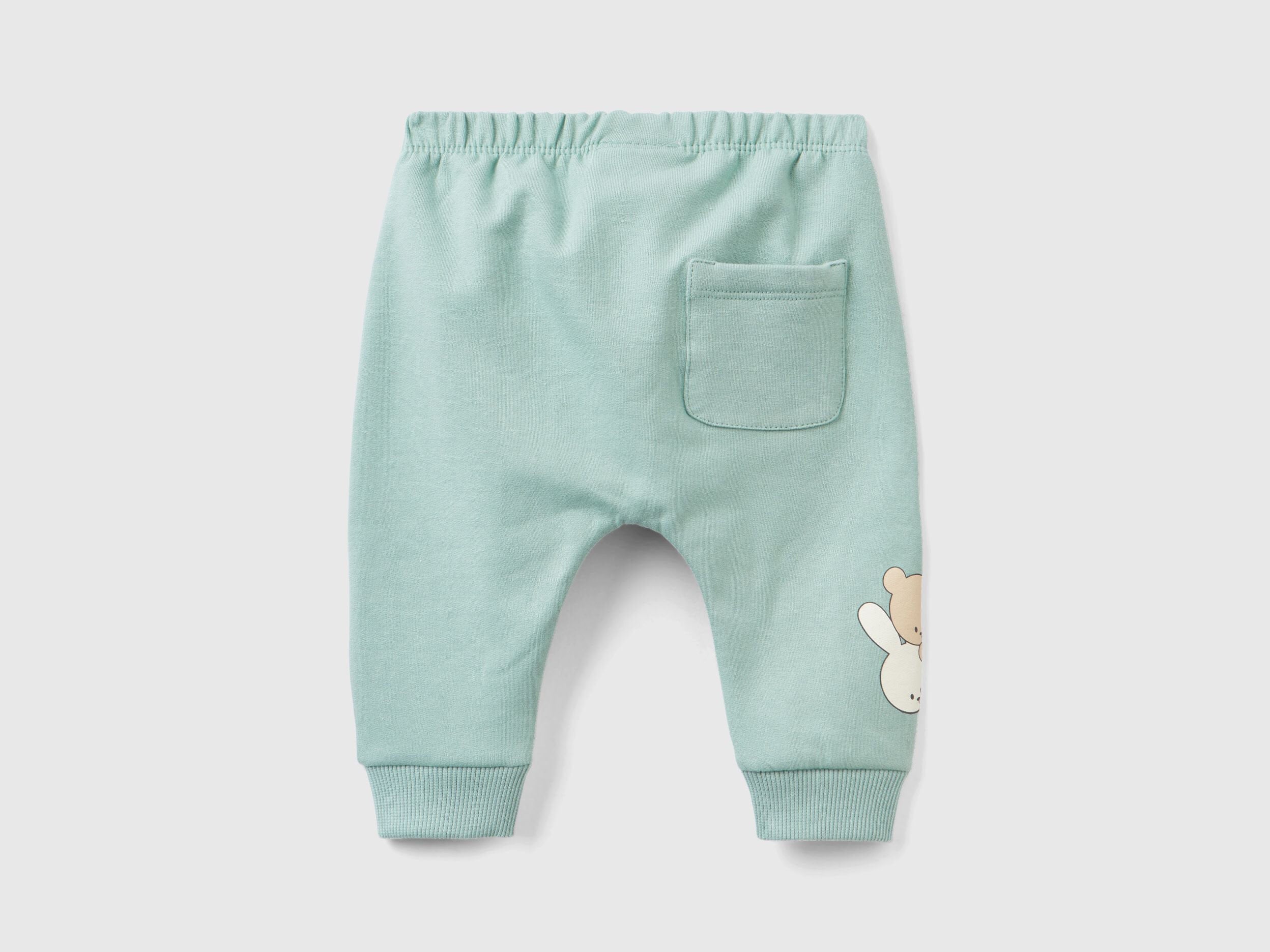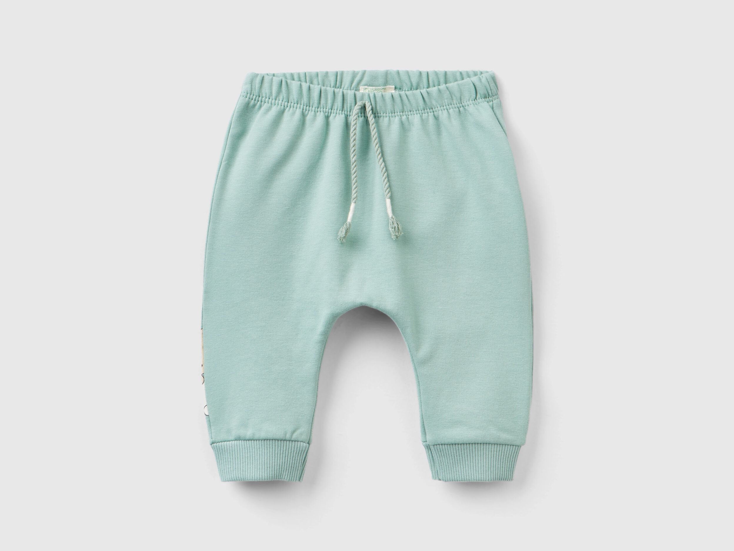 Long trousers in stretch cotton blend fleece with a warm feel. Inner elastic and decorative drawstring with tassels at the waist. Animal print along the back of the right leg and back patch pocket. Comfortable and easy to match.