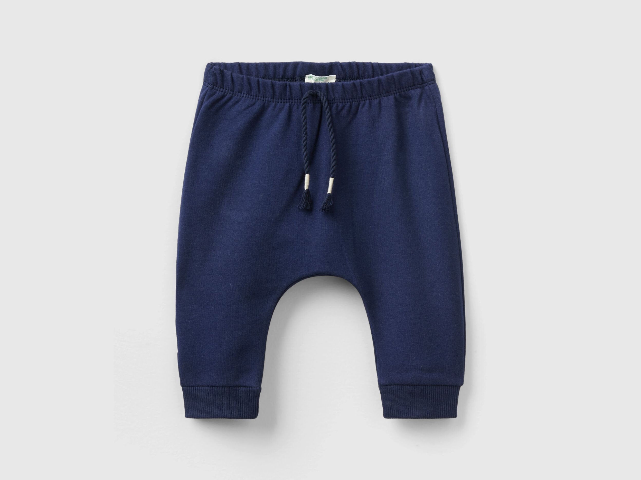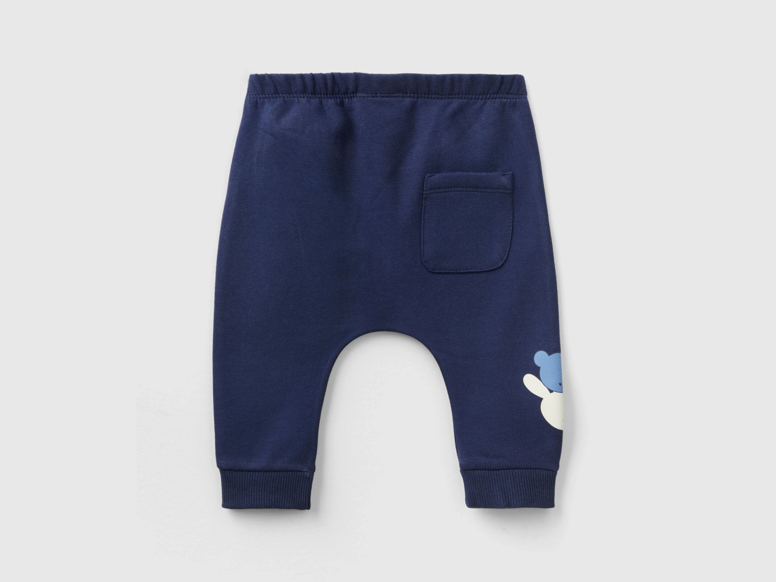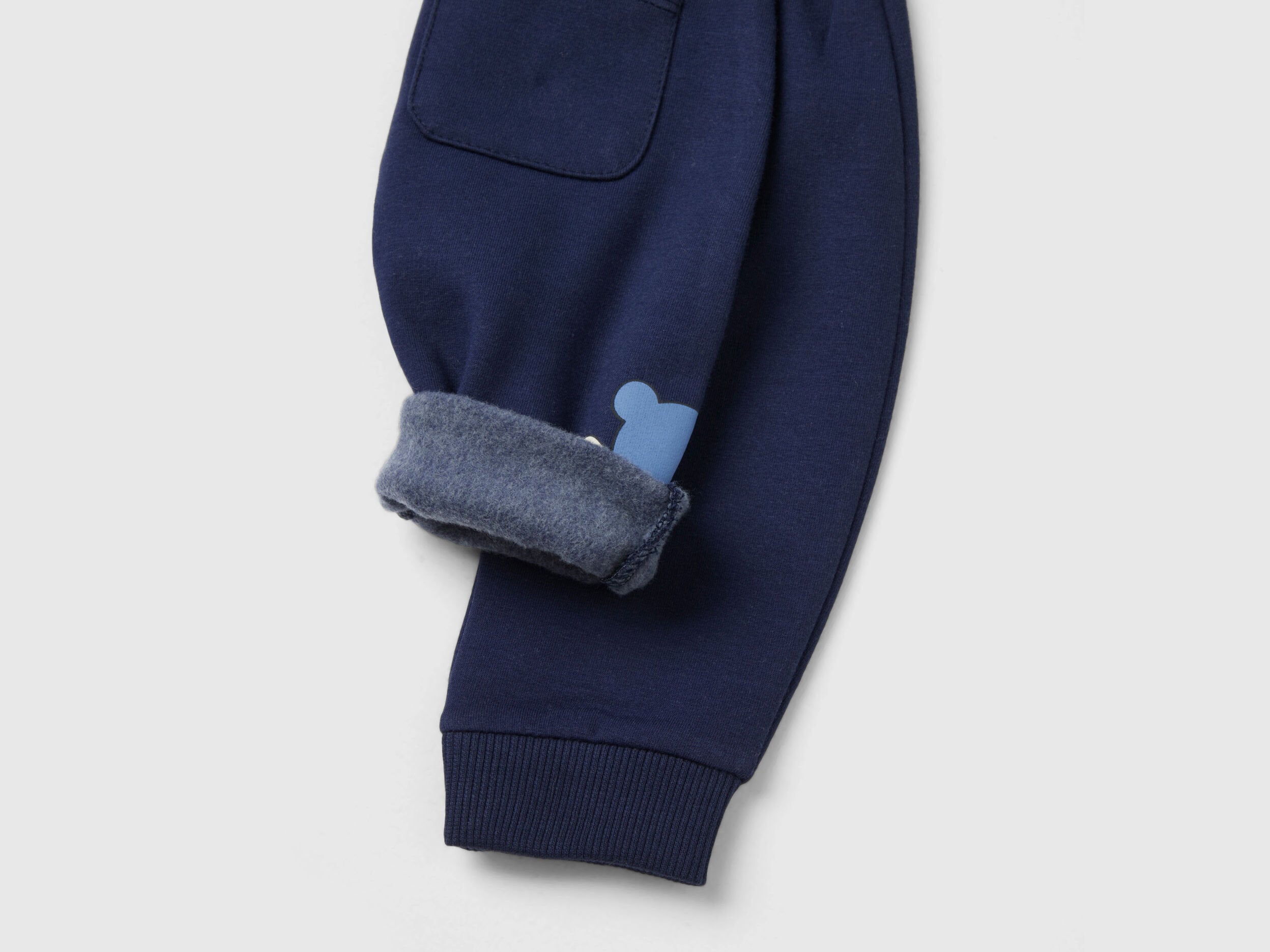 Long trousers in stretch cotton blend fleece with a warm feel. Inner elastic and decorative drawstring with tassels at the waist. Animal print along the back of the right leg and back patch pocket. Comfortable and easy to match.