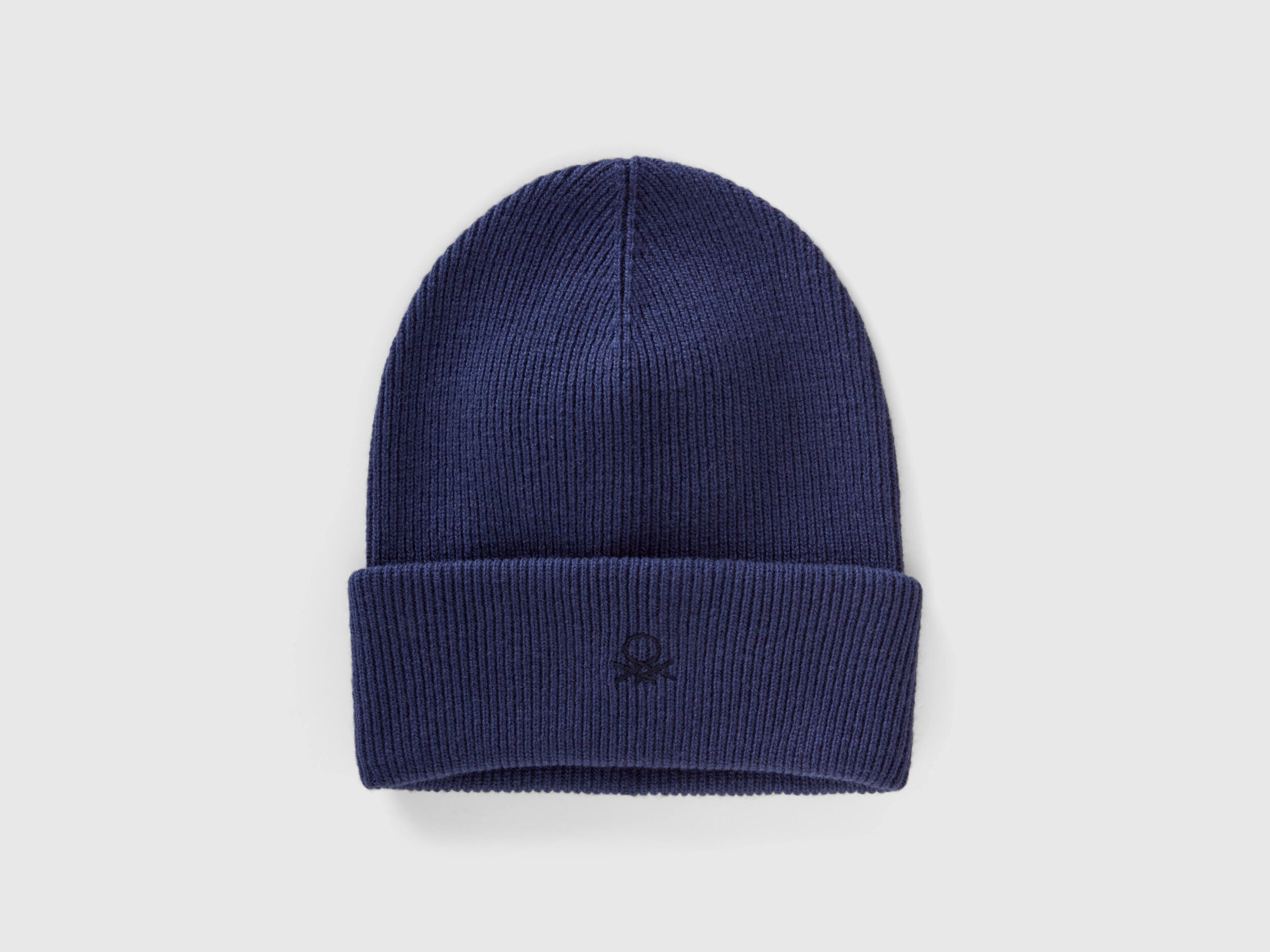 Cap in soft wool blend yarn. Ribbed knit and logo embroidered on the front flap. An "Easy Care" accessory that can be machine-washed.
