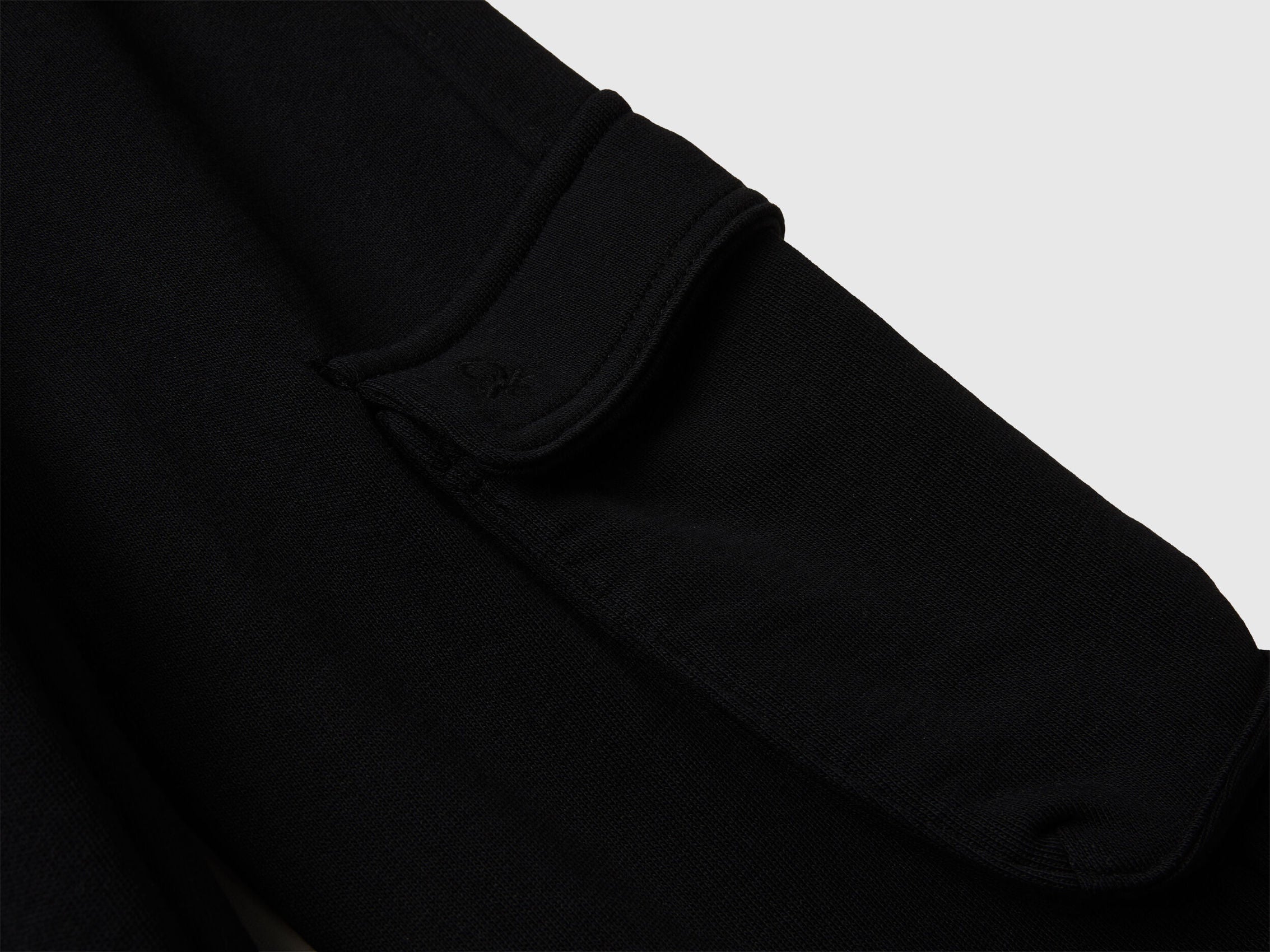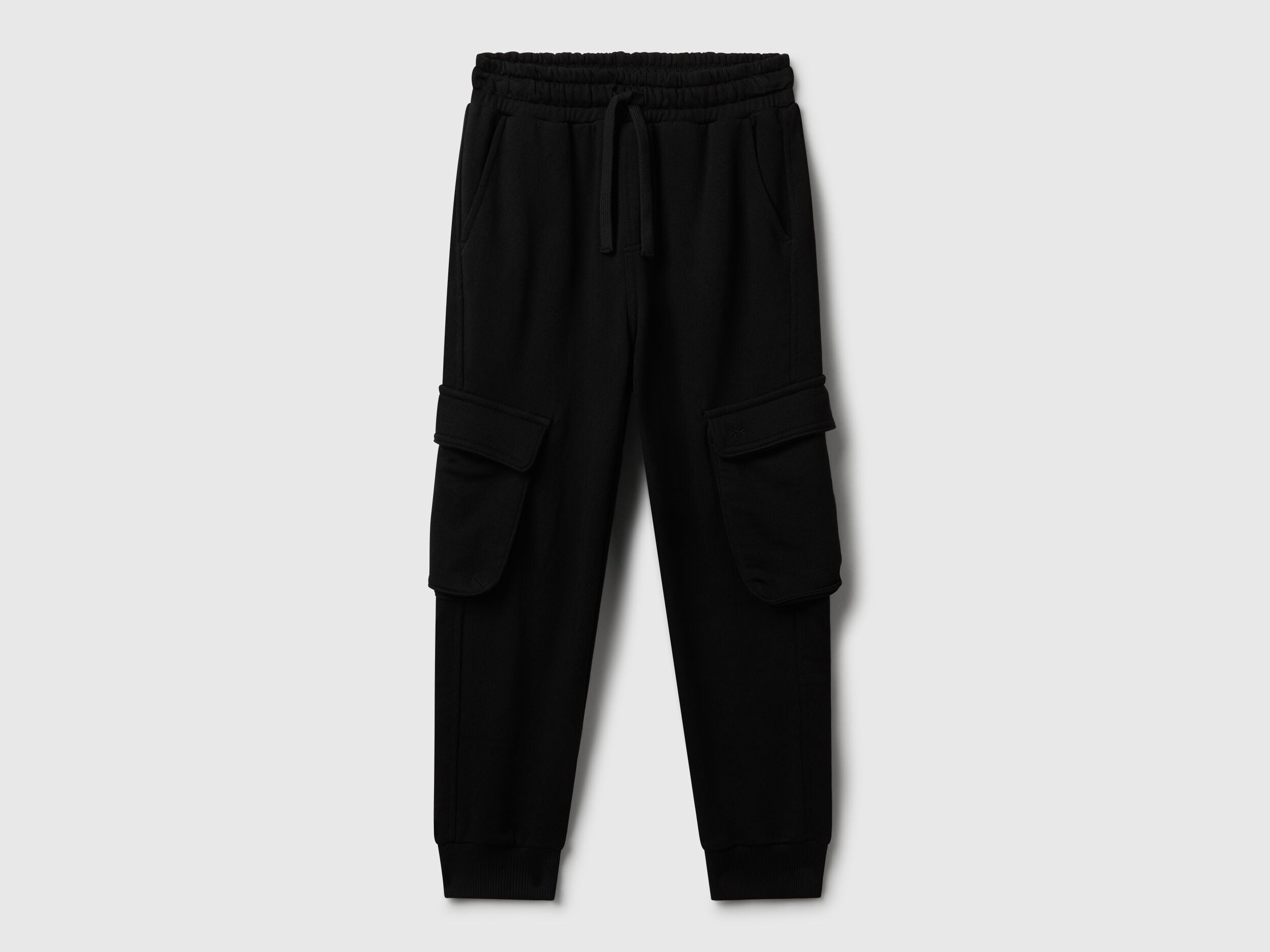 Long trousers in pure cotton sweat with consistent yet light feel. Stretch waist with drawstring, front pockets and side flap pockets. Cool and sporty attitude.