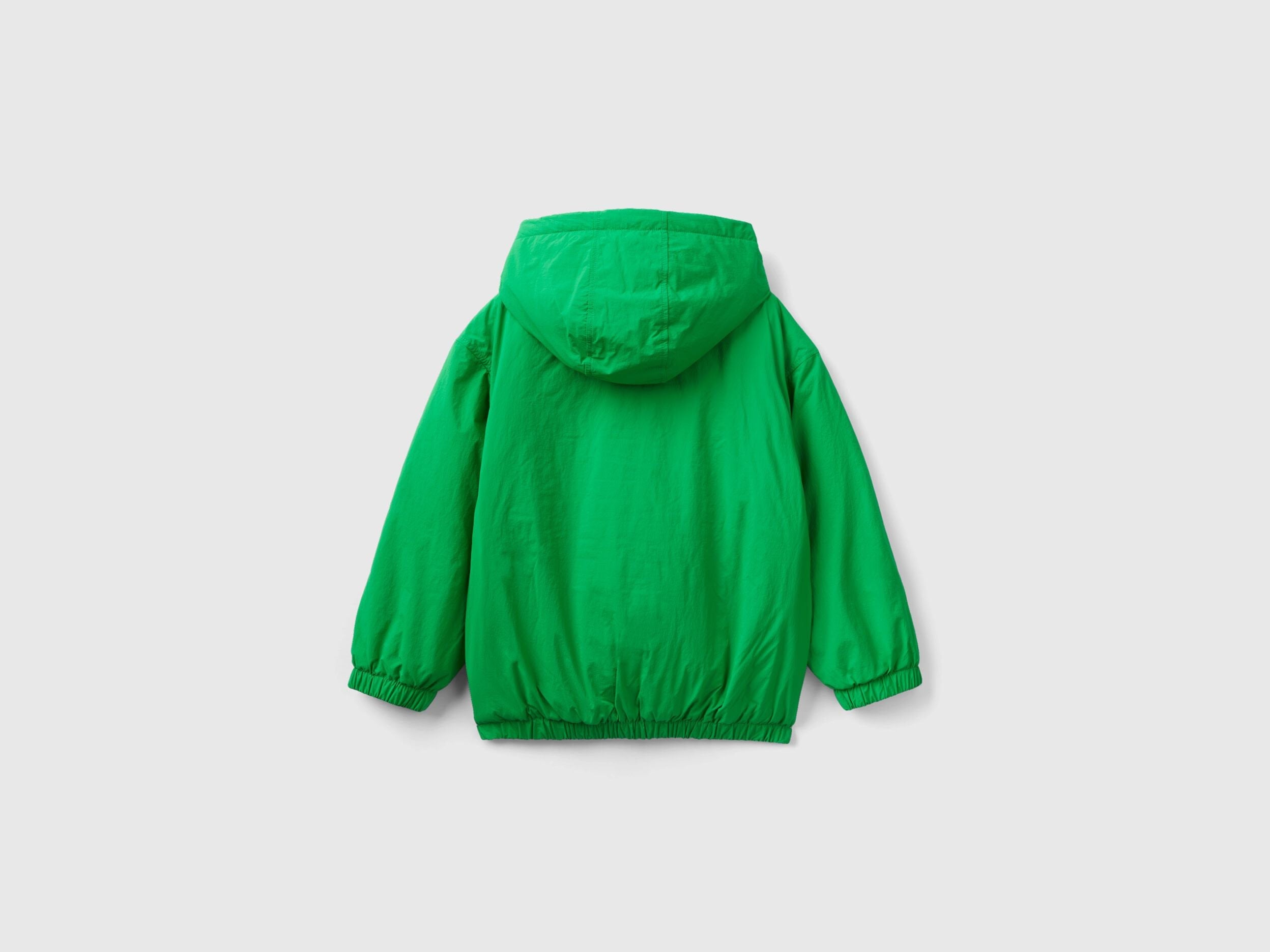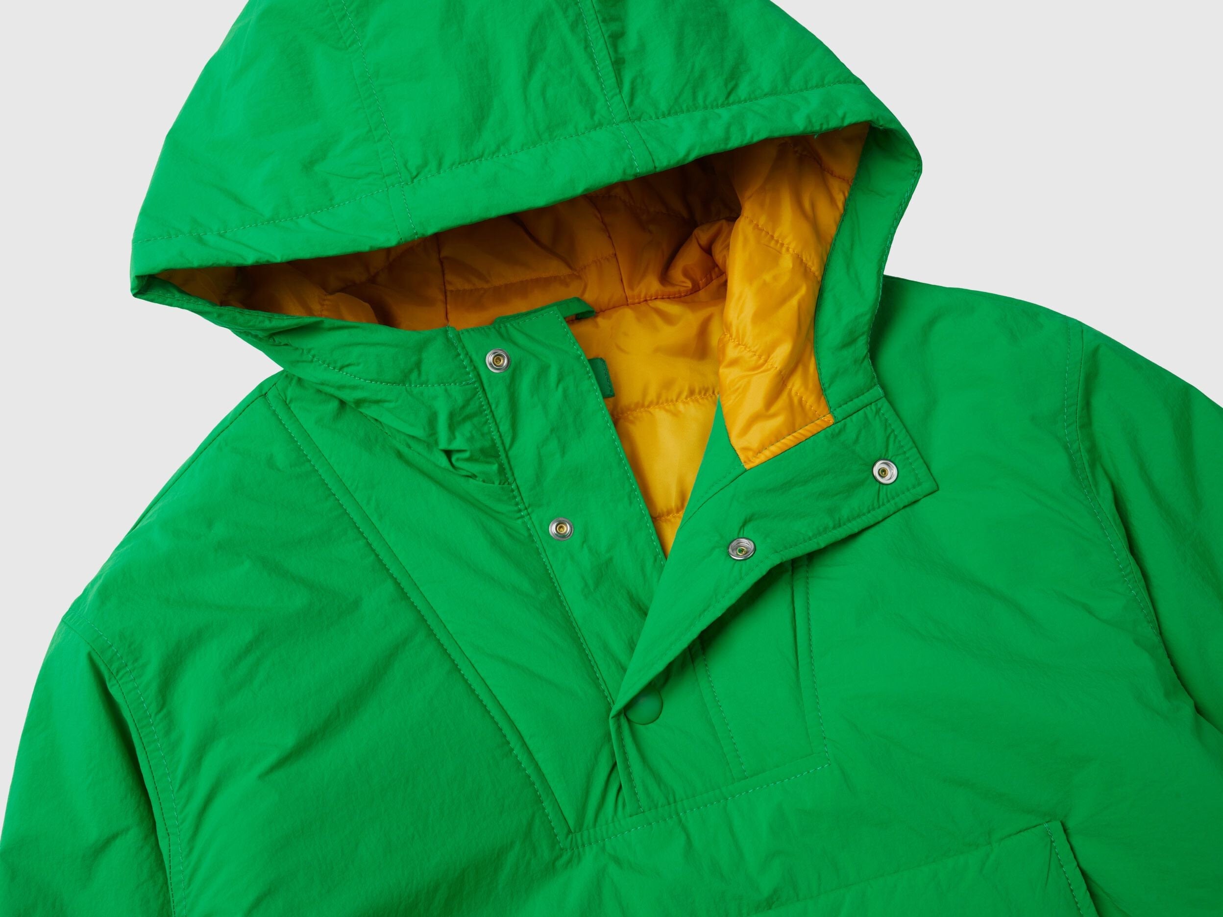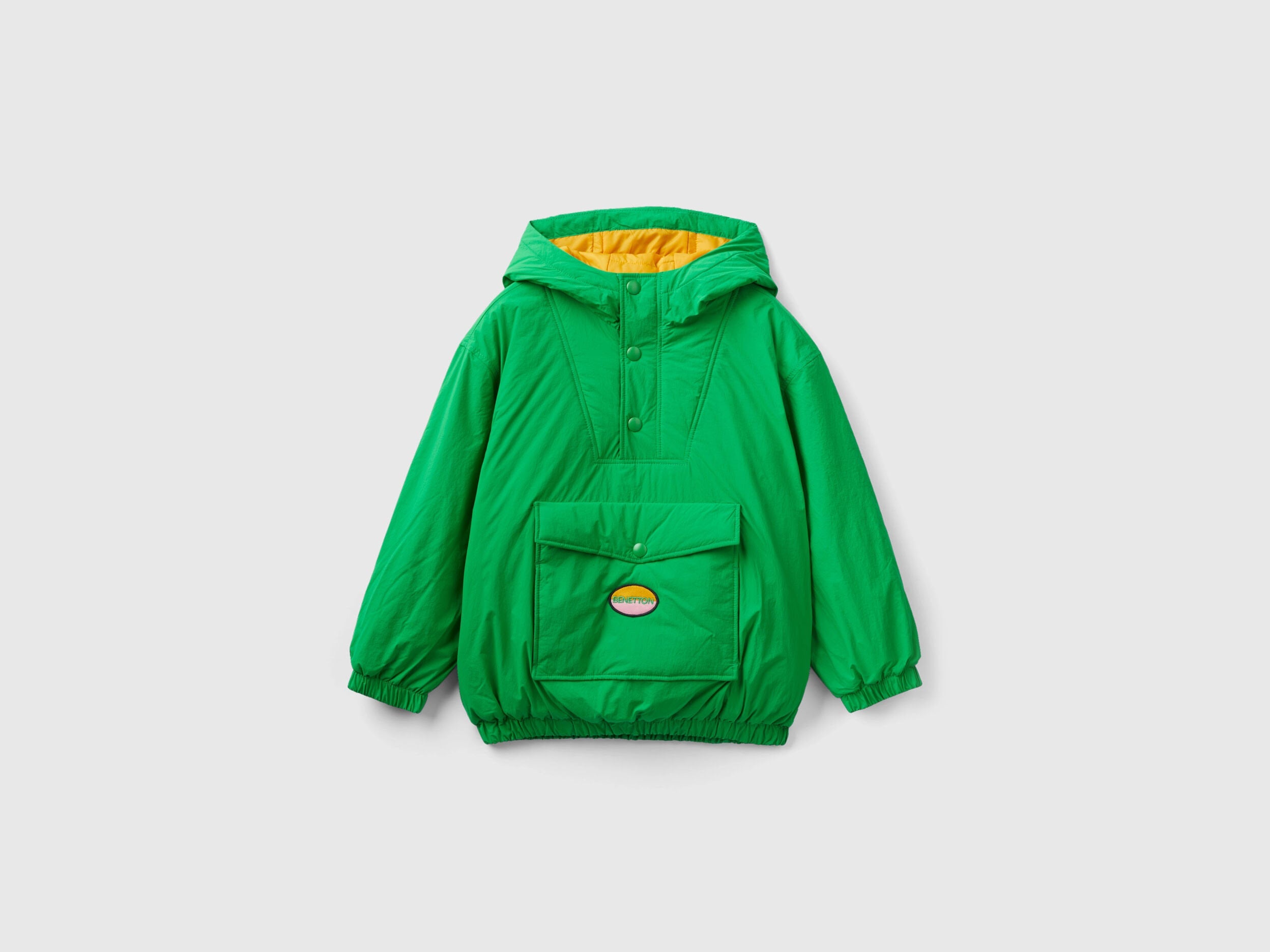 Jacket with hood in nylon with loose fit, warm yet lightweight padding. Partial snap button opening on front, maxi front pocket with button-closed flap and patch logo. Perfect for mid-seasons.