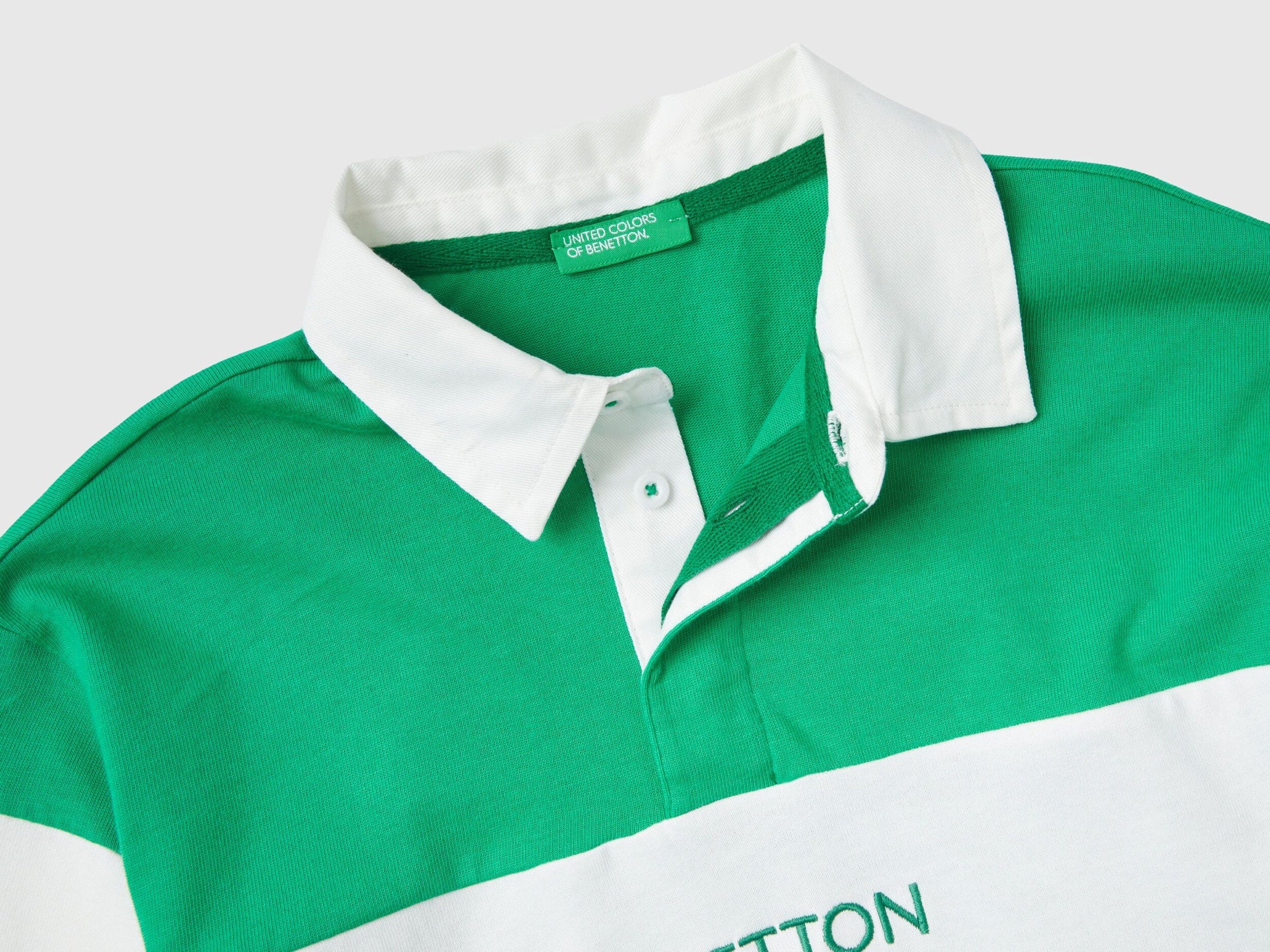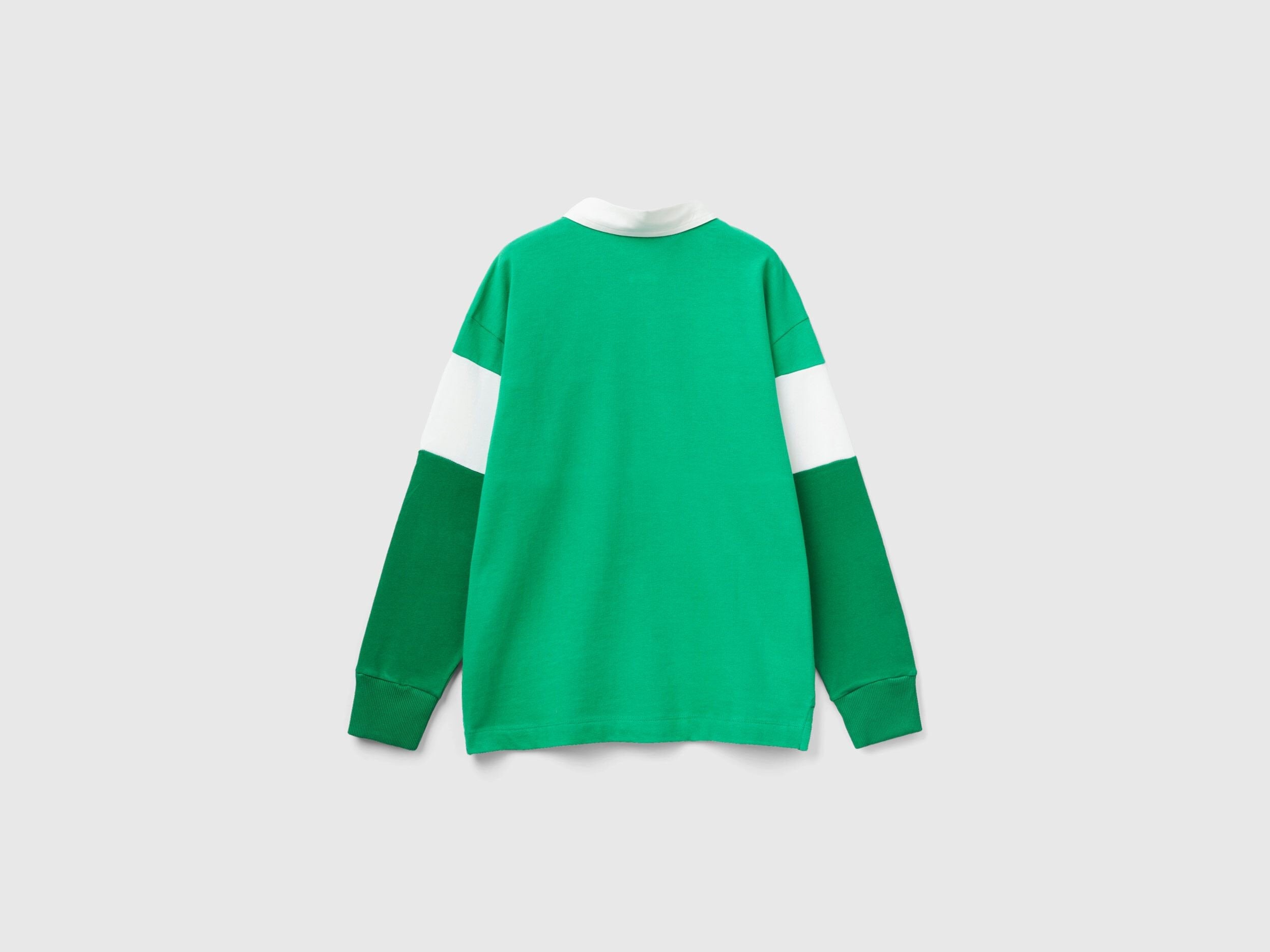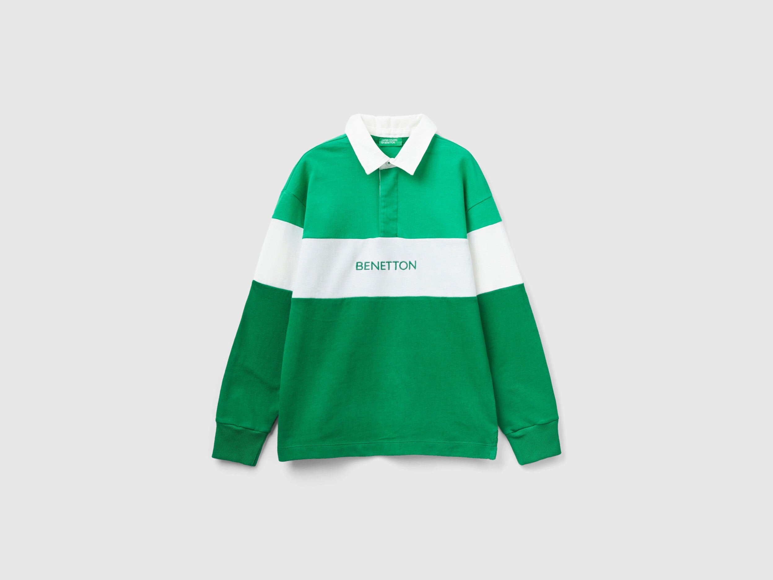 Long sleeve polo in pure yarn dyed cotton with a warm feel. Color block striped design, clashing insert on breast and on sleeves with embroidered logo at front center. Classic collar, partial hidden opening with buttons and side slits on the bottom. A classic of the casual wardrobe with pure Benetton style.