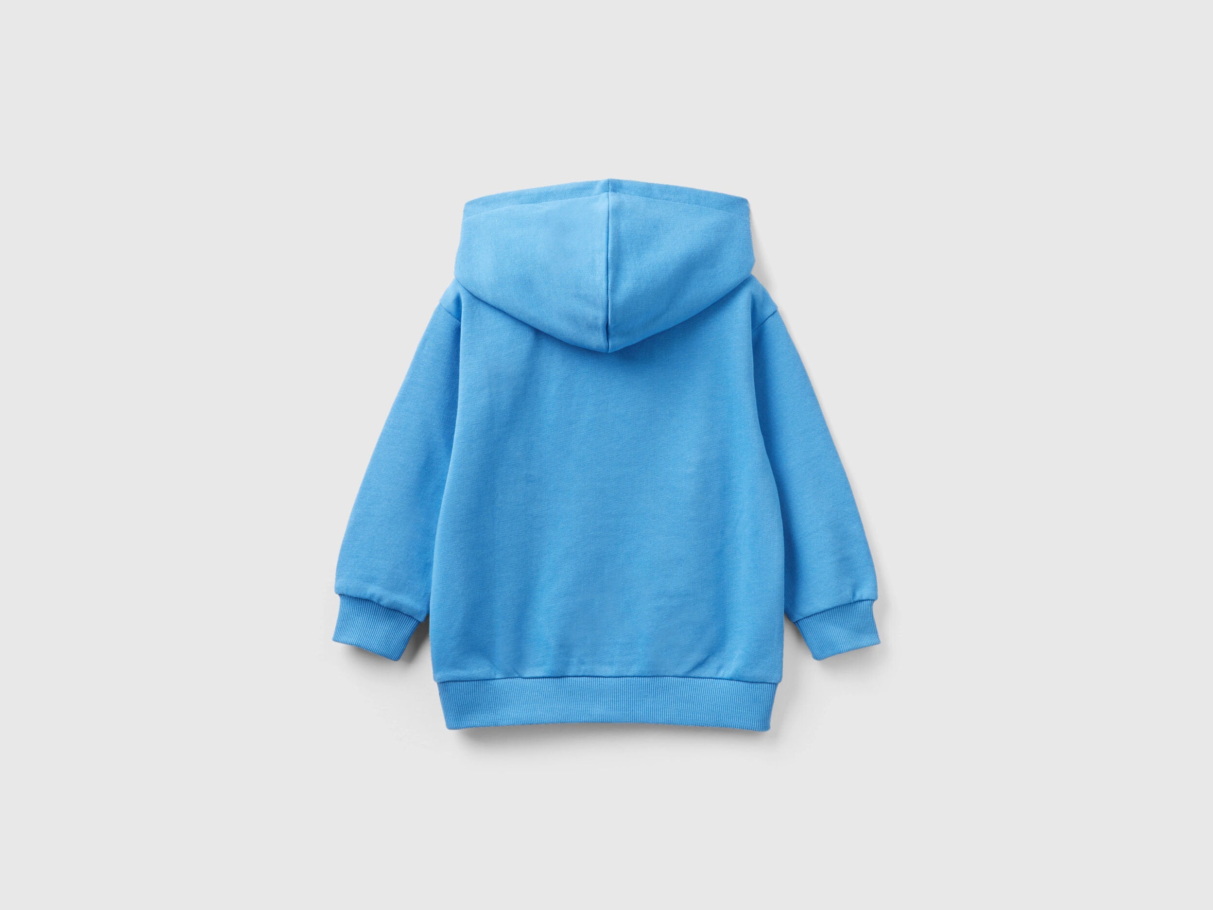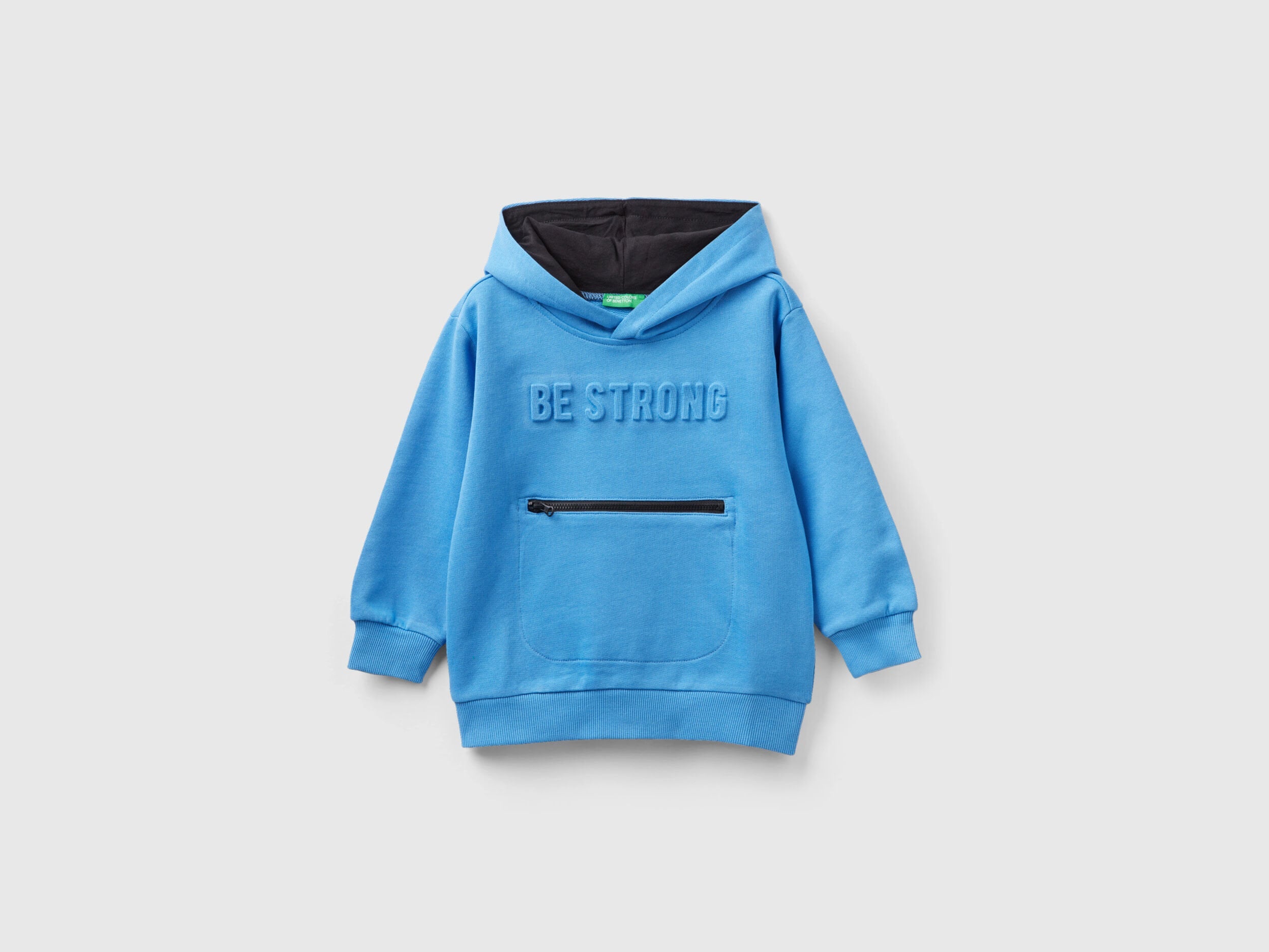 Pullover sweatshirt with hood in pure cotton with consistent yet lightweight feel. Long sleeves, patch pocket with zip on the front, with text print. Street style for dynamic and everyday looks.