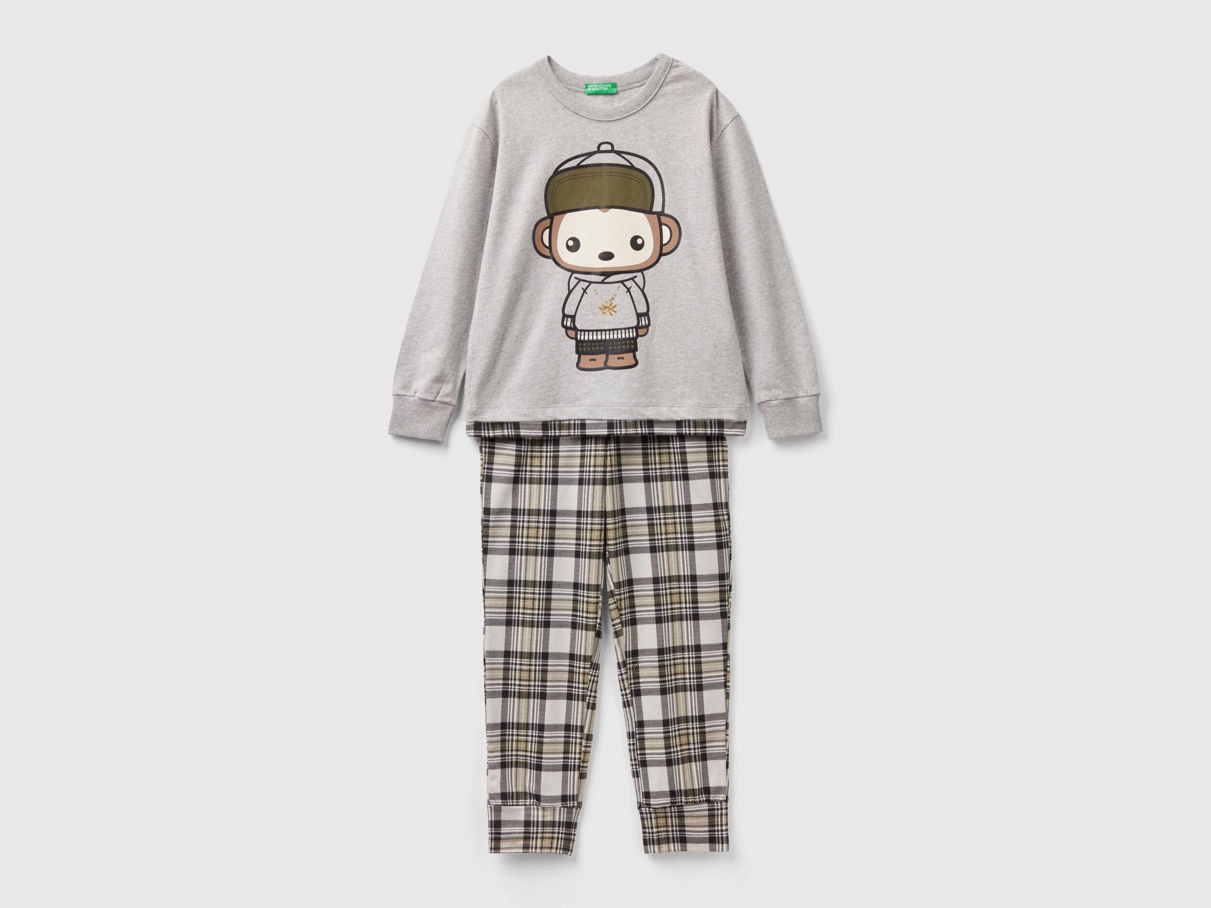 Long pyjamas in medium weight pure cotton with a warm feel. Long sleeve crew neck sweater with mascot print on the front. Bottom detail of shirt and long regular fit trousers in multicolor tartan check printed fabric.