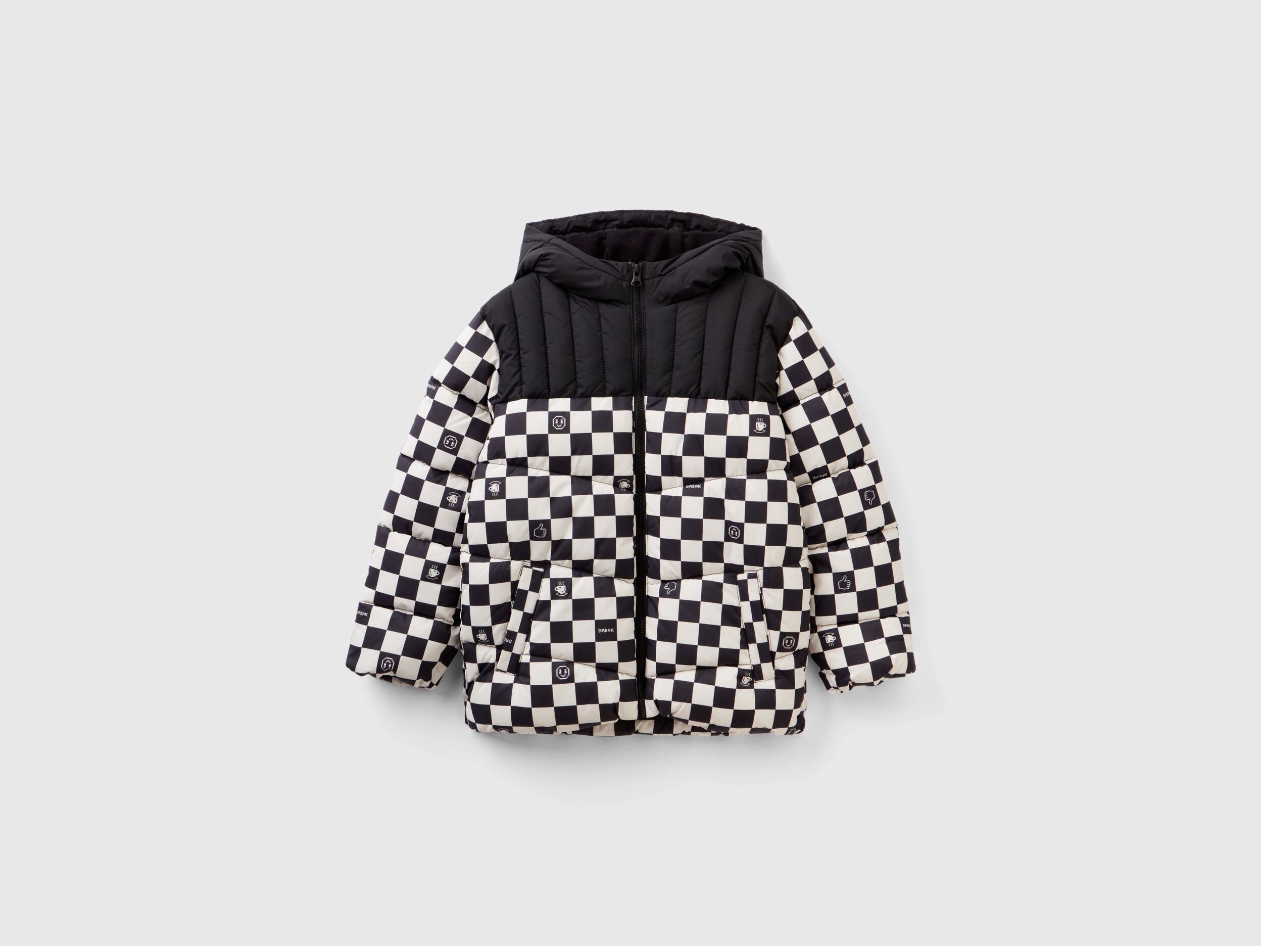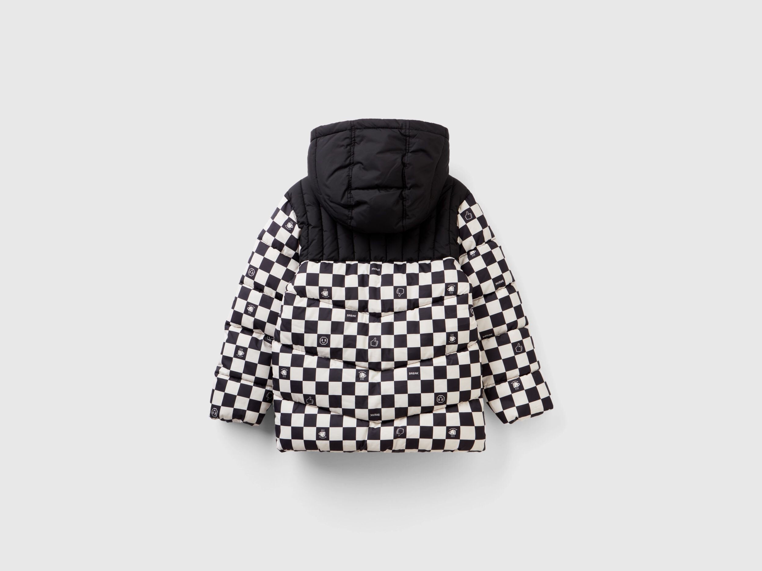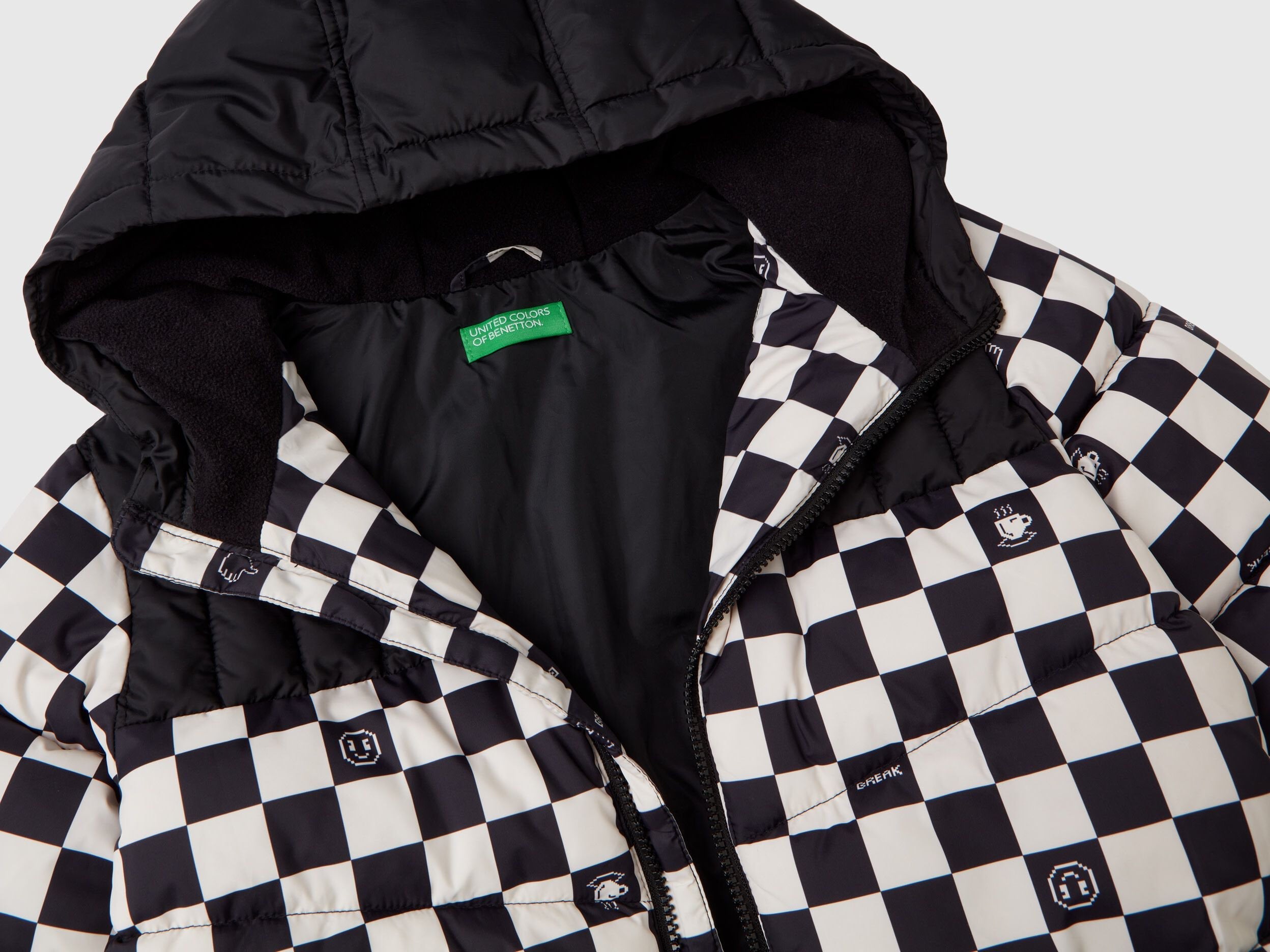 Padded jacket in "Rain Defender" technical fabric, warm yet ultra-light, with "Duck Free" padding. Hood and yoke in solid color, black and white check print on the rest of the piece. Lined hood in soft fleece, zip closure, and practical front pockets. An "Easy-Care" piece that can be machine-washed and dried, following the instructions listed on the label.