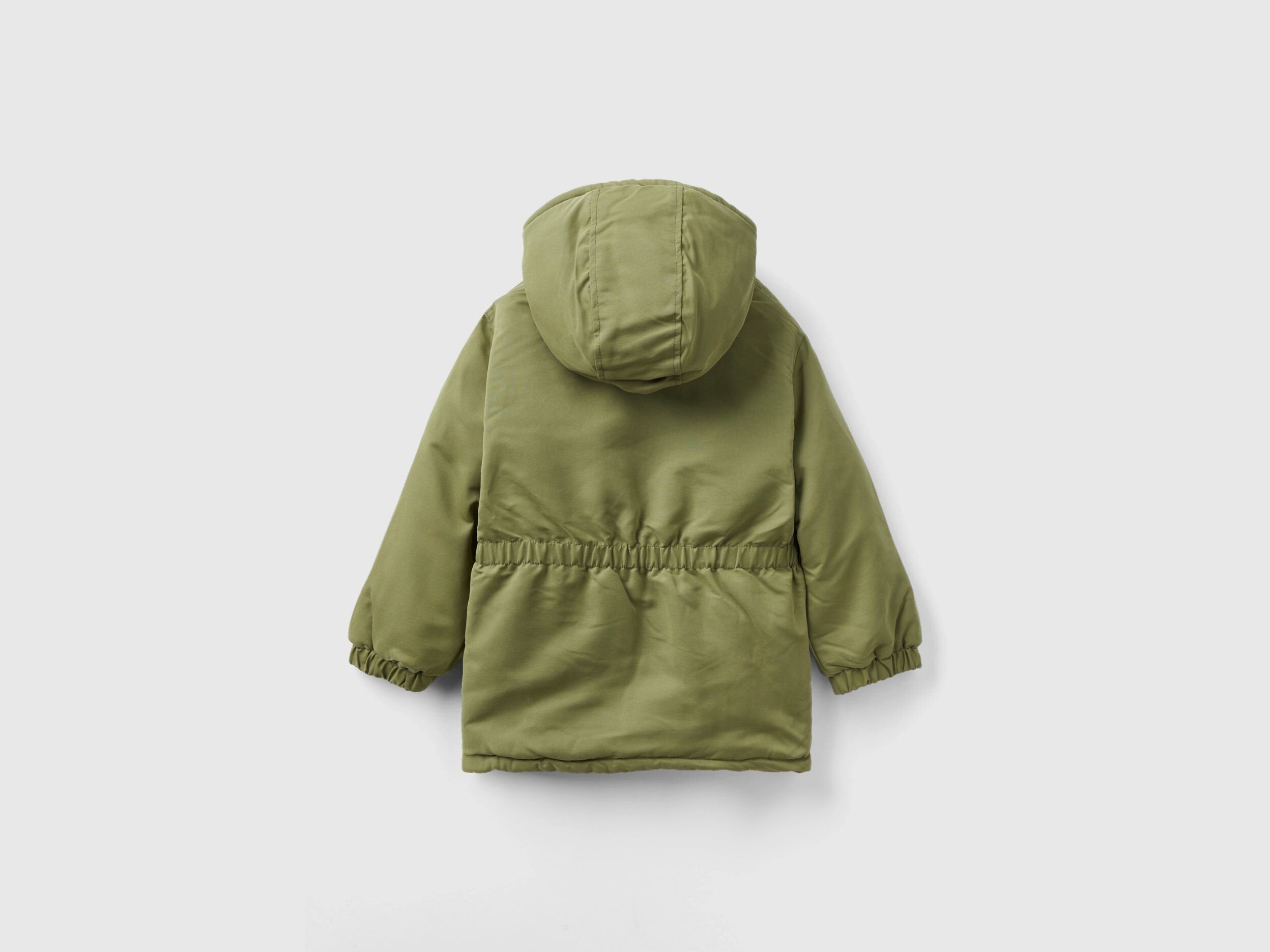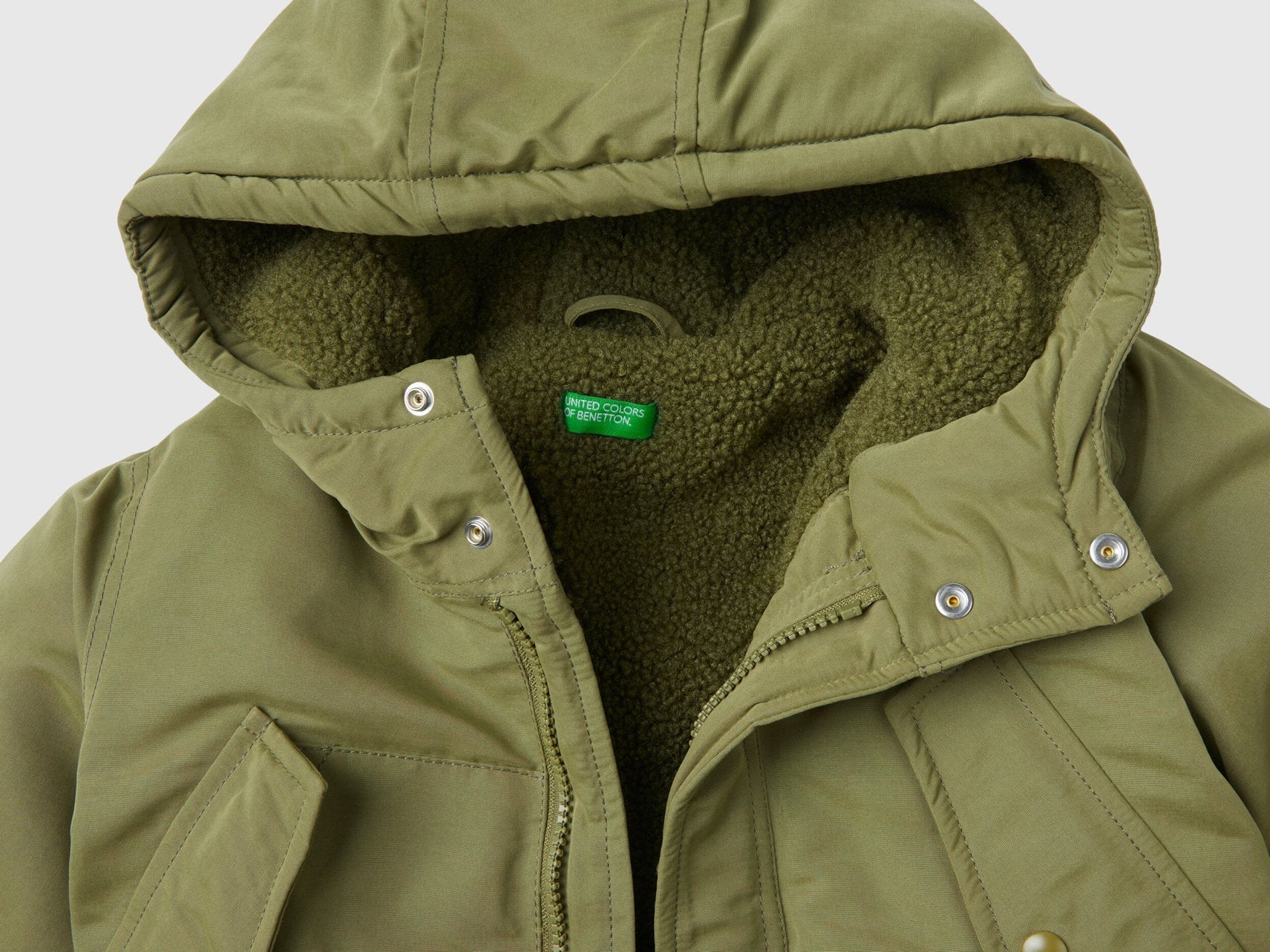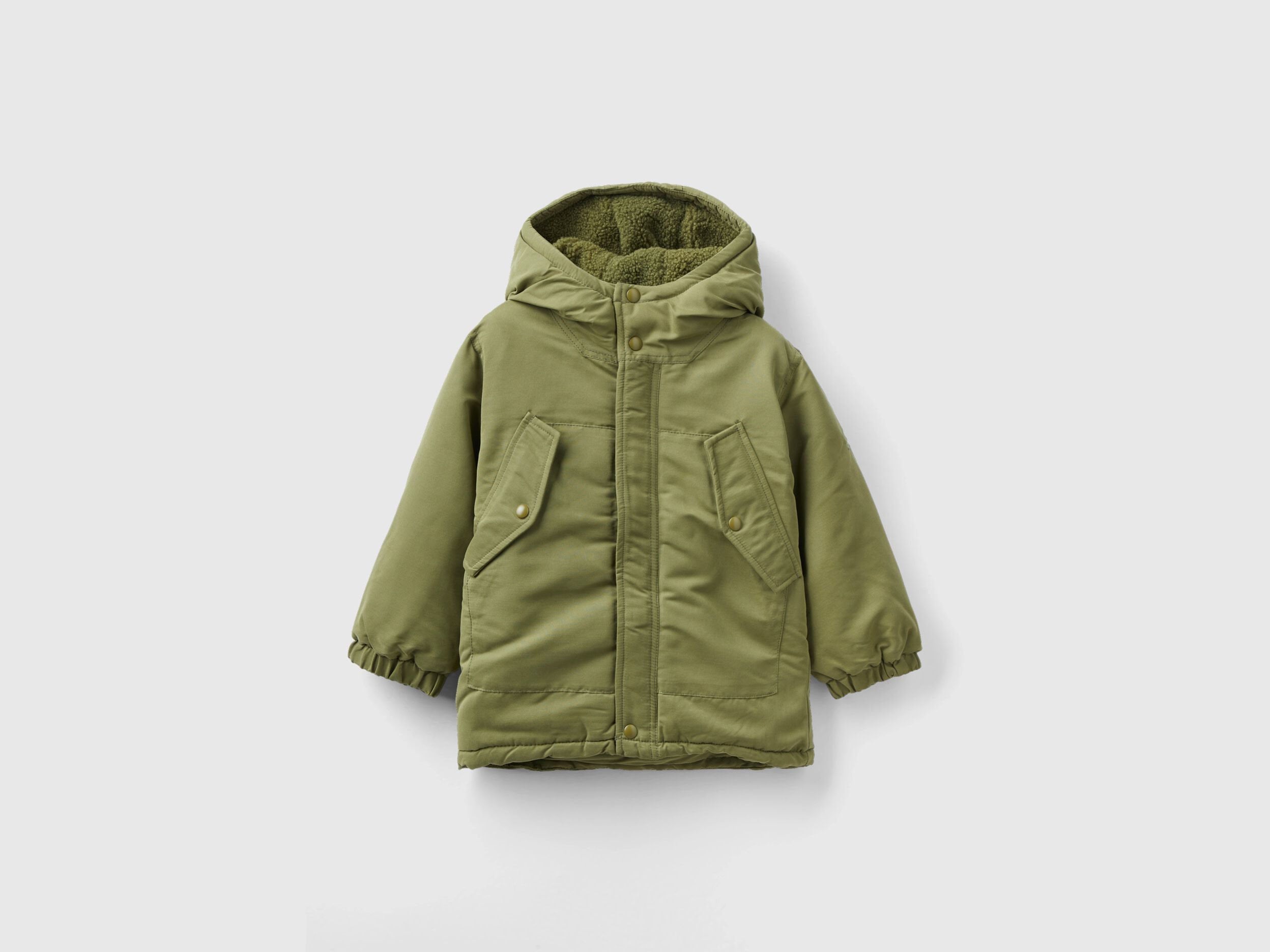 Parka model padded jacket made of warm "Rain Defender" nylon and lined with faux fur. Equipped with a hood, hidden zipper and snap button opening. Large pockets with flap and button applique on the front, embroidered logo on sleeve. Warm and functional, perfect to protect you from the cold.