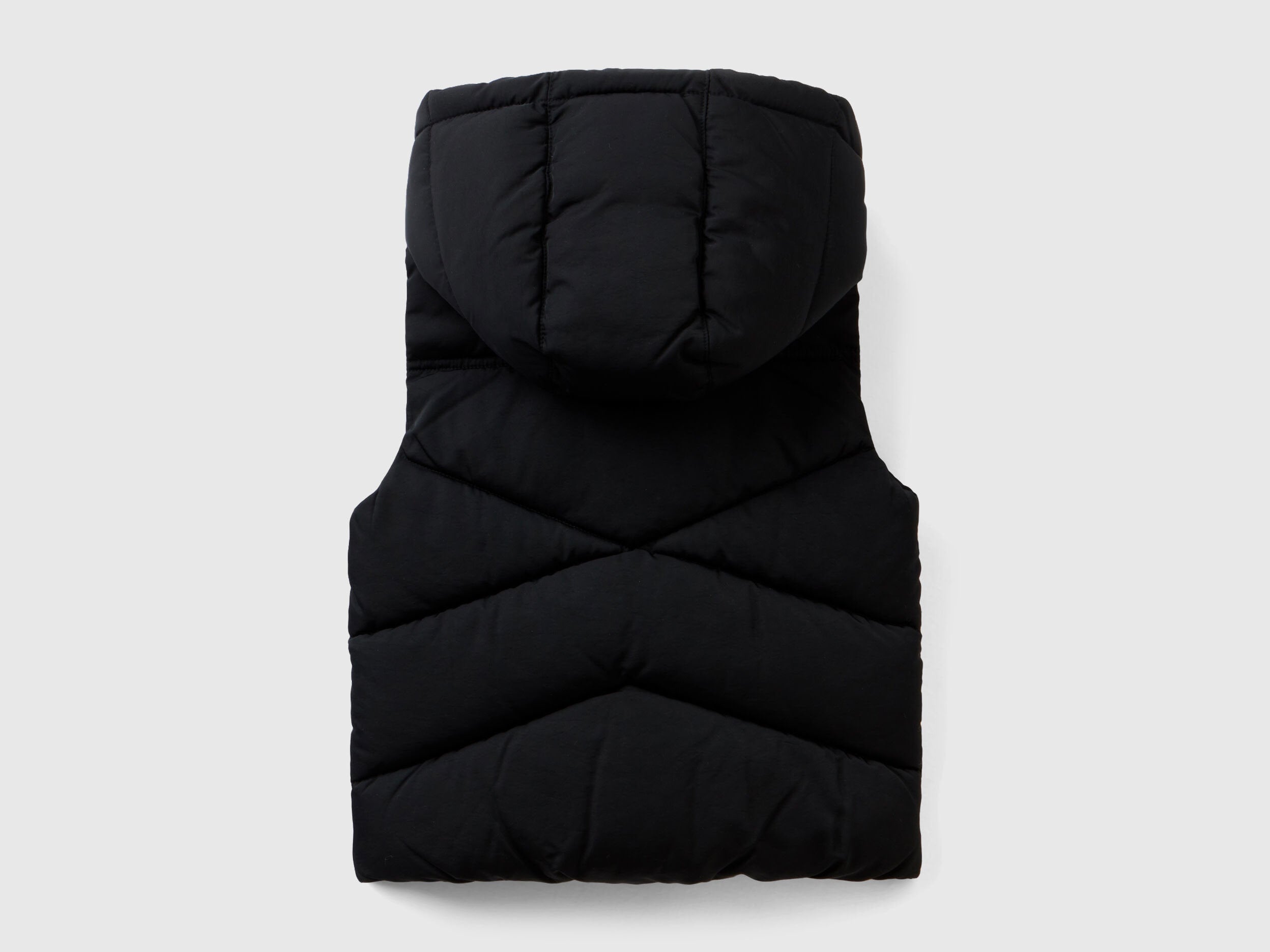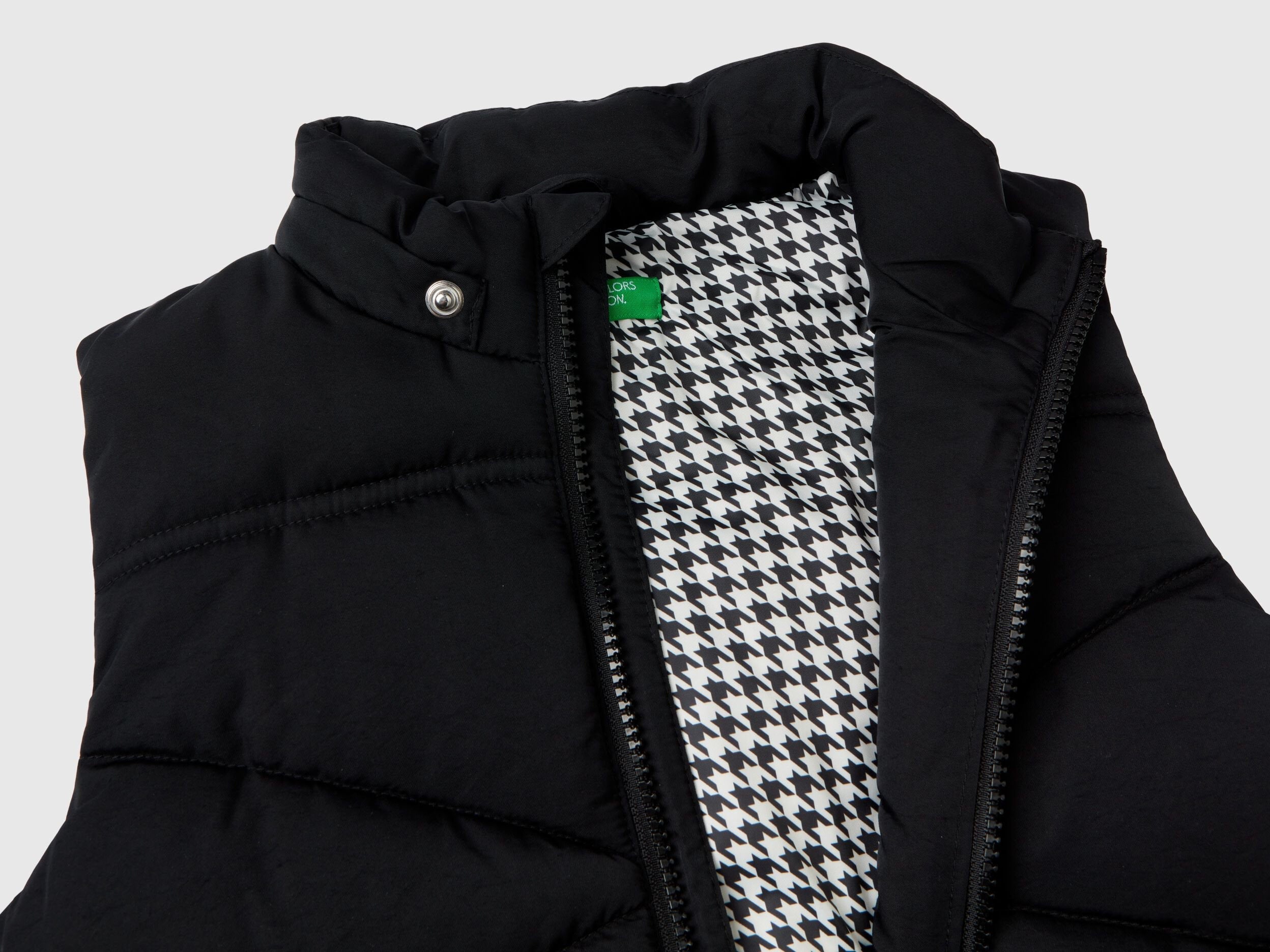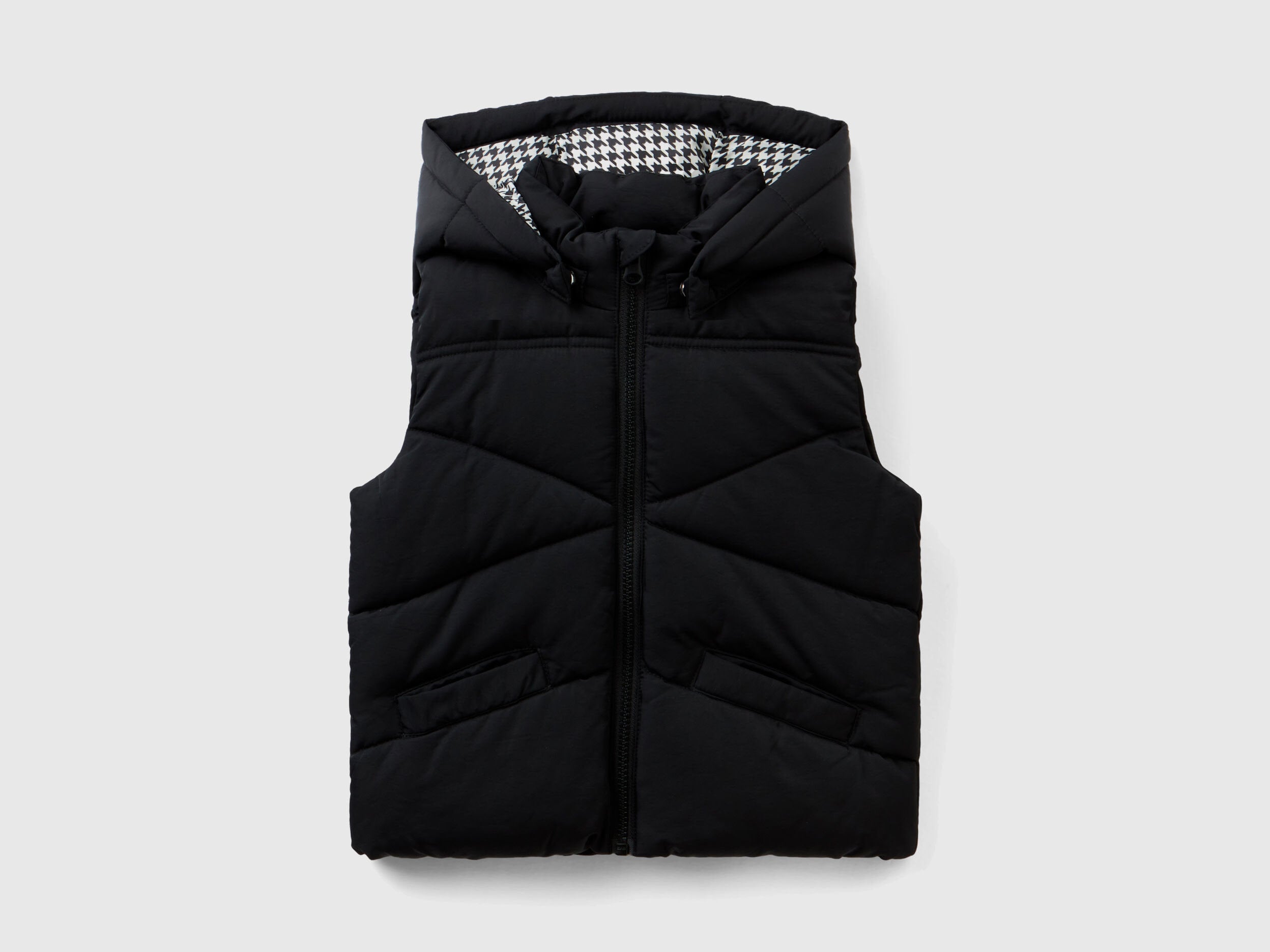 Sleeveless padded jacket in technical "Rain Defender" fabric with loose fit. Warm yet ultra light, suitable for even the chilliest months, with "Duck Free" padding in 3D wadding that always resumes its shape. Equipped with hood lined with houndstooth pattern print, front zip opening and welt pockets. An "Easy Care" piece that can be machine-washed and dried, following the instructions listed on the label.