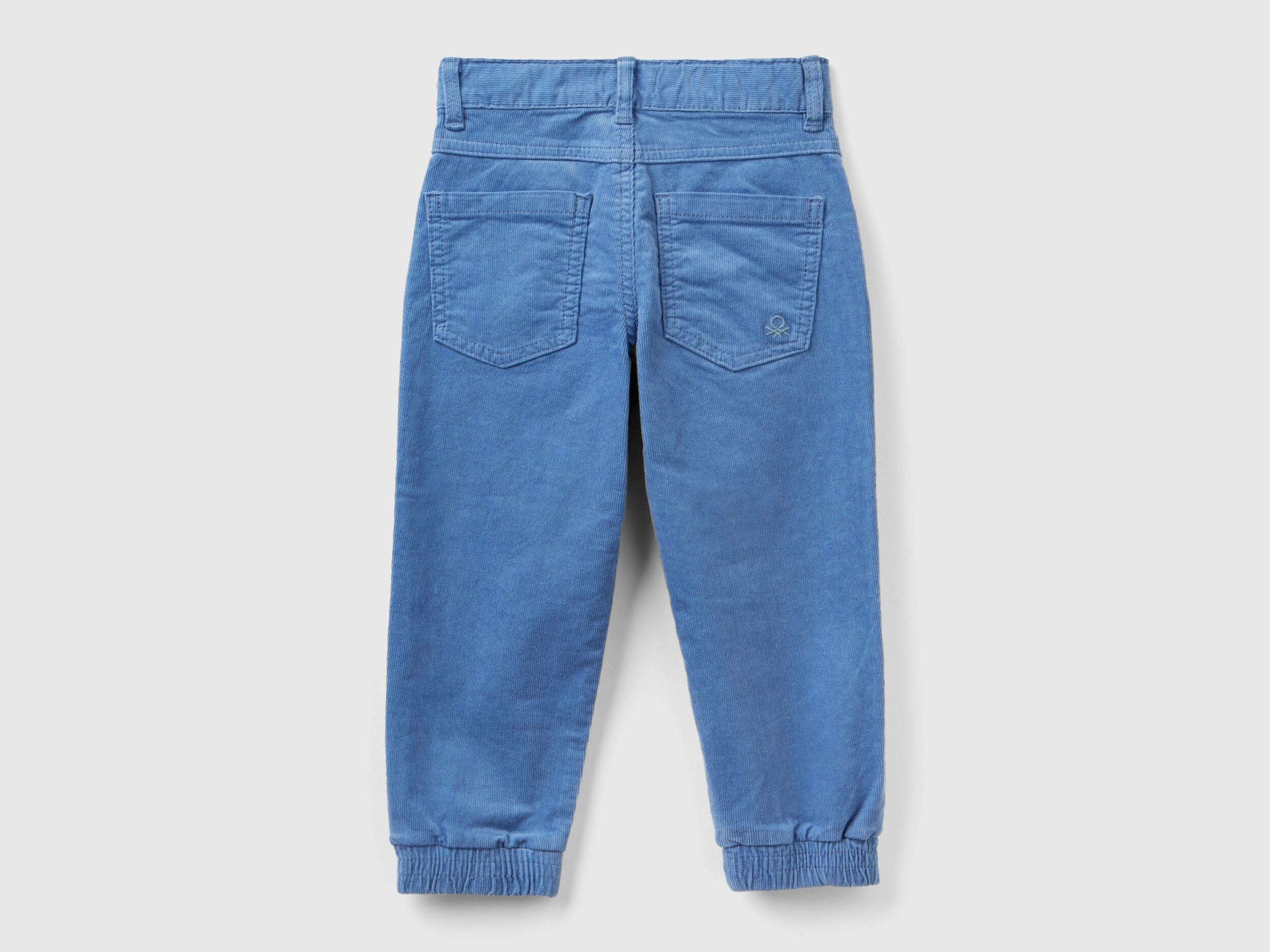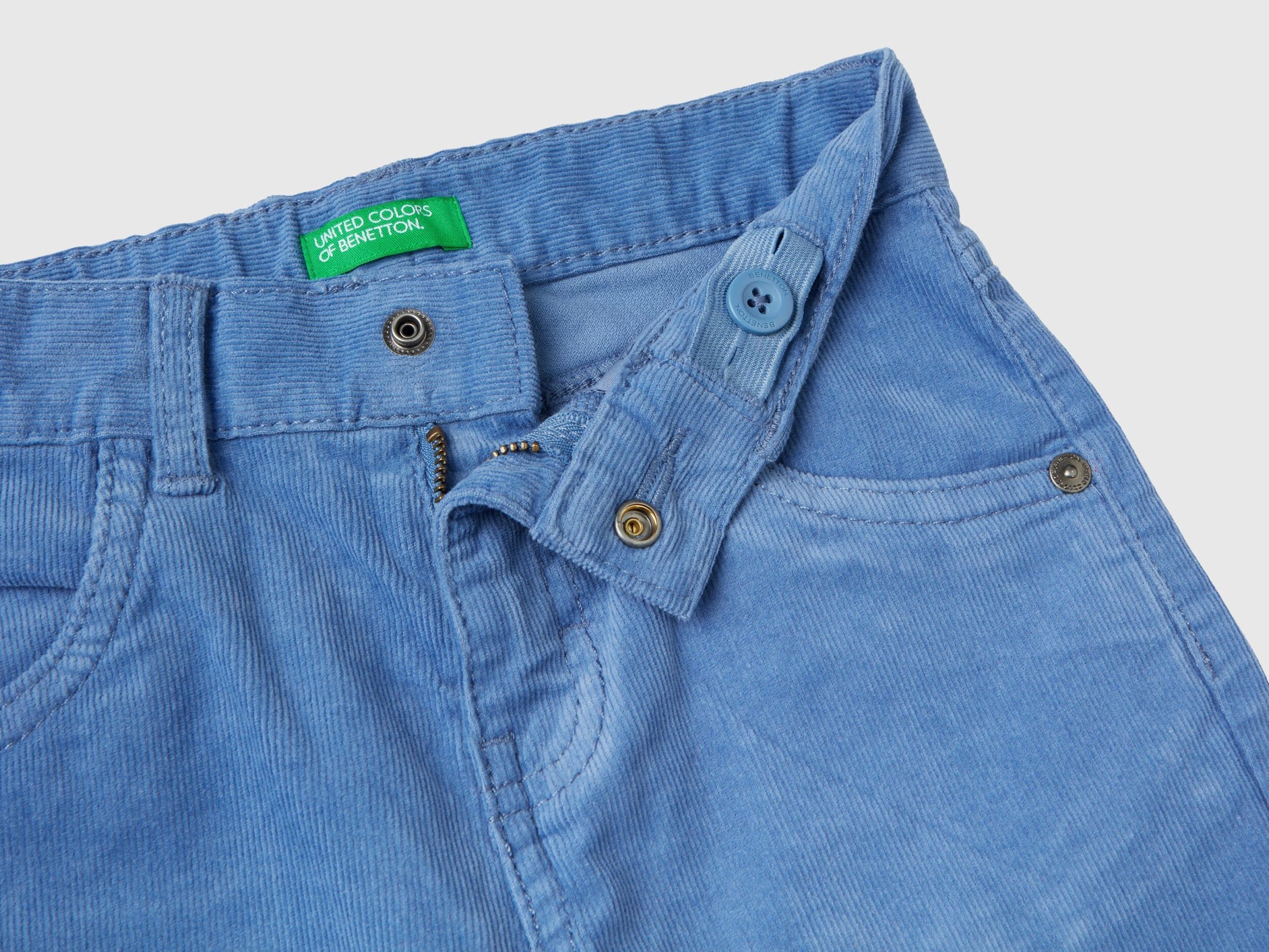 Long trousers in ribbed stretch cotton corduroy. Regular waist, zip and button opening, front pockets. Back with yoke and patch pockets, one of which has an embroidered logo. To pair with a check shirt for a stylish look.