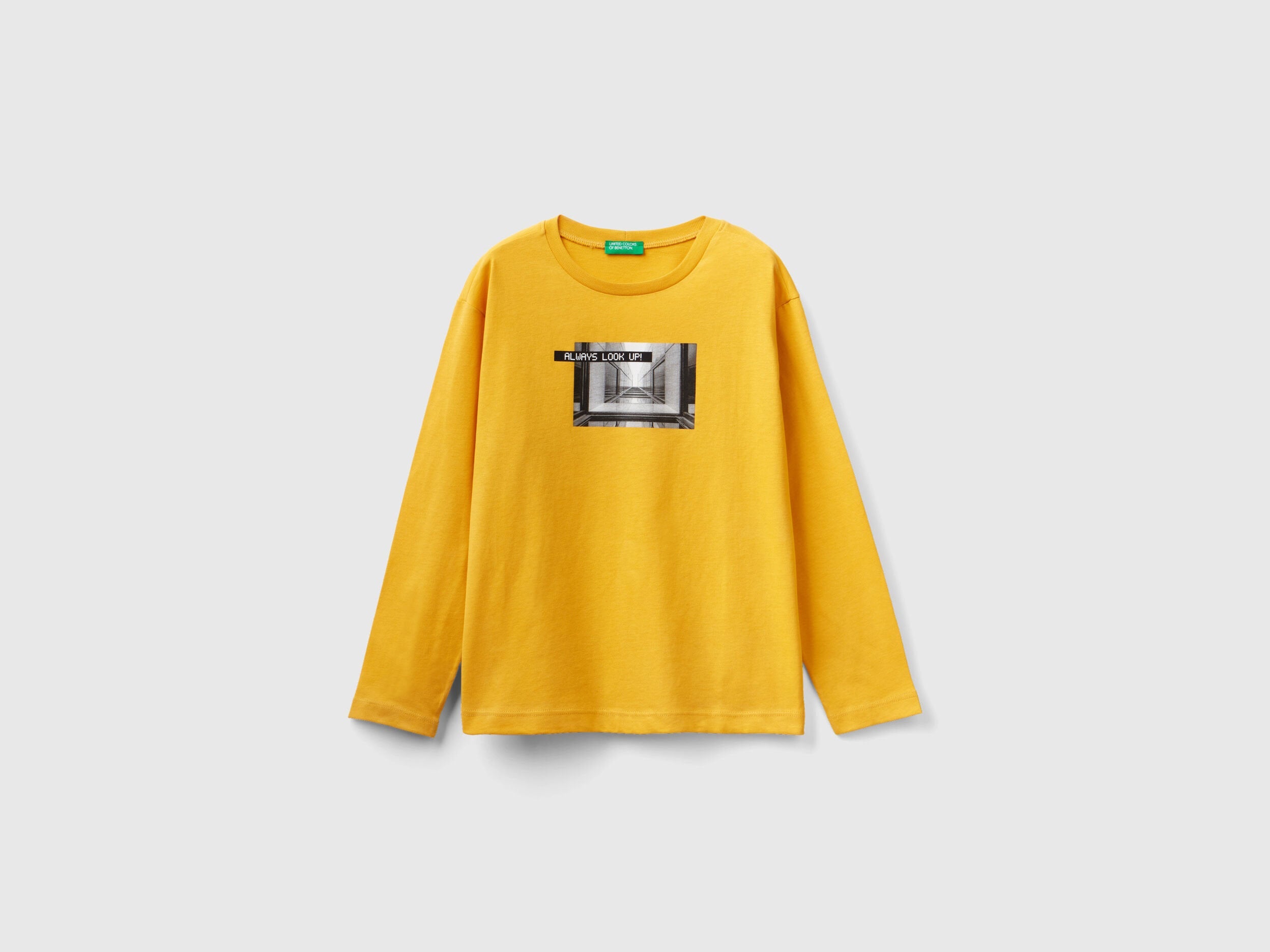 Long sleeve crew neck t-shirt in warm pure cotton. Loose fit and photographic print on front. Casual and original, to be worn under a hoodie or denim shirt.