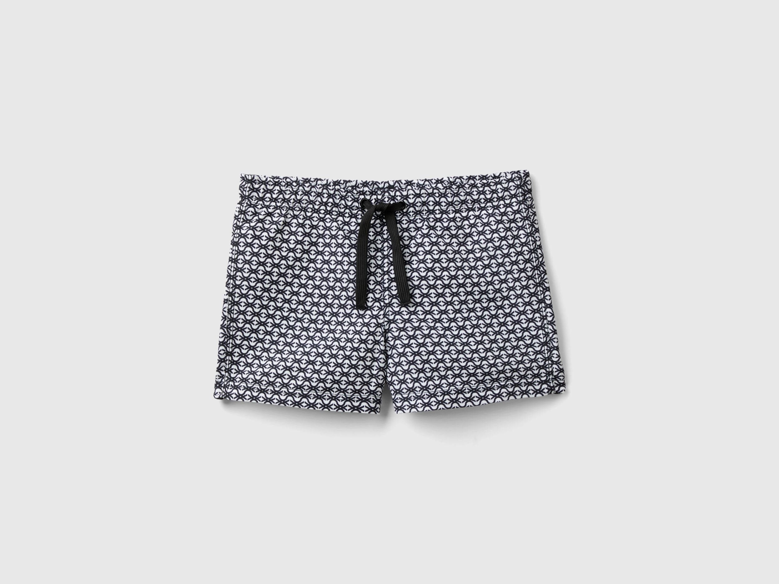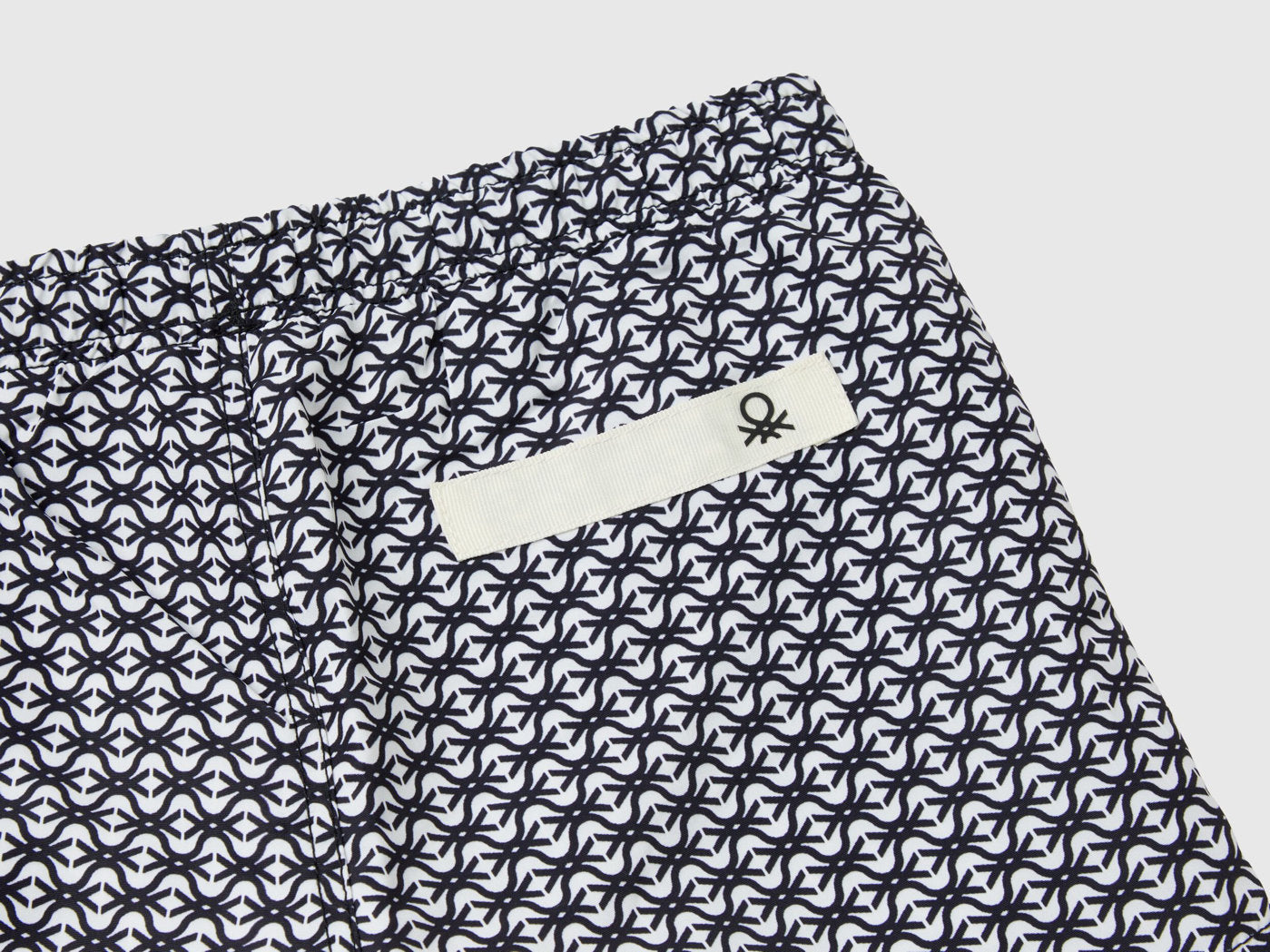 Short swim trunks with inner elastic and drawstring waist. Stripe applied on the back with logo print. Monogram print, obtained by putting together multiple stitch logos to form a pattern.