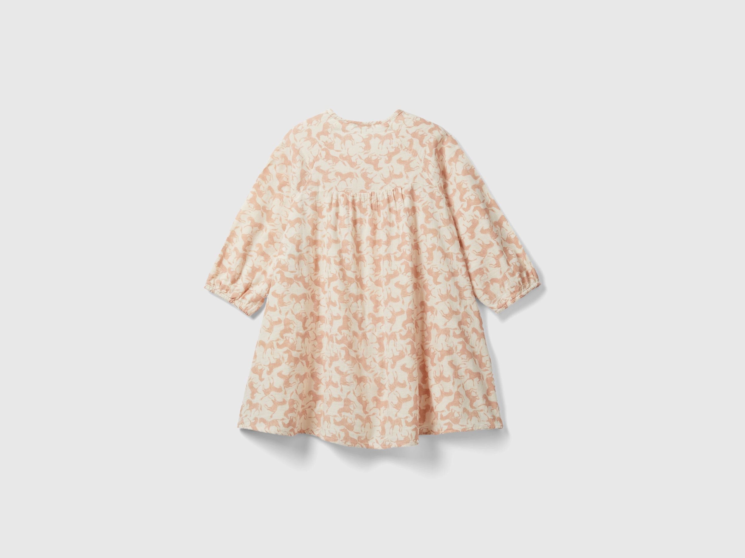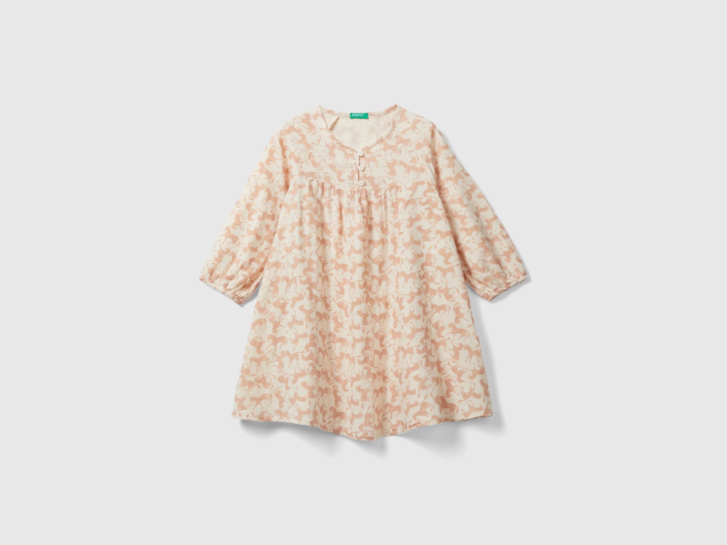 Pure cotton gauze crew neck dress. Long raglan cut sleeve, partial opening with buttons under the neckline. High empire-style cut, gathered skirt, allover horse graphic print. For cheerful and contemporary outfits.