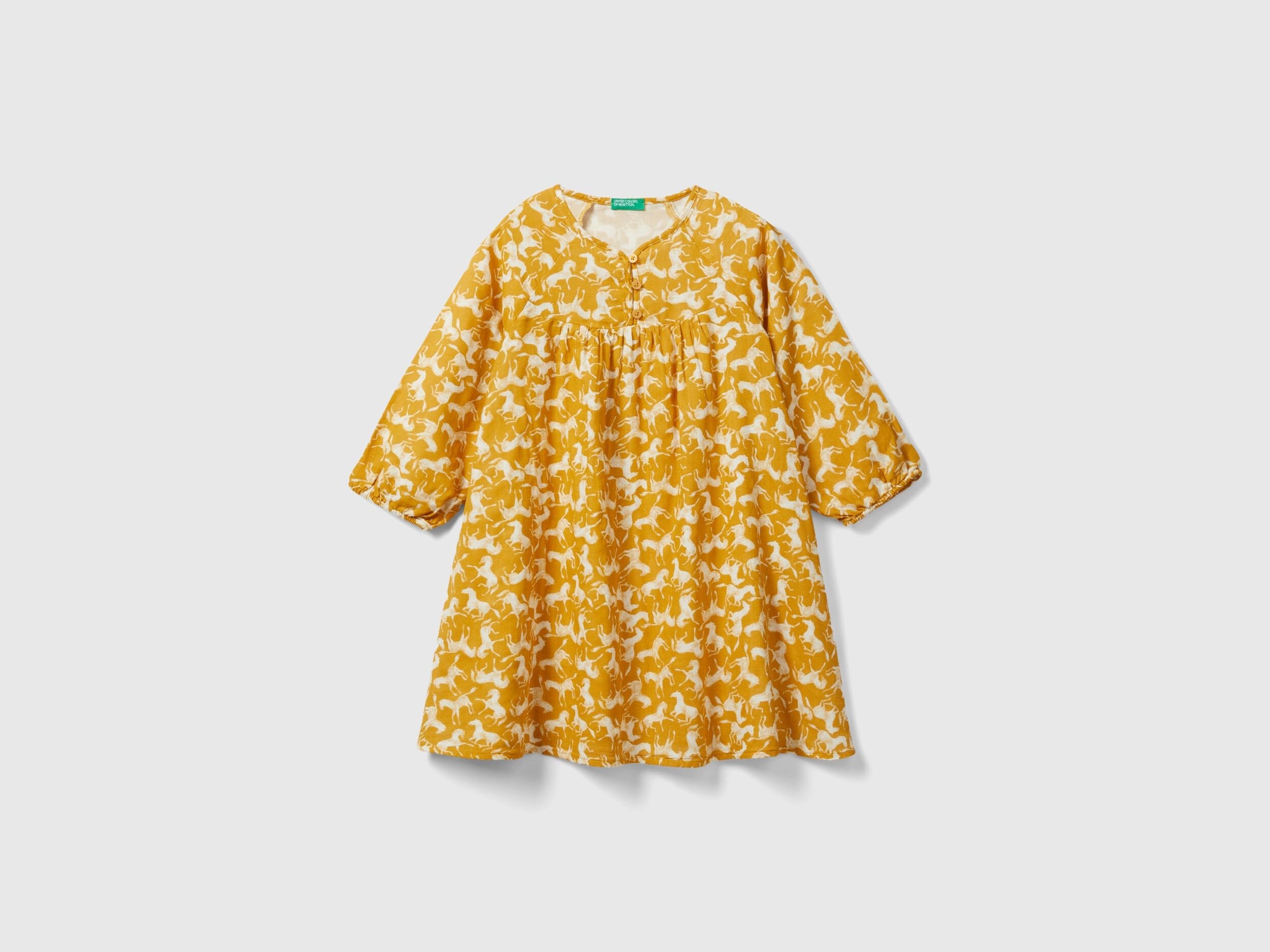 Pure cotton gauze crew neck dress. Long raglan cut sleeve, partial opening with buttons under the neckline. High empire-style cut, gathered skirt, allover horse graphic print. For cheerful and contemporary outfits.