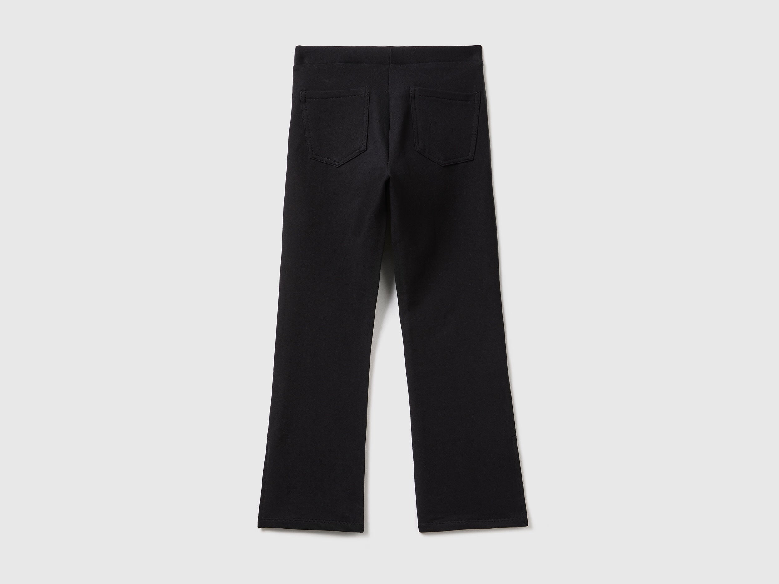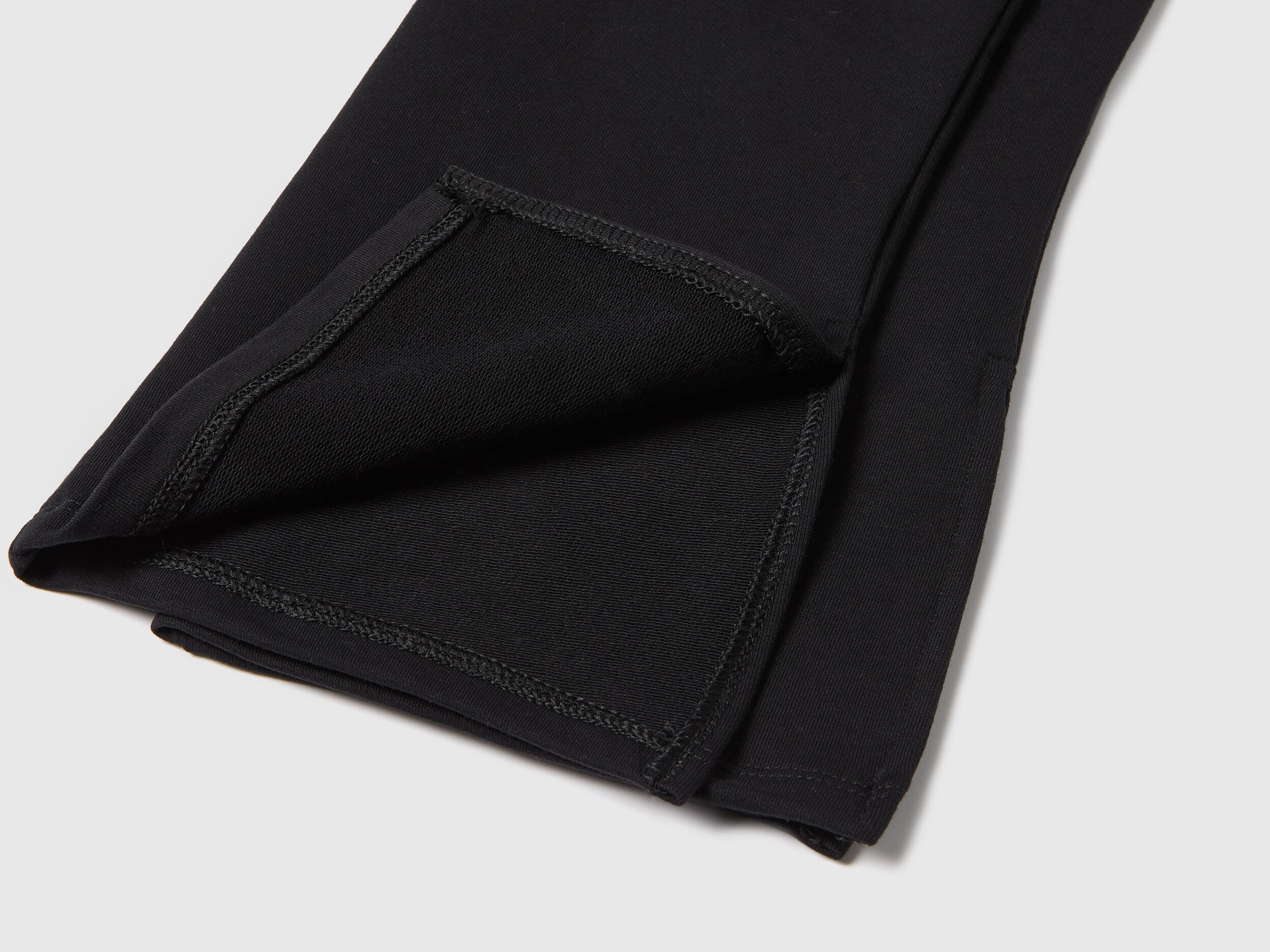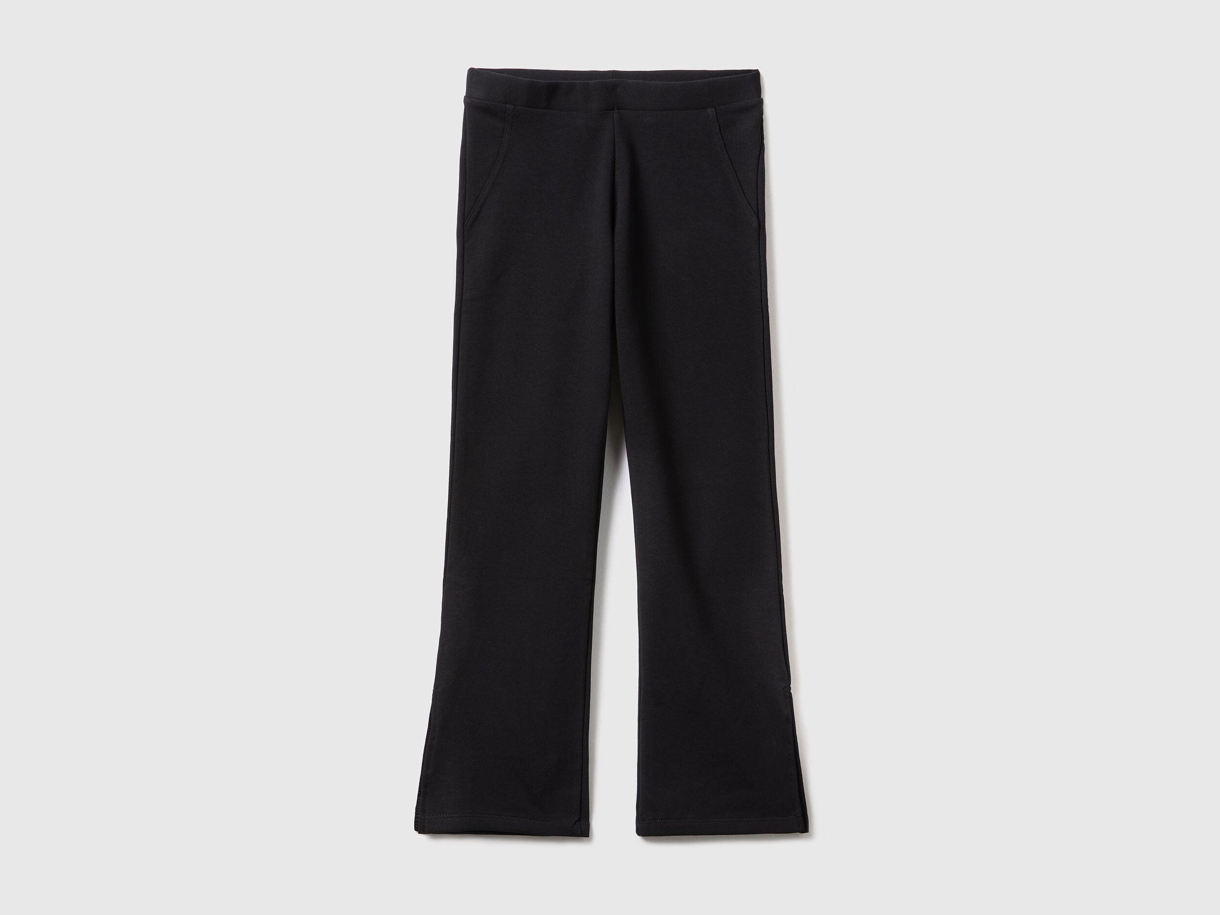 Sweatpants in warm stretch cotton. Flared cut and side slits on the bottom. Front pockets and patch pockets on the back. Perfect for school or for free time.