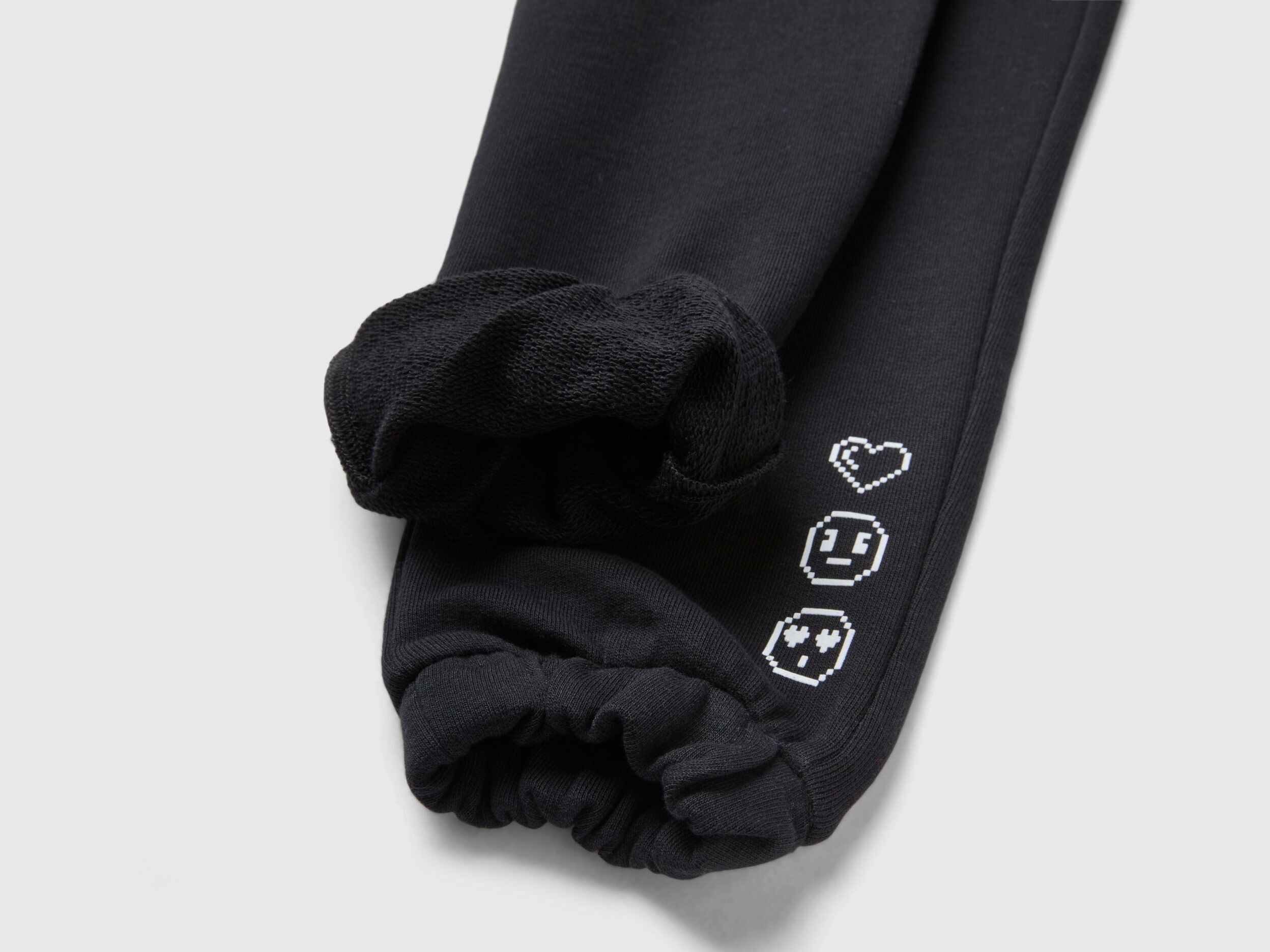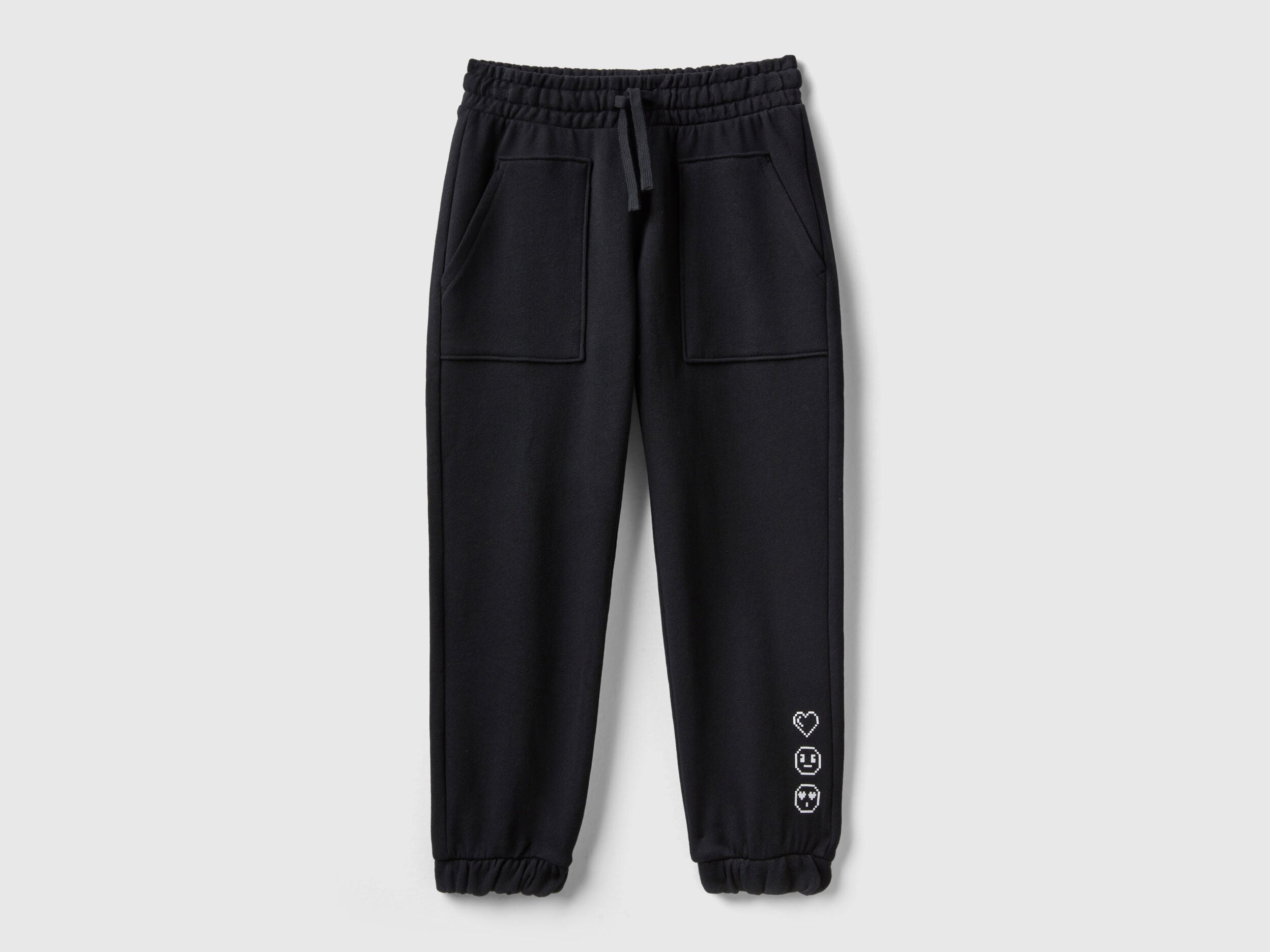 Long trousers in pure cotton sweat with consistent yet light feel. Waist with inner elastic and drawstring, wide front pockets, rubber pixel print at leg opening. Street style and sporty mood, to run and play freely.