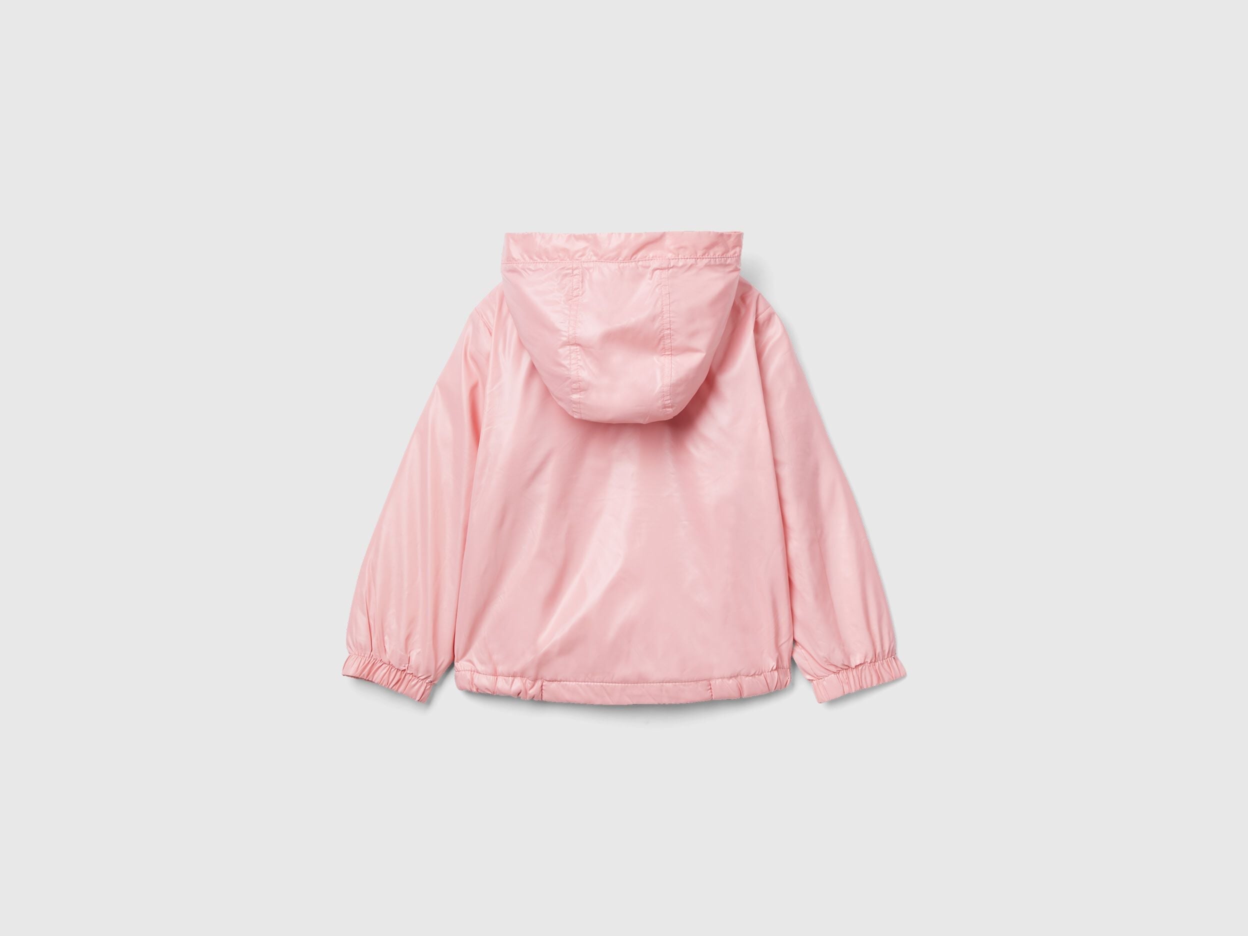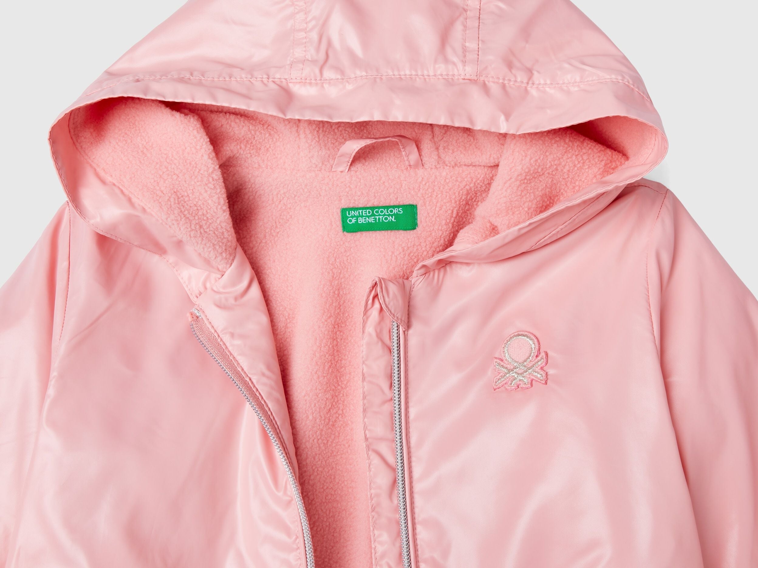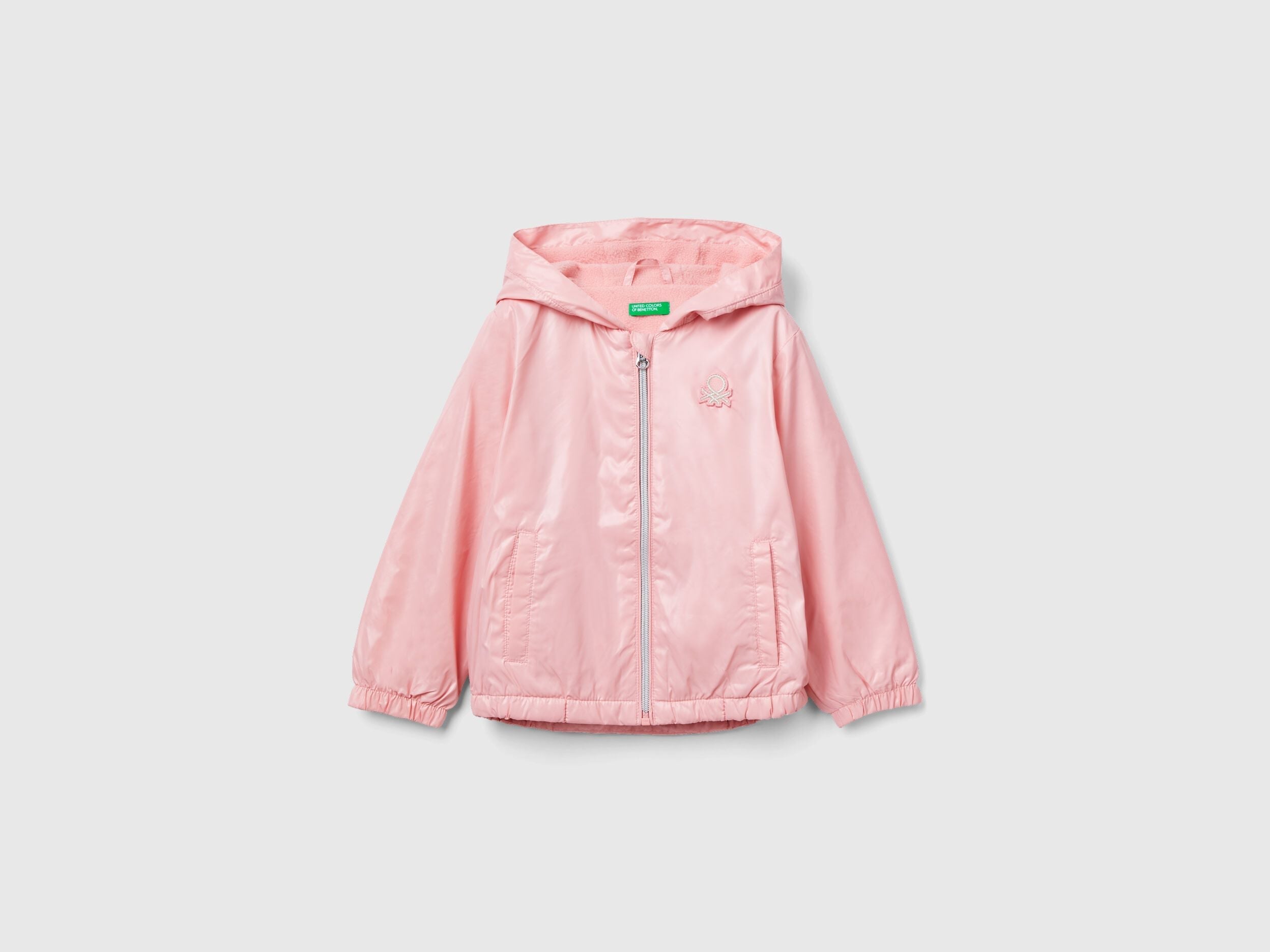 Padded jacket with hood in shiny "Rain Defender" fabric, lined in soft fleece. Opening with zip and safety zip pull, front pockets, inner elastic on the bottom and cuffs. Patch logo in lurex applique at left breast. Graceful and feminine, without passing up on practicality.