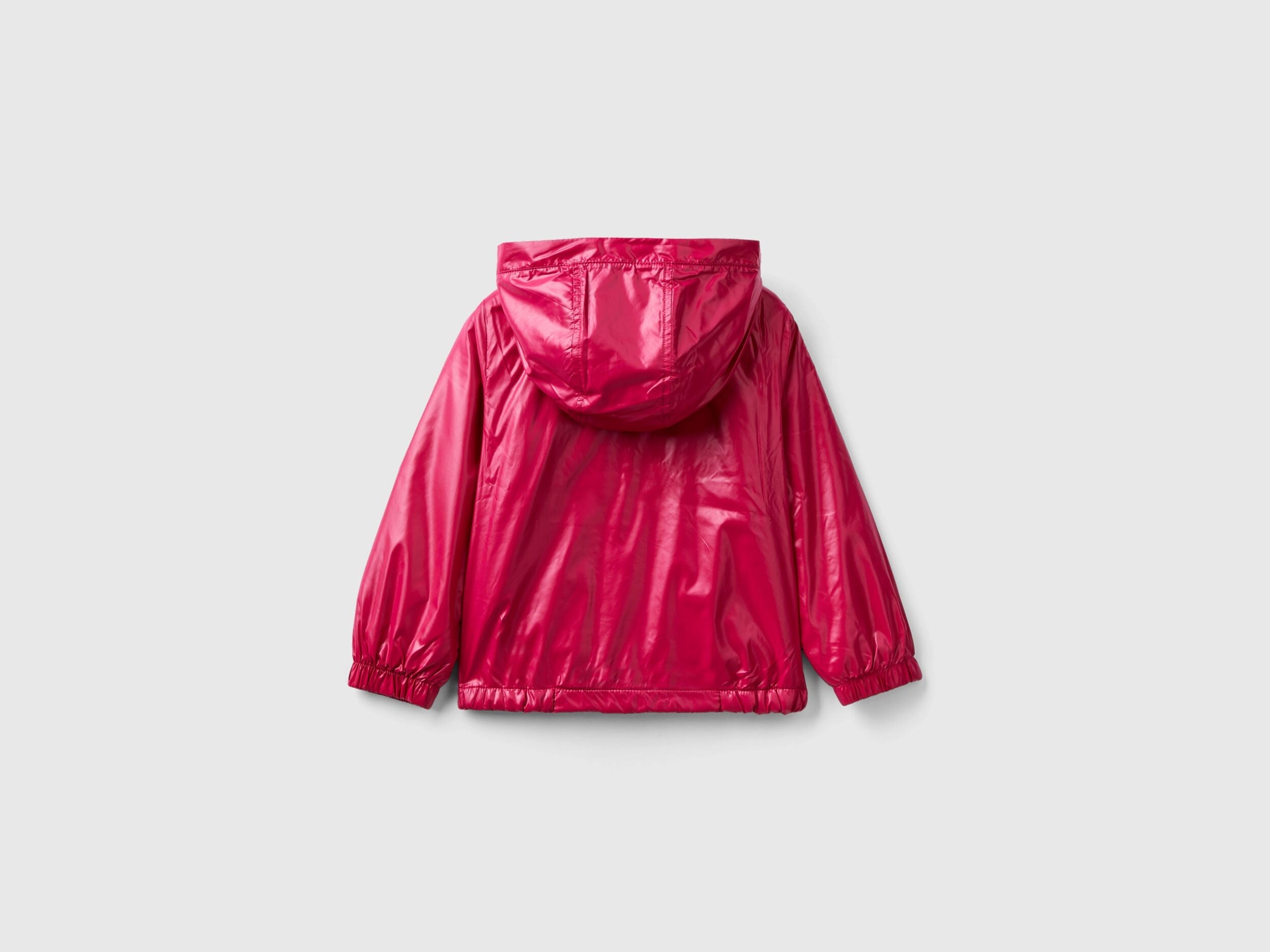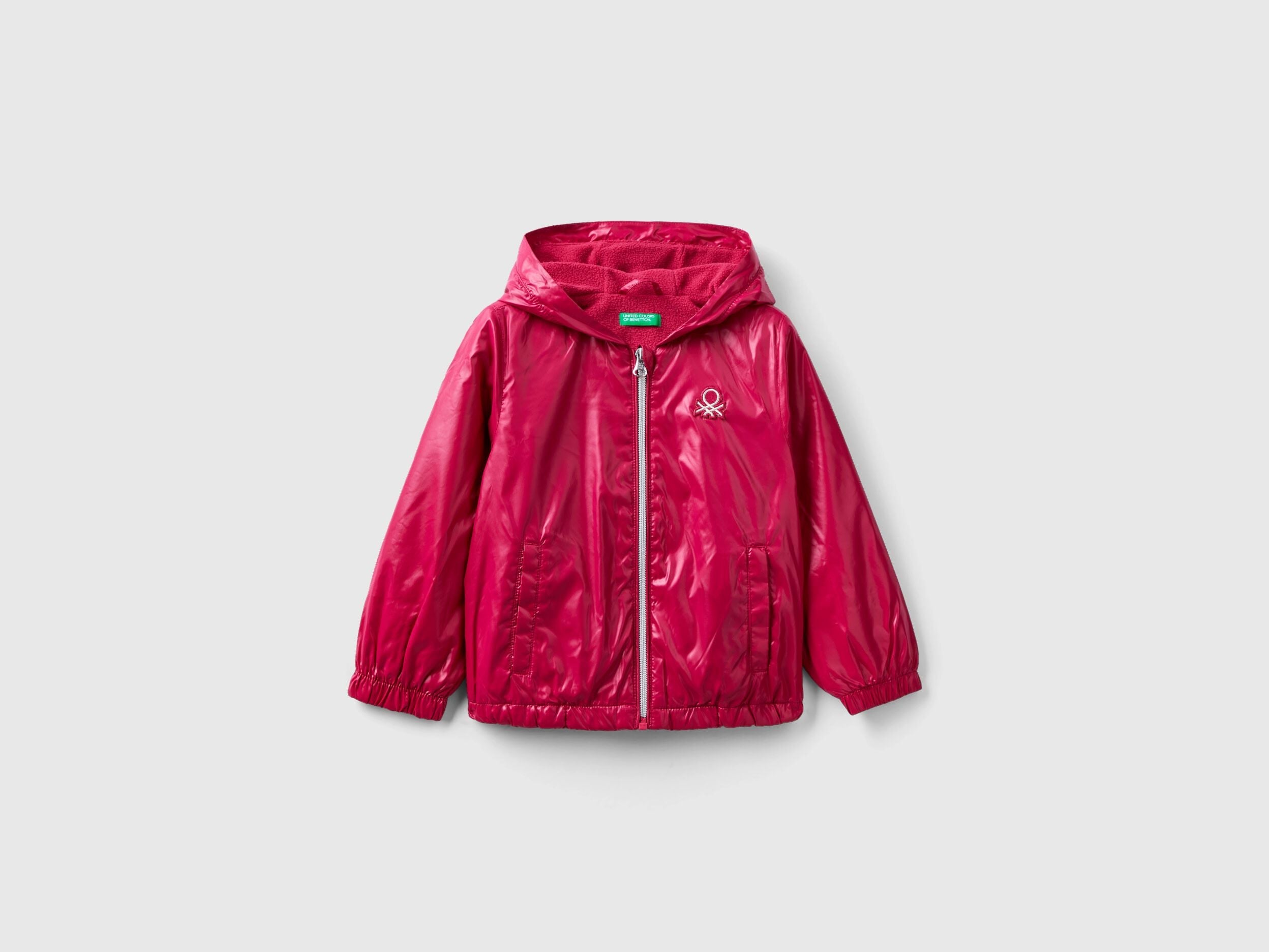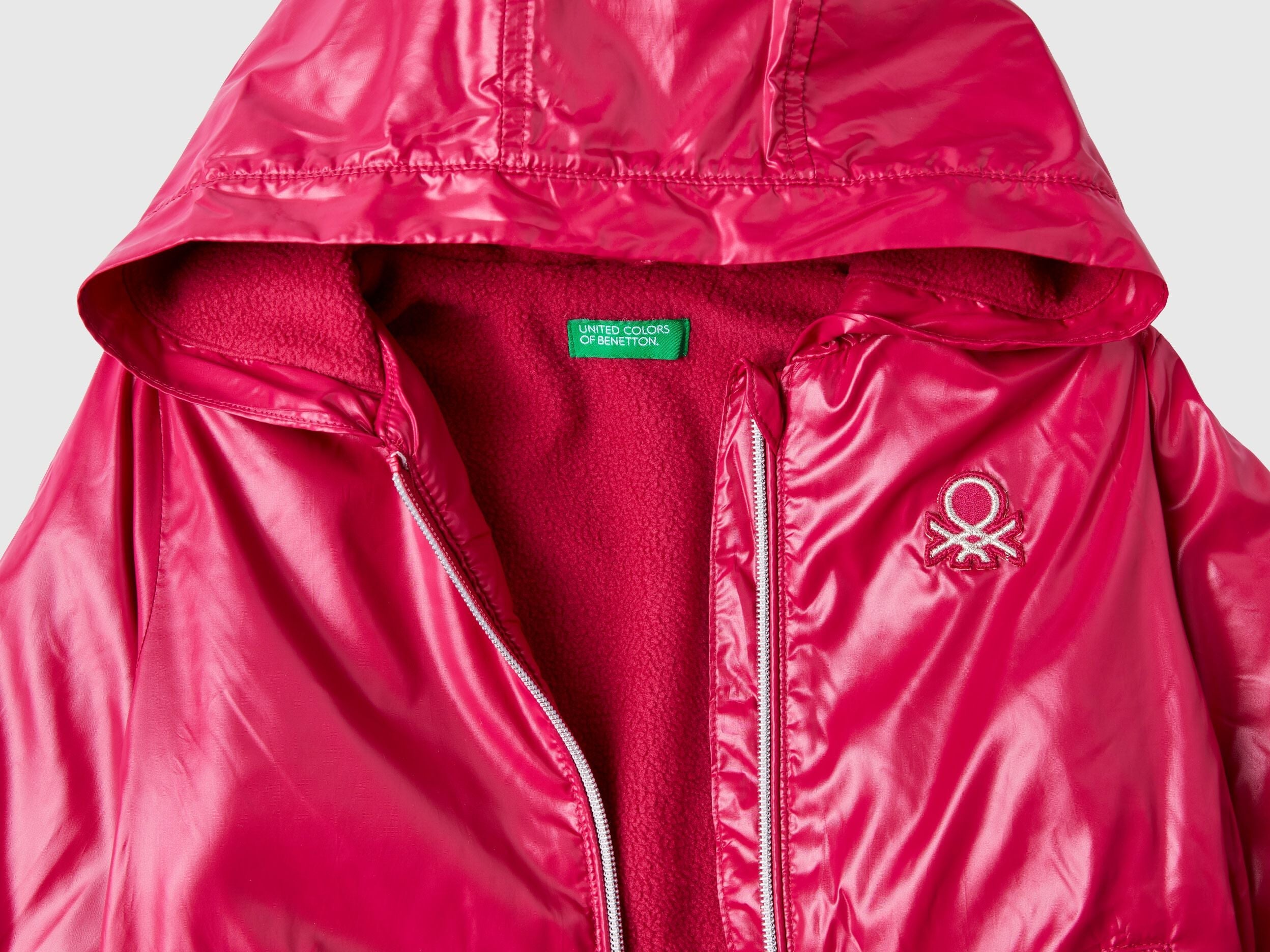 Padded jacket with hood in shiny "Rain Defender" fabric, lined in soft fleece. Opening with zip and safety zip pull, front pockets, inner elastic on the bottom and cuffs. Patch logo in lurex applique at left breast. Graceful and feminine, without passing up on practicality.