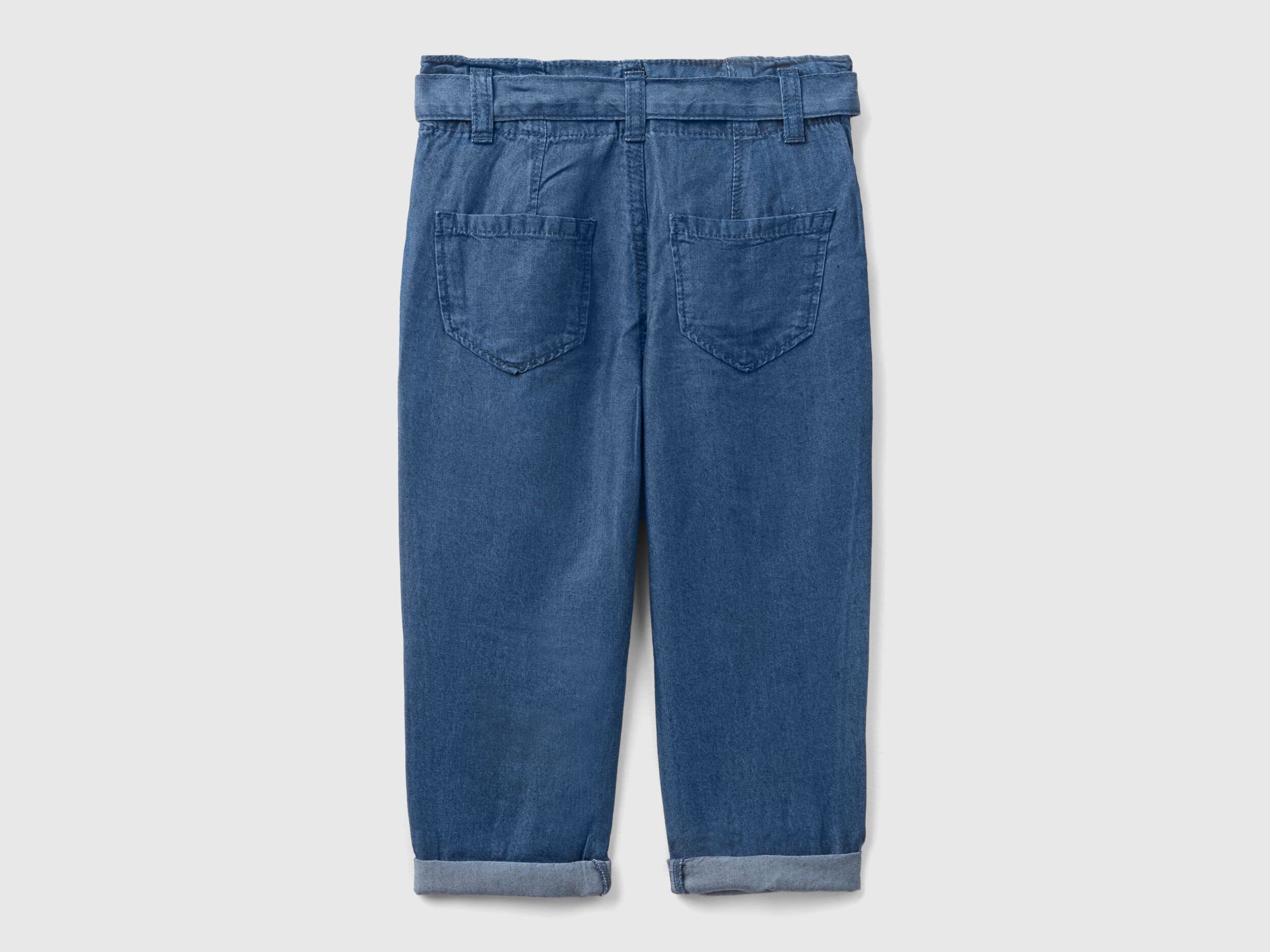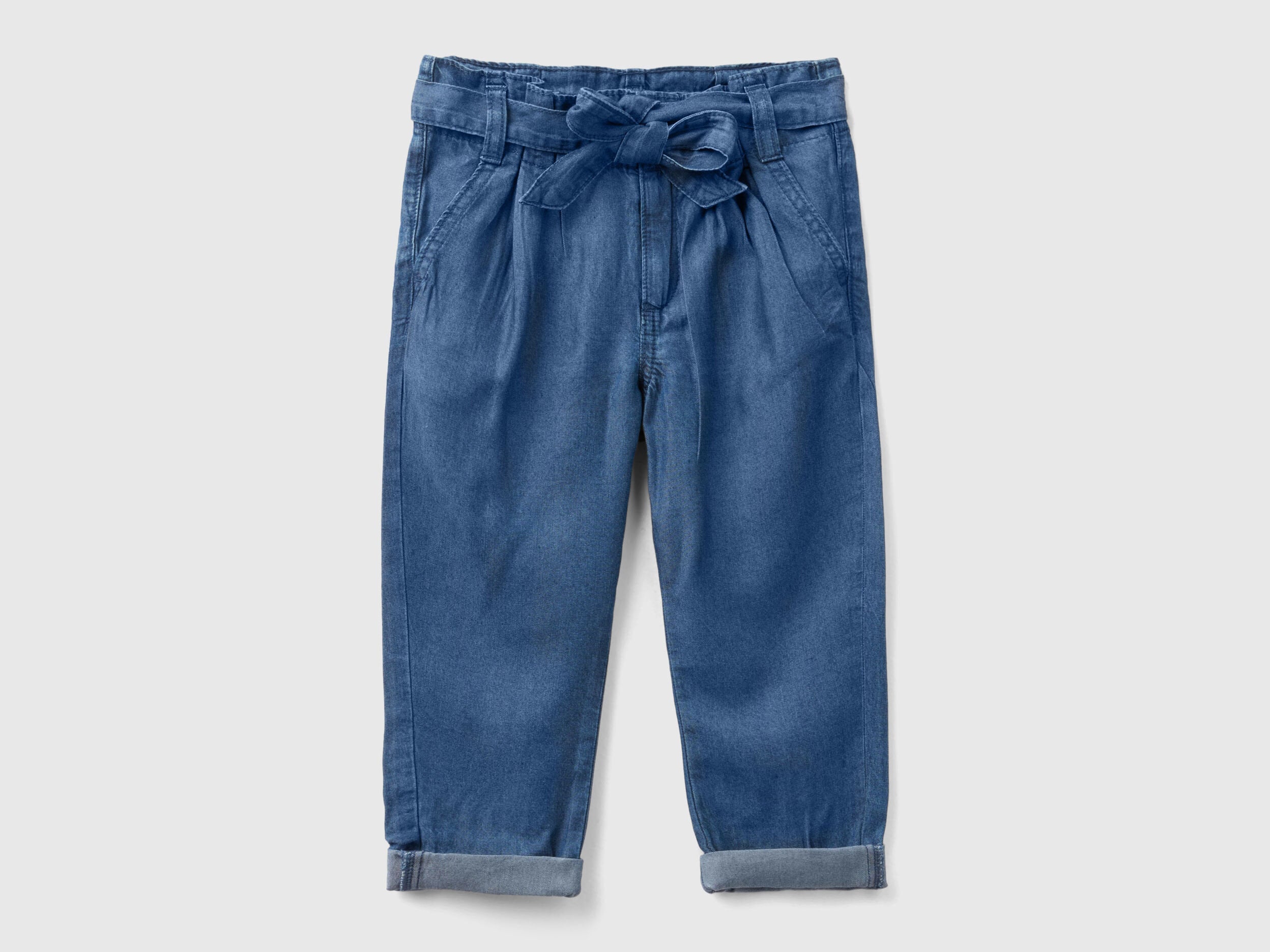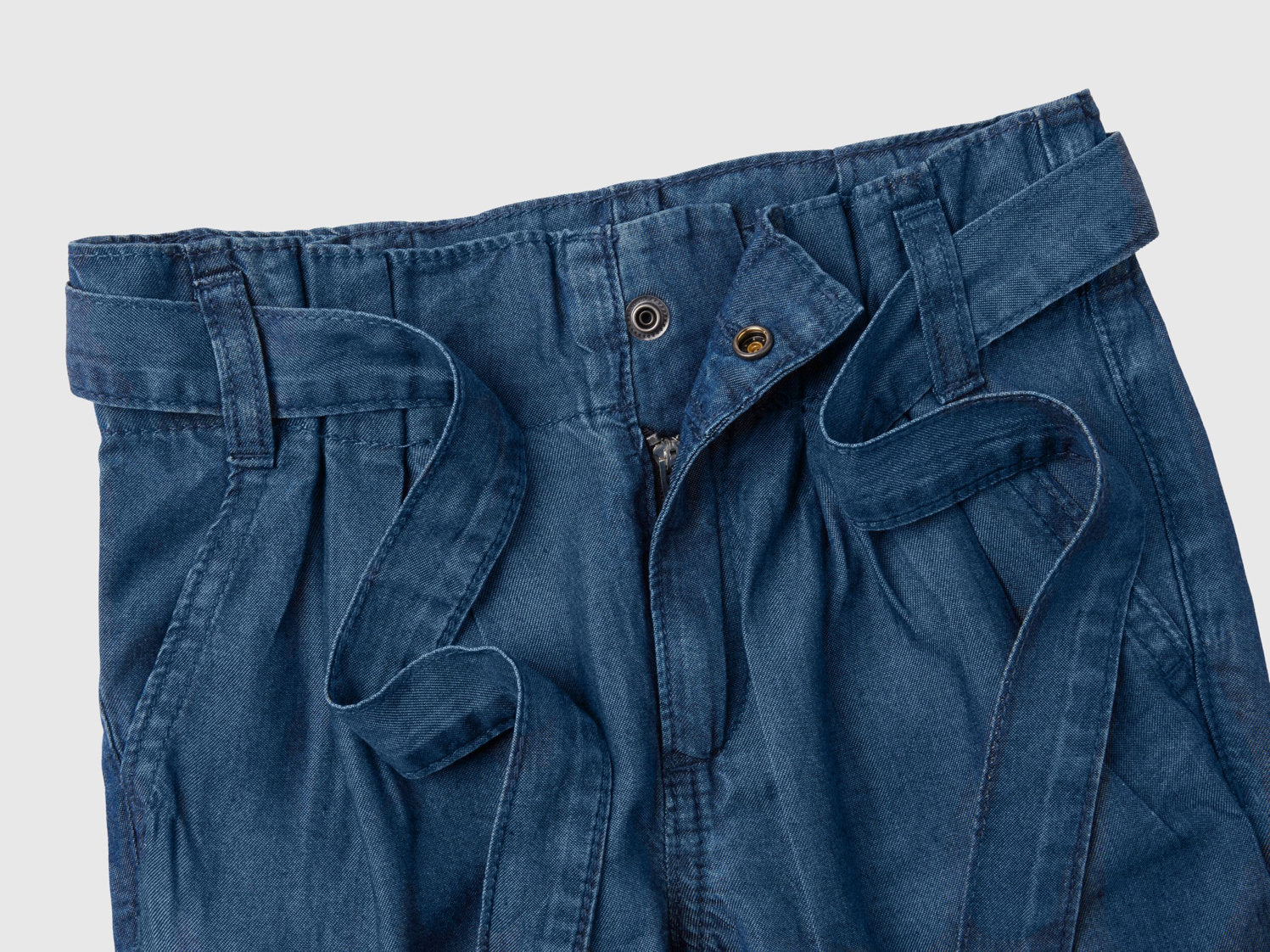 Long chambray trousers with knotted sash at the waist. Paperbag cut with gathered high waist, wide leg and cuff on bottom. Zip and button opening, diagonal pockets on front and patch pockets on the back. Modern and comfortable.
