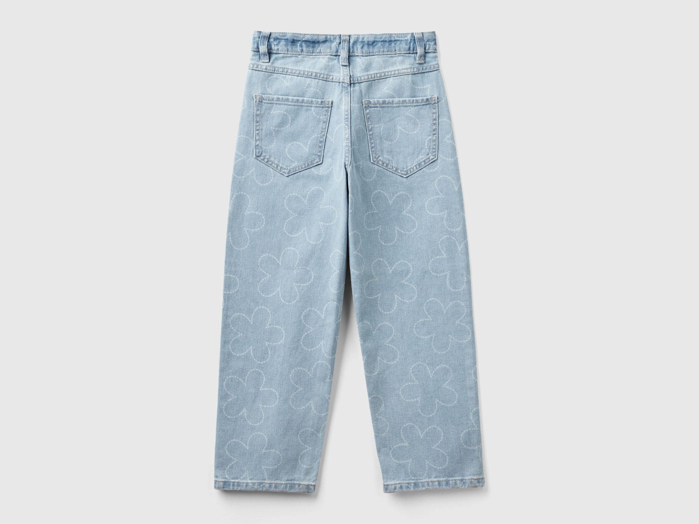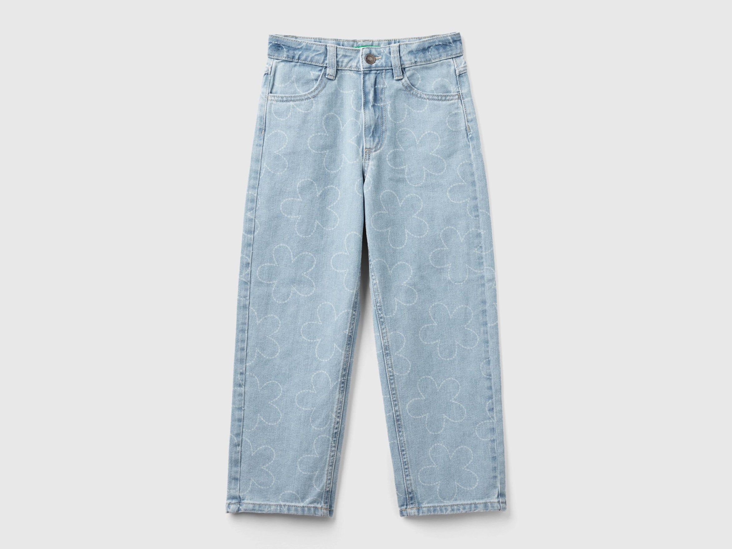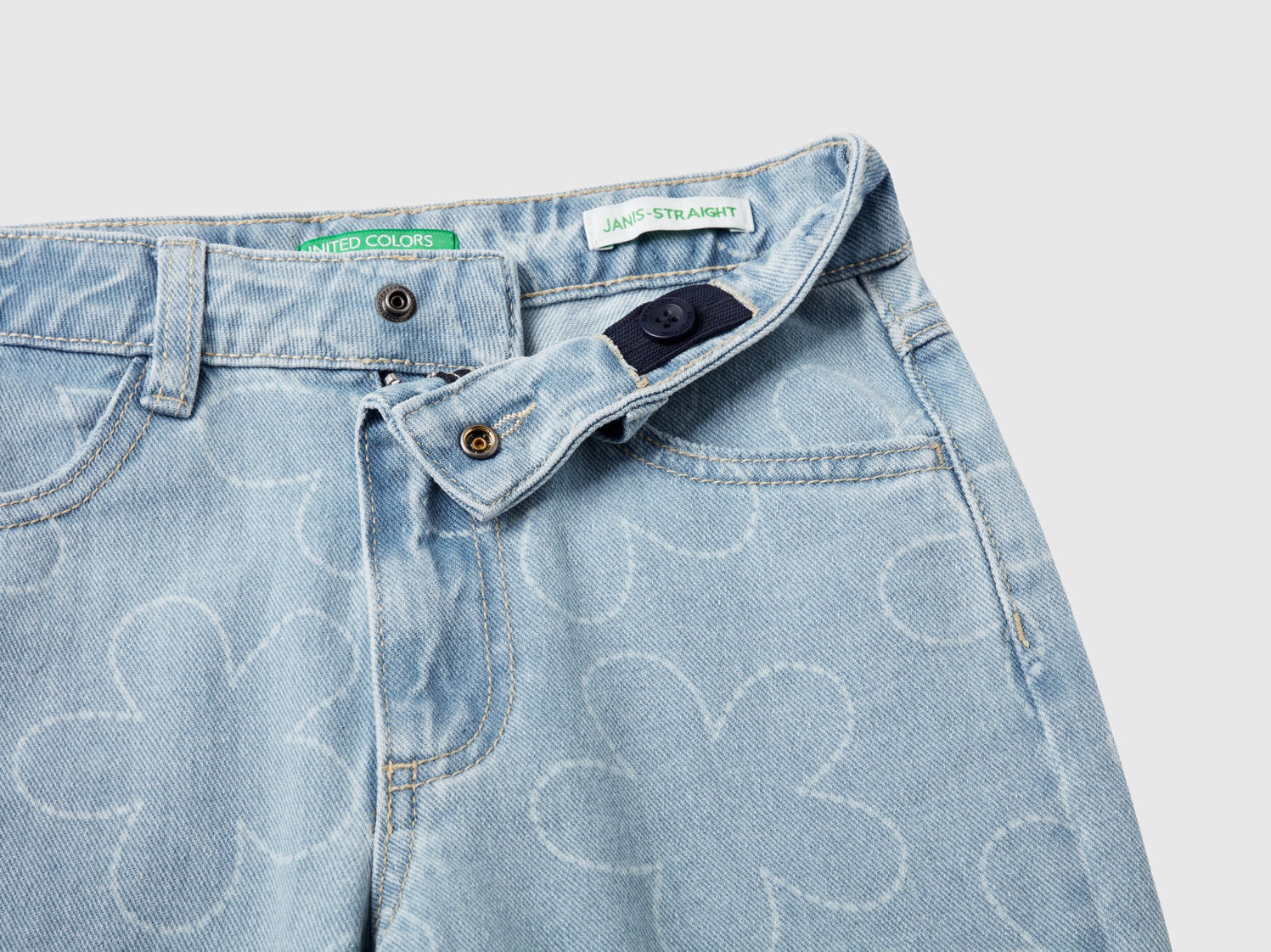 Long trousers in pure cotton denim with a worn look. Straight fit, waist with zip and button opening. Practical adjustable inner elastic waist. Sweet floral pattern all over piece, for romantic, trendy looks.