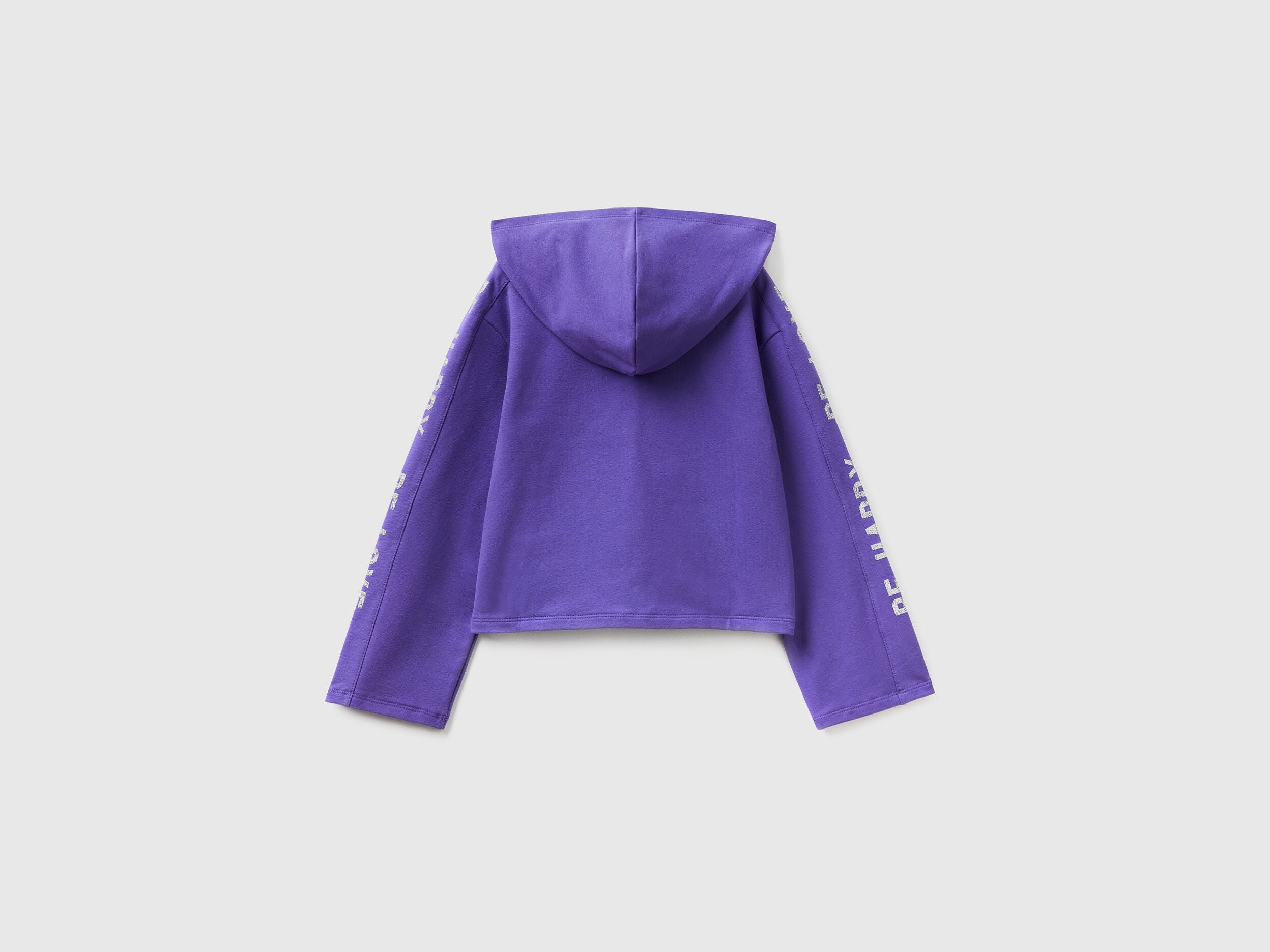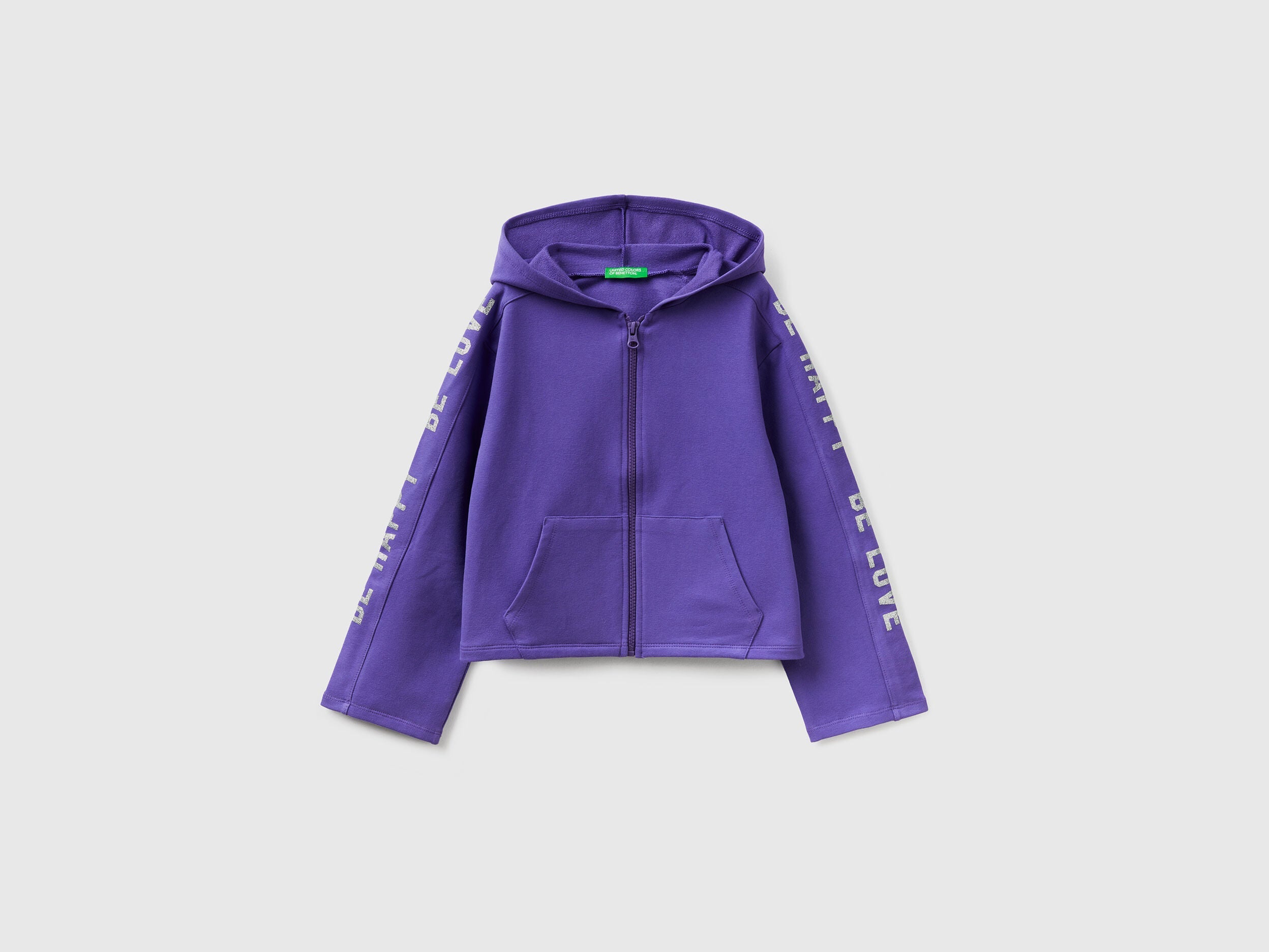 Hoodie with boxy fit in warm stretch cotton. Slogan print with glitter along the sleeves, zip opening and front patch pockets. For sporty and cool looks.