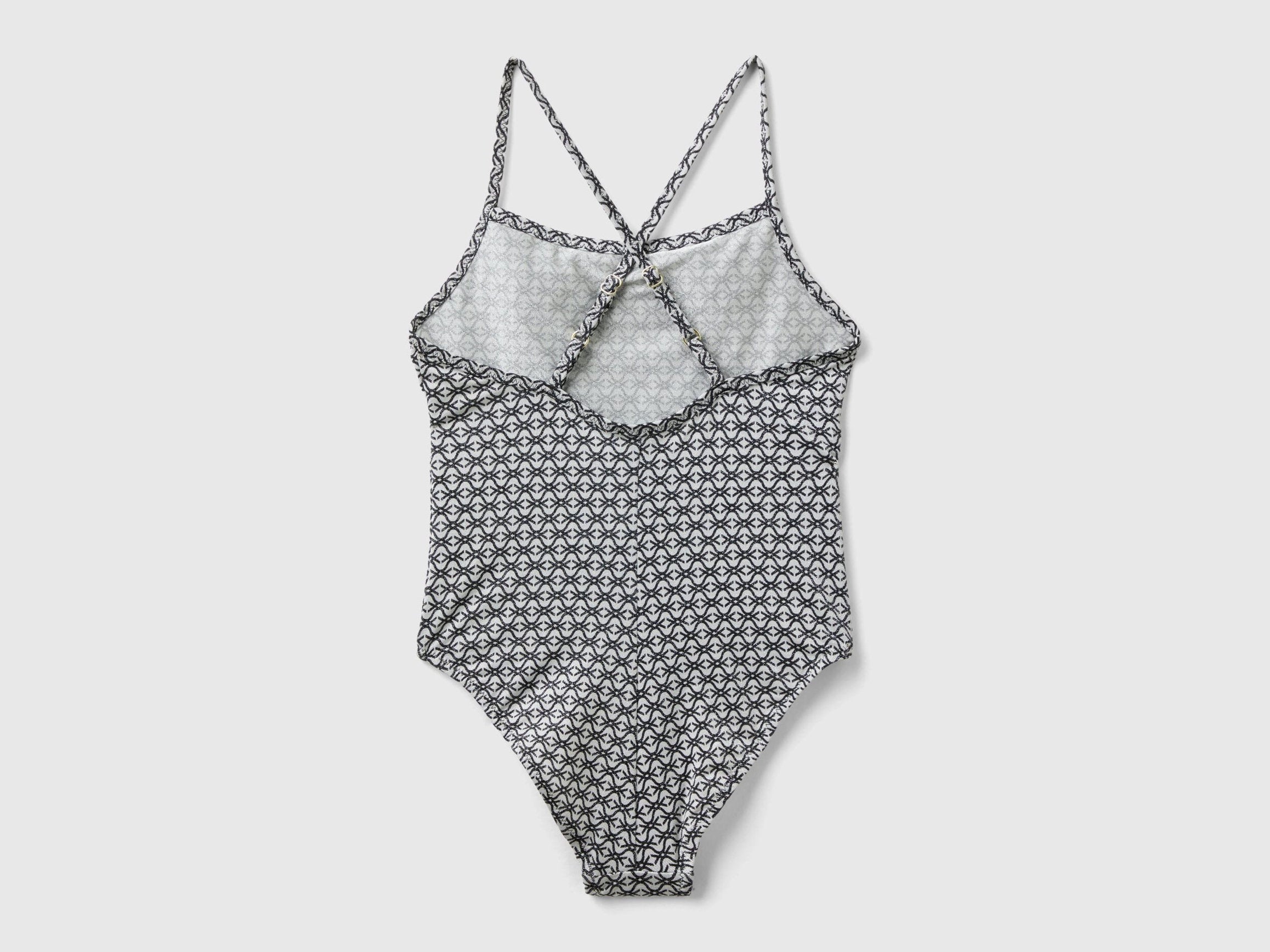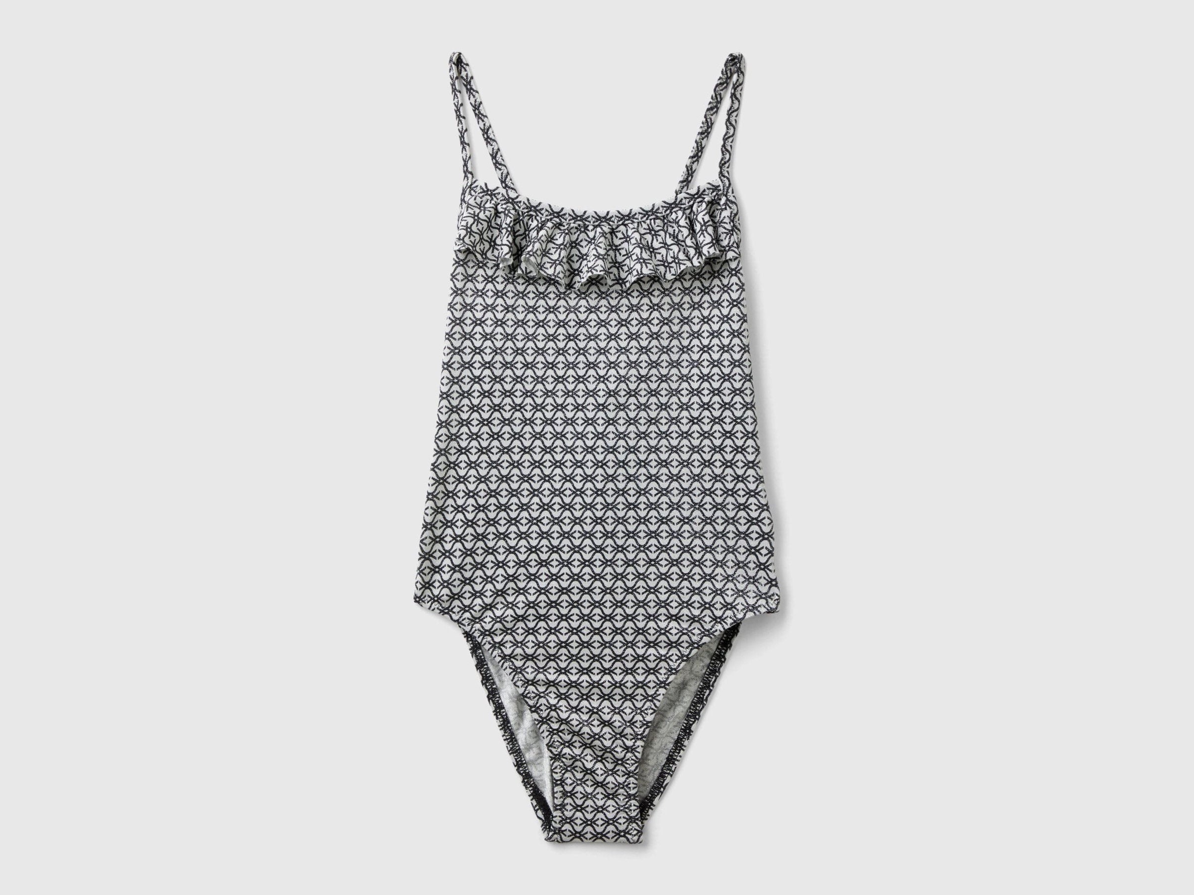 One-piece suimsuit in stretch fabric with lurex. Thin straps crossed on the back, round neckline with ruffles. Monogram print jacquard all over piece, made by putting multiple logos together with knit stitch to form a pattern.