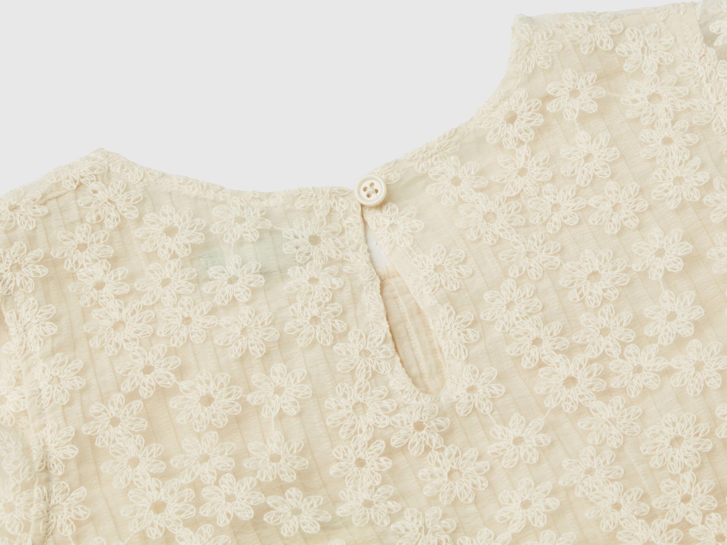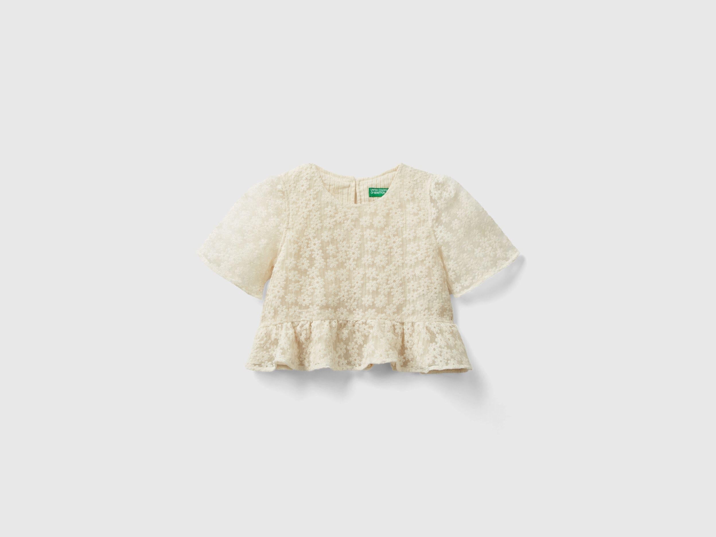 Pretty blouse in cotton blend macram_ fabric, with viscose blend lined bust. Soft, flared fit with flounce at the bottom. Round neckline, long sleeves, keyhole opening with button on the back. Romantic inspiration for a garment that you can also wear at ceremonies and special occasions.