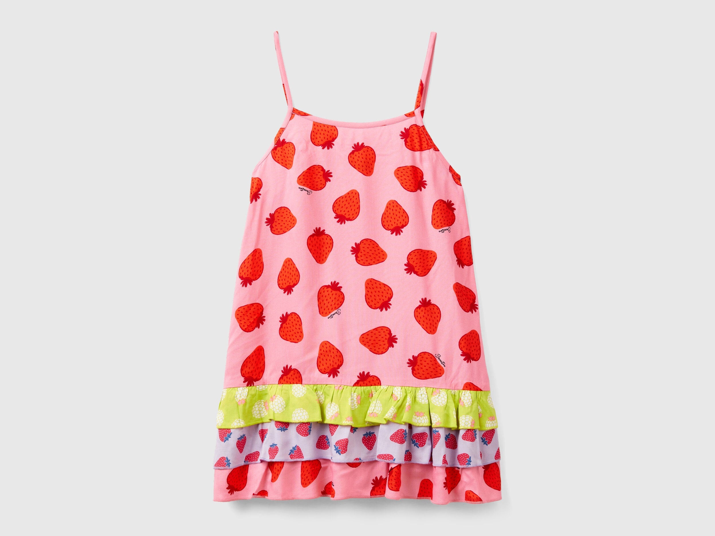 Short beach dress with adjustable straps. Cheerful strawberry pattern on a pink background, flounces at the bottom with alternating fruit patterns. Made of 100% sustainable viscose, produced using wood from certified forests and respecting the highest environmental standards.