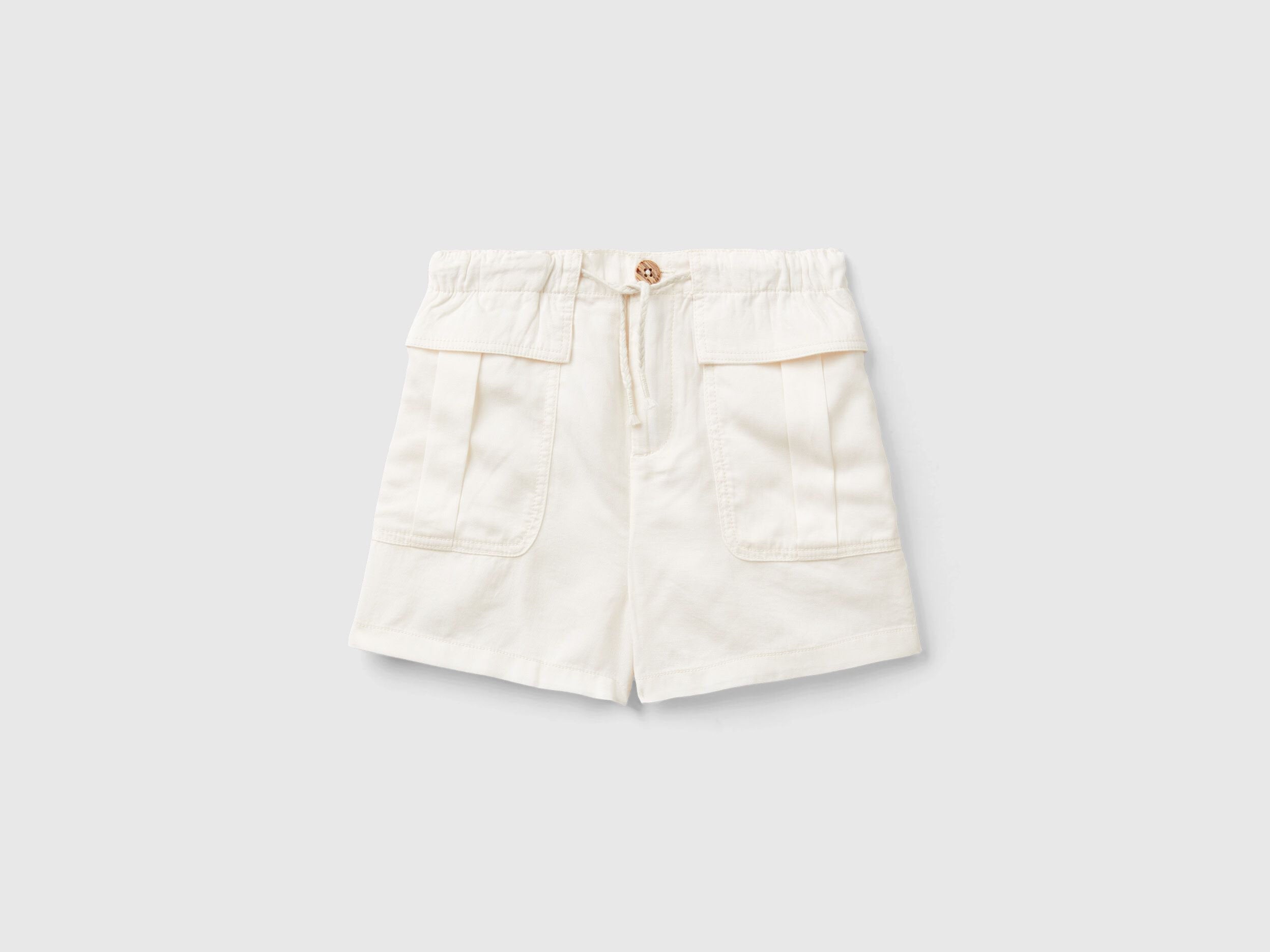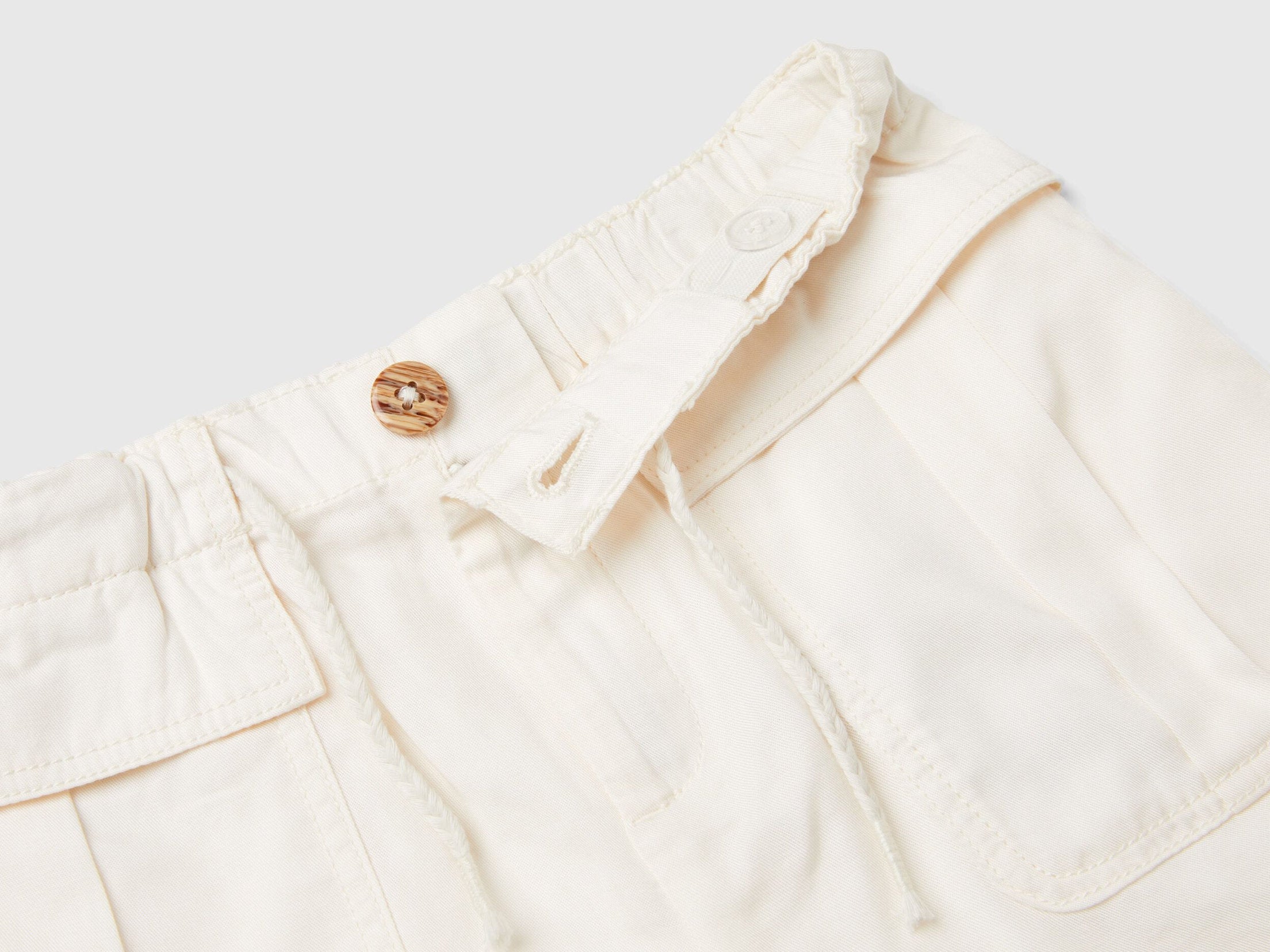 Short trousers in soft viscose blend fabric with large patch pockets on the sides. Waist with internal elastic on the back and sides, rope-like drawstring with tassels. Front zip and button opening, internal adjustable elastic waist. Original and comfortable.