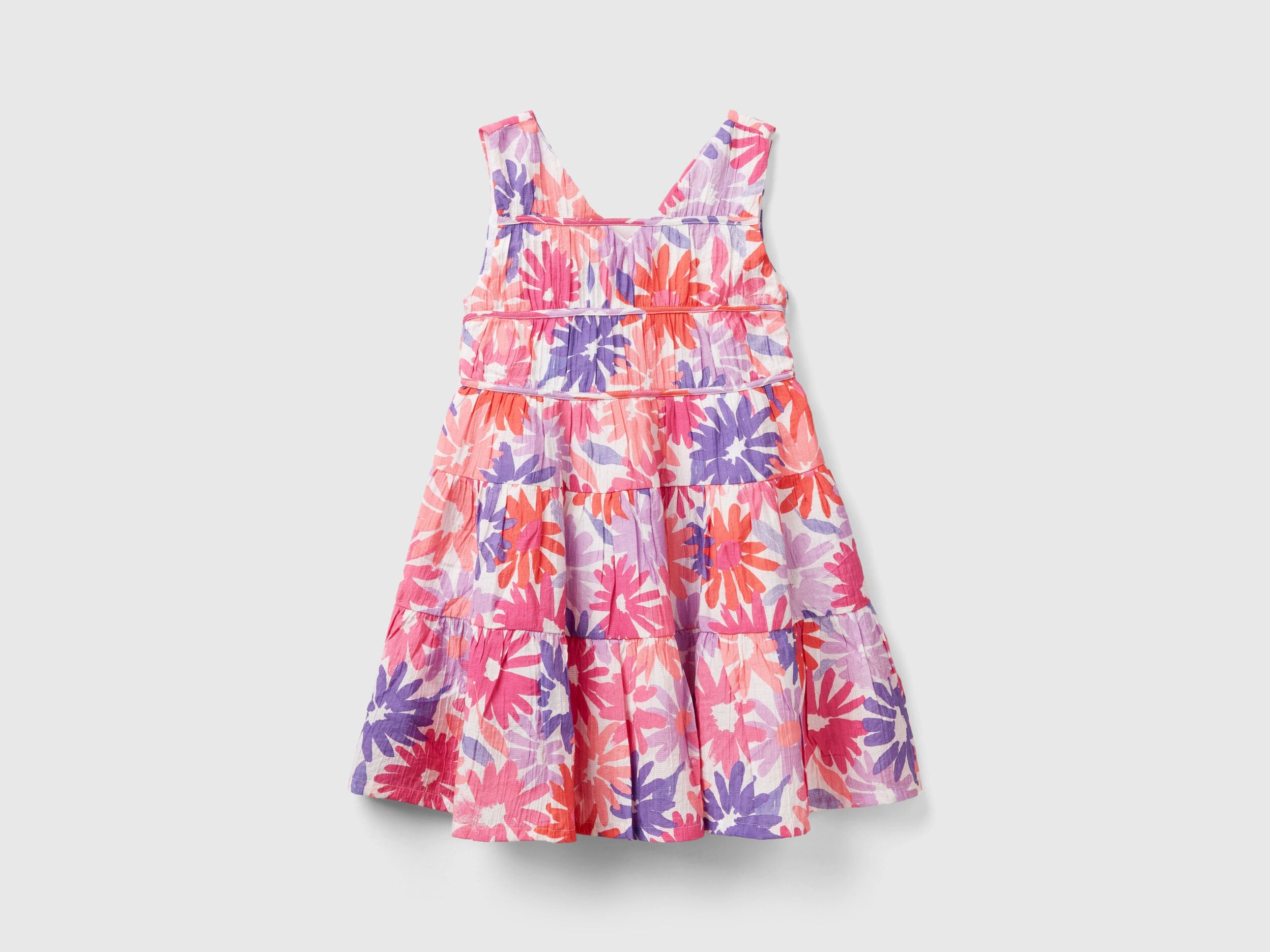 Sleeveless dress in lightweight viscose and nylon blend fabric, lined in pure cotton. Above knee length and ruffles on the skirt. V neck and hidden zip opening on one side. Colorful floral print all over. Also perfect for special occasions.