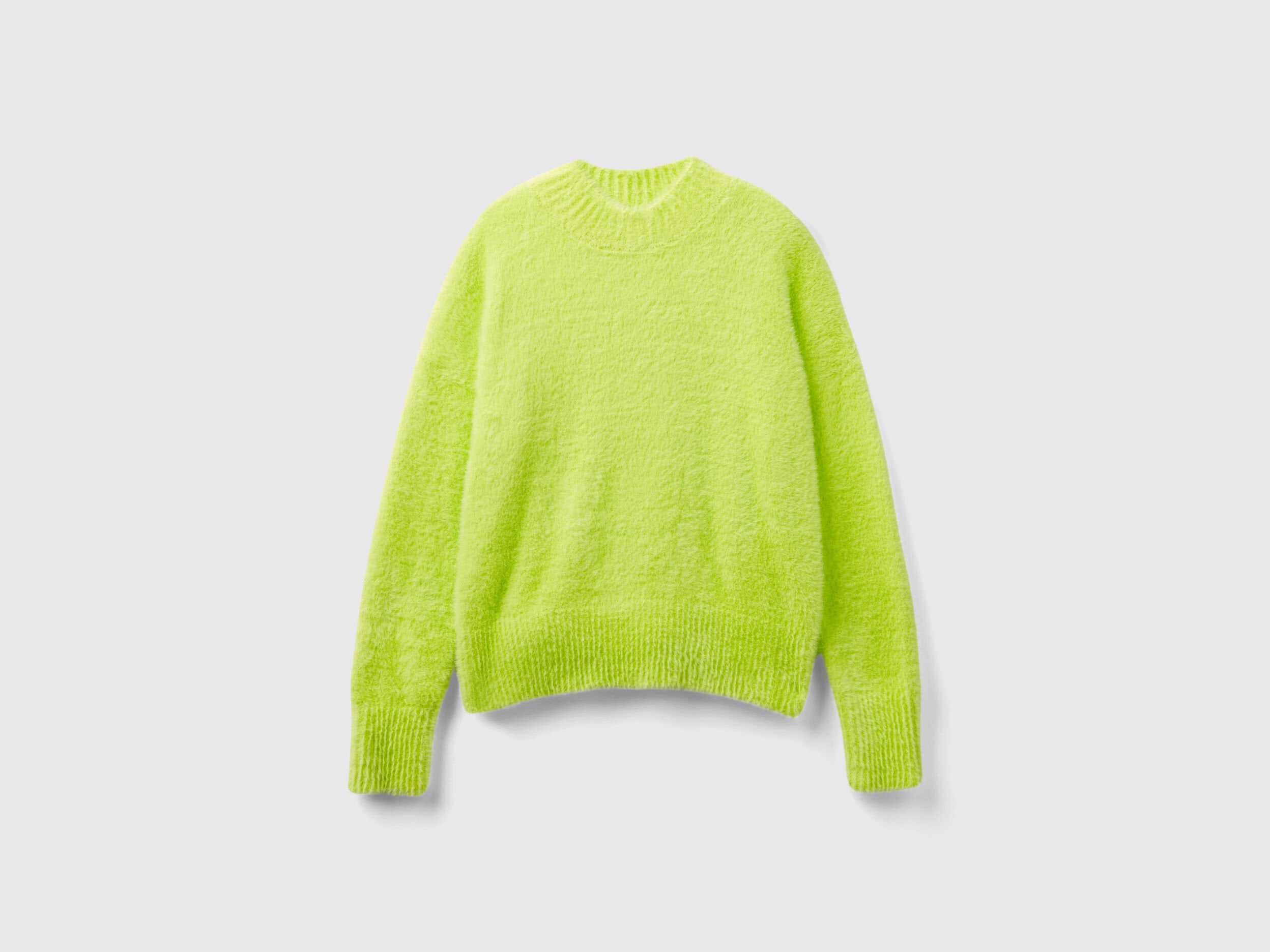 Soft sweater in soft furry yarn, with high neck, long sleeves and dropped shoulders. Warm and comfortable, an alternative to the classic sweater.