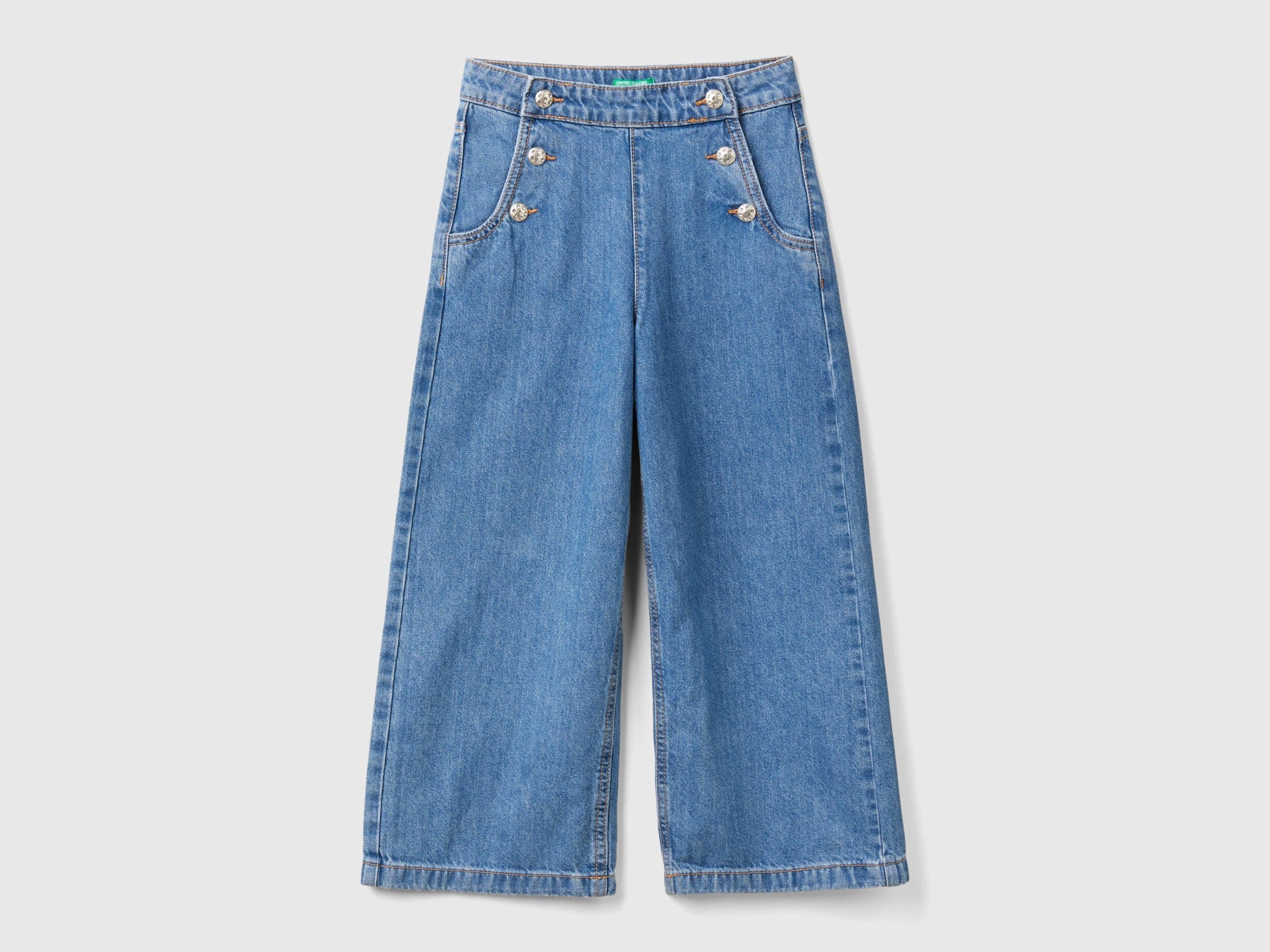 Long trousers in 100% cotton denim with wide leg. Opening with snap jewel effect buttons along the pockets and patch pockets on the back. Internal adjustable elastic waistband. For everyday outfits with a glamorous touch.