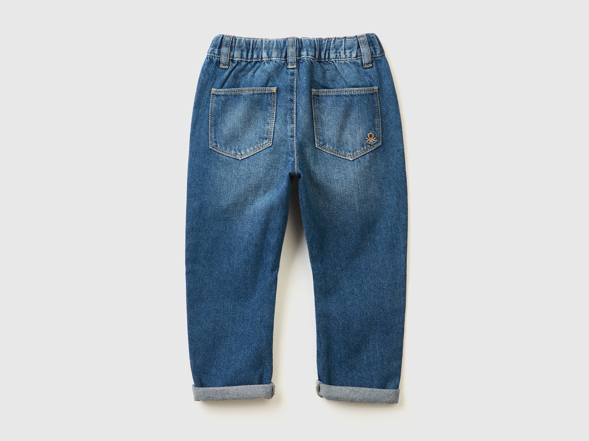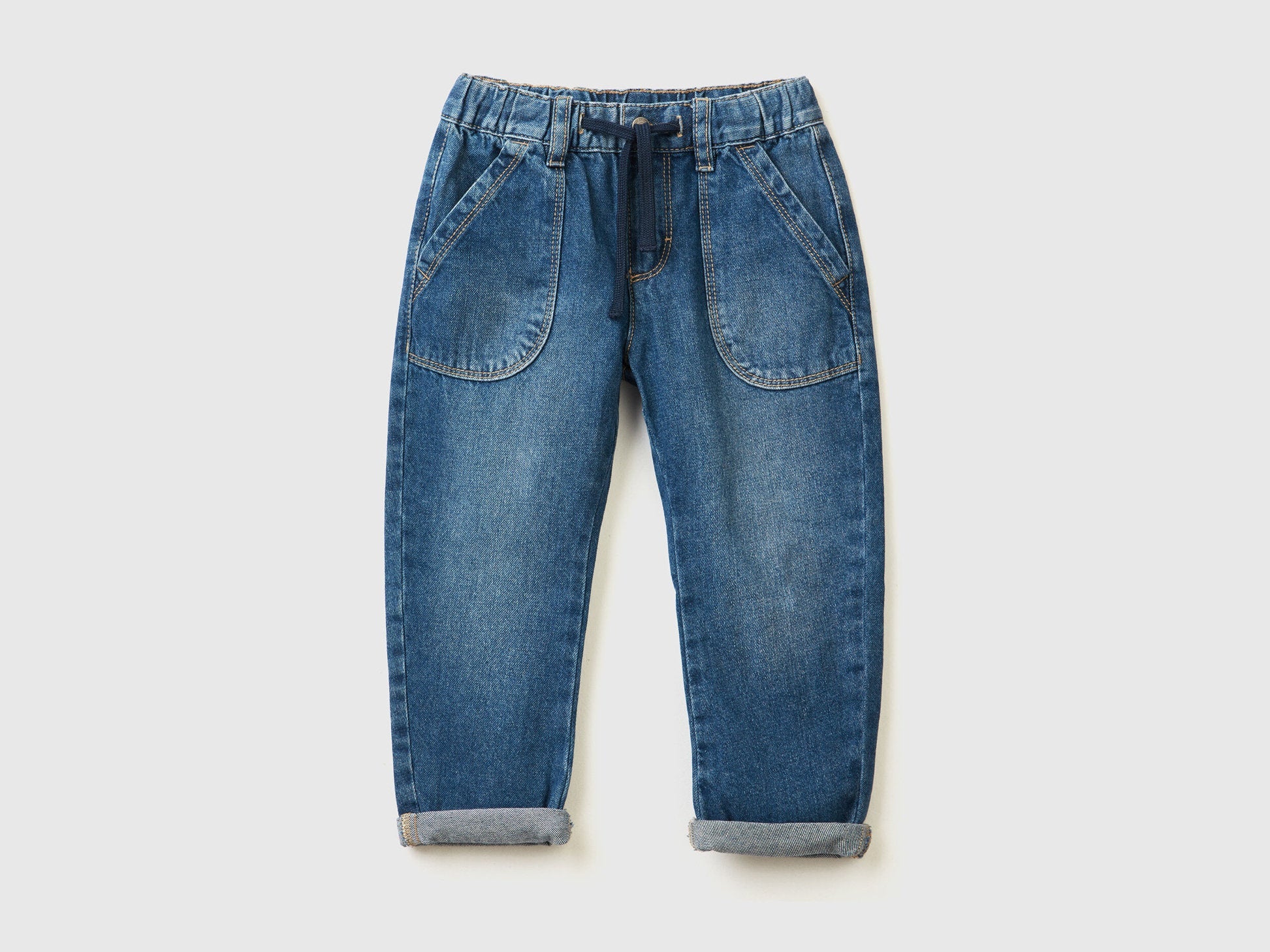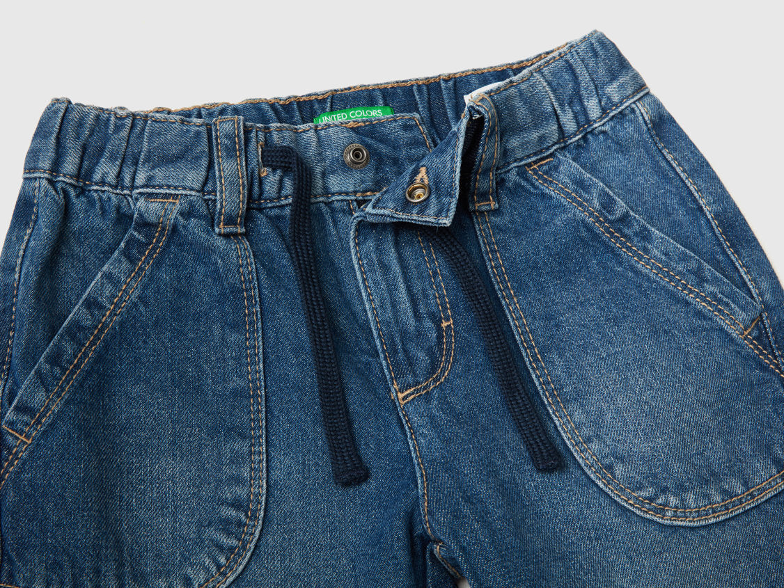 Long denim trousers in pure cotton with slight worn look. Waist with inner elastic at the back and drawstring, comfortable zip and button opening. Practical maxi patch pockets on the front and small pockets on the back. A piece with a comfortable fit that can also be worn with turn-ups at the bottom.