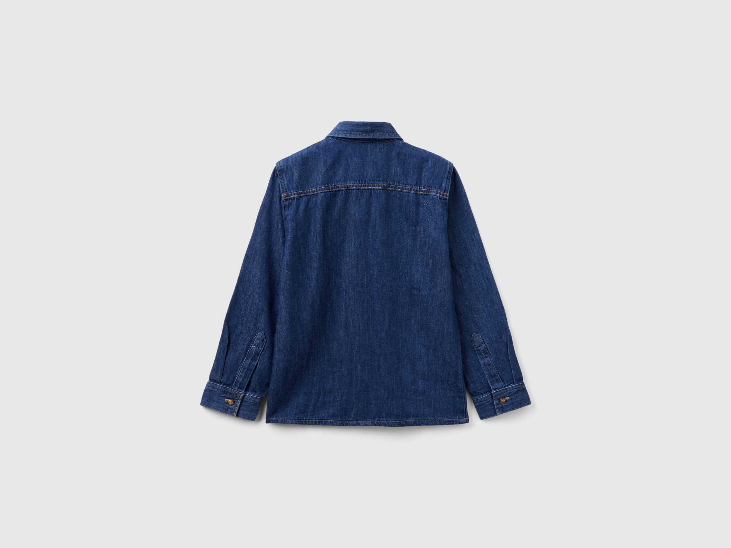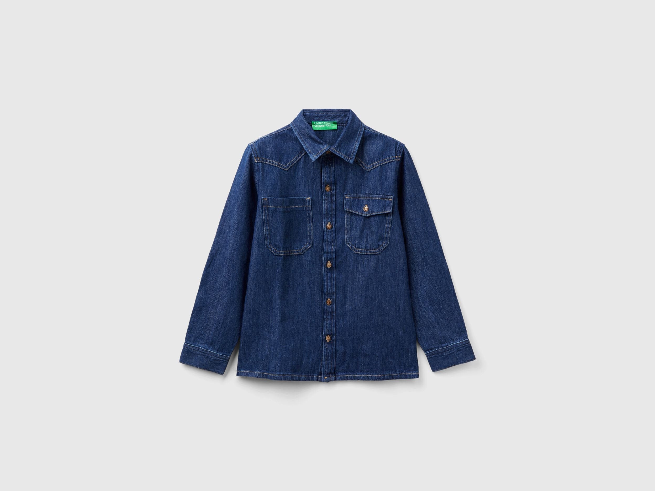 Long sleeve shirt in light 100% cotton denim. Classic collar and front opening with buttons. Patch pockets on the chest, one of which has a flap and button. Western style in a junior version.