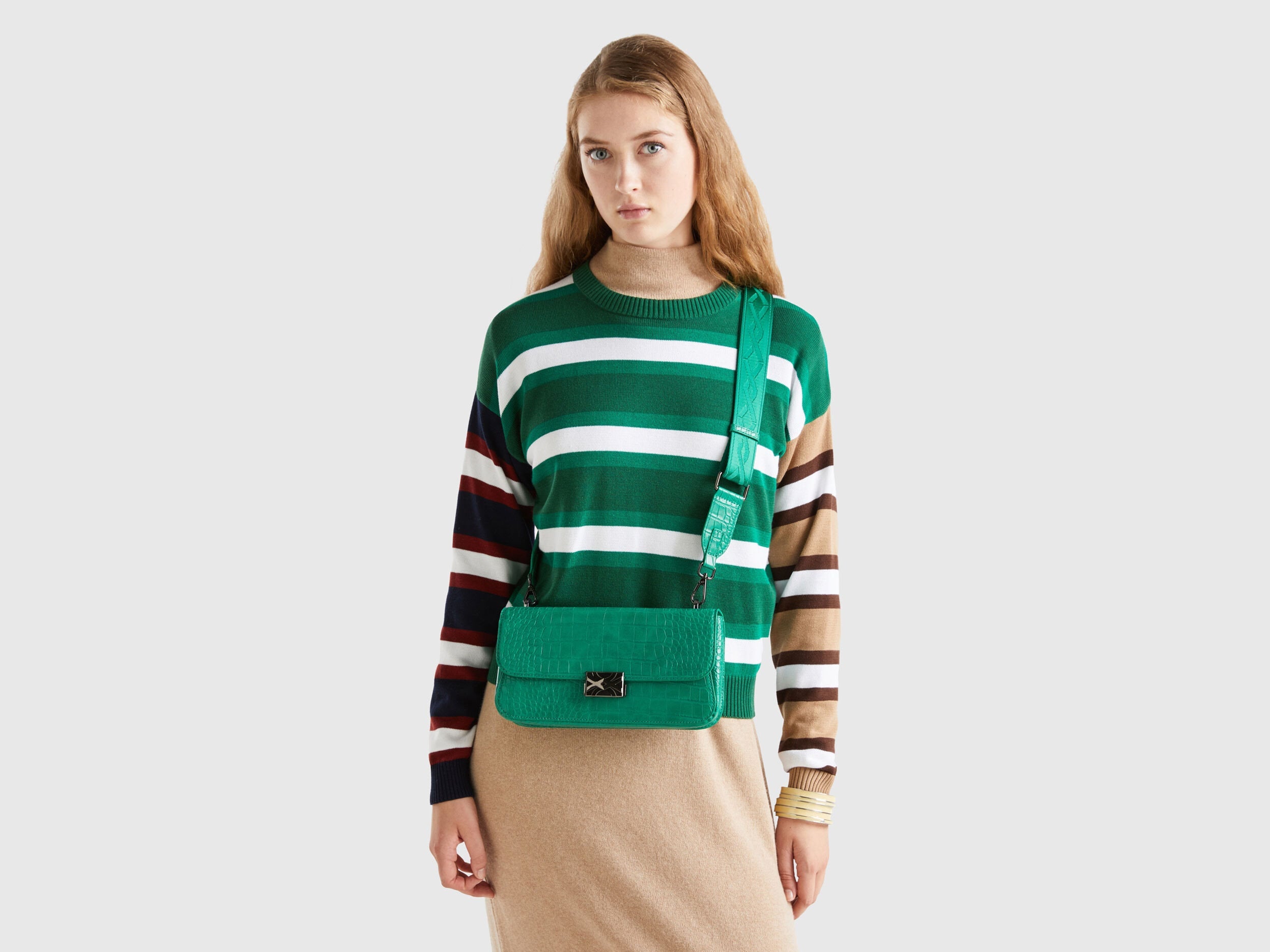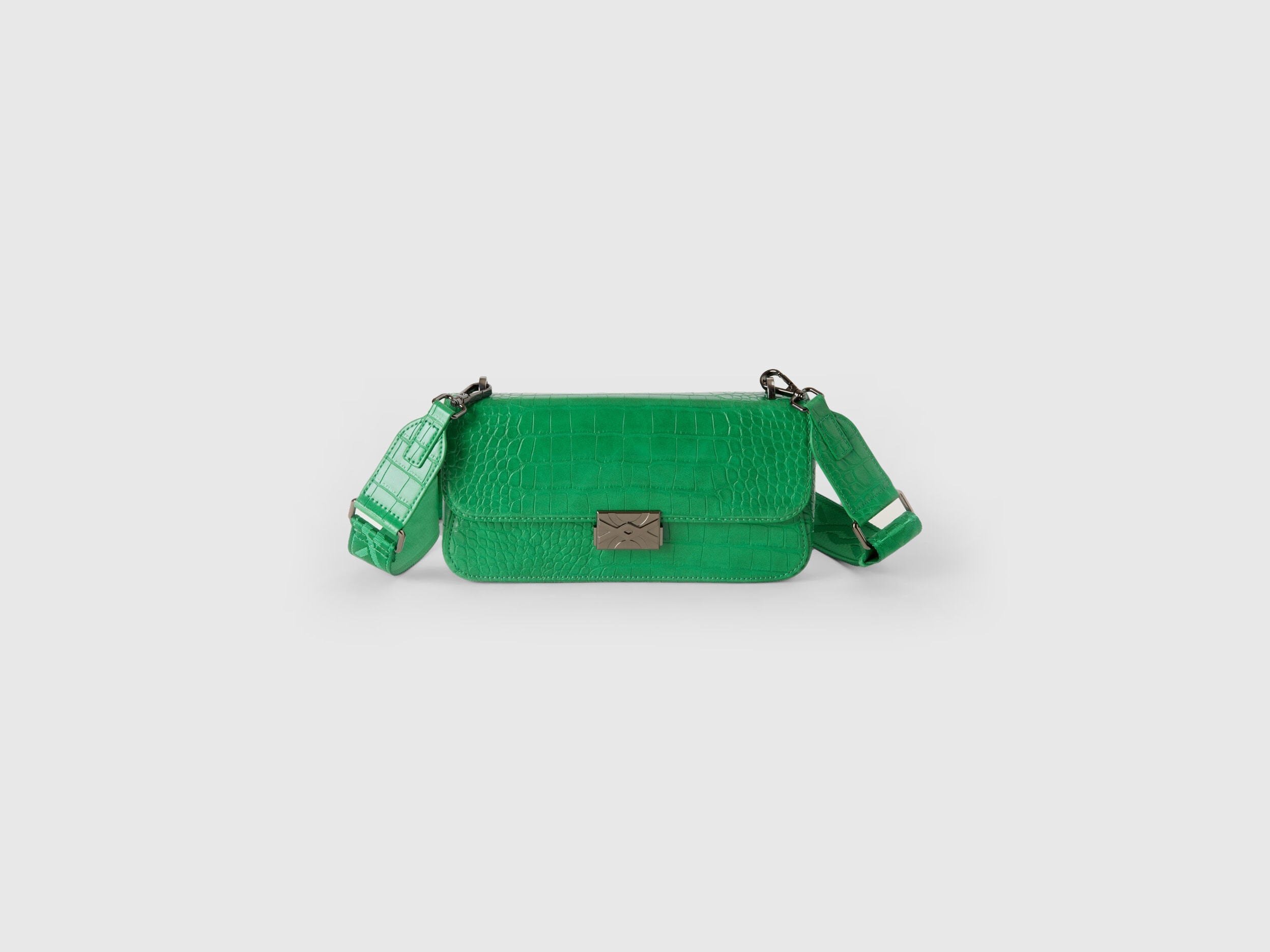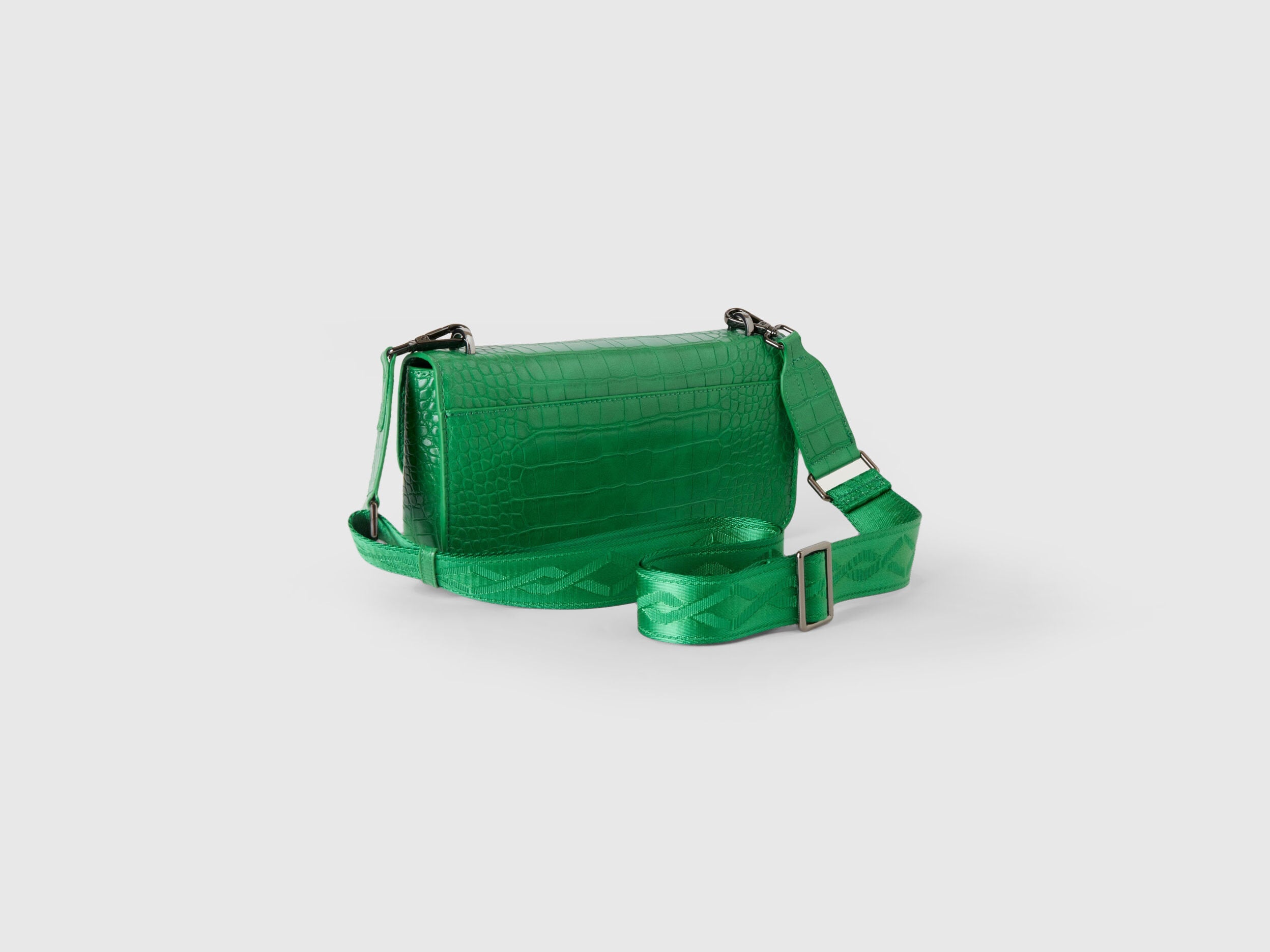 Medium rectangular bag in imitation leather with crocodile print. Adjustable and removable jacquard shoulder strap. Front flap and metal magnetic closure with logo.