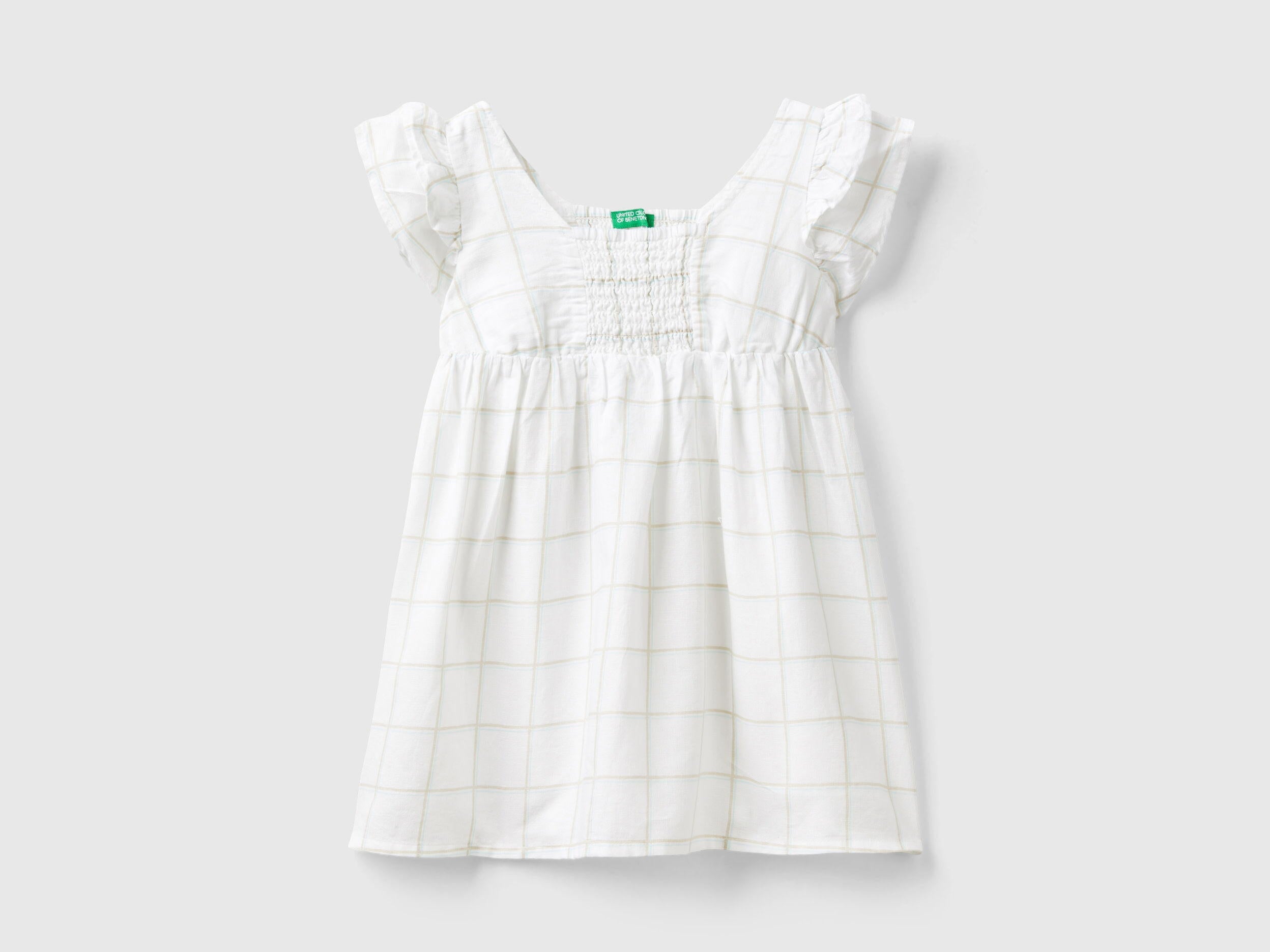 Dress lined in pure cotton, with patterned print all over. Round neckline and short cap sleeves. This piece is made of cotton and linen blend: a resistant, recyclable vegetable fiber that consumes minimal natural resources.