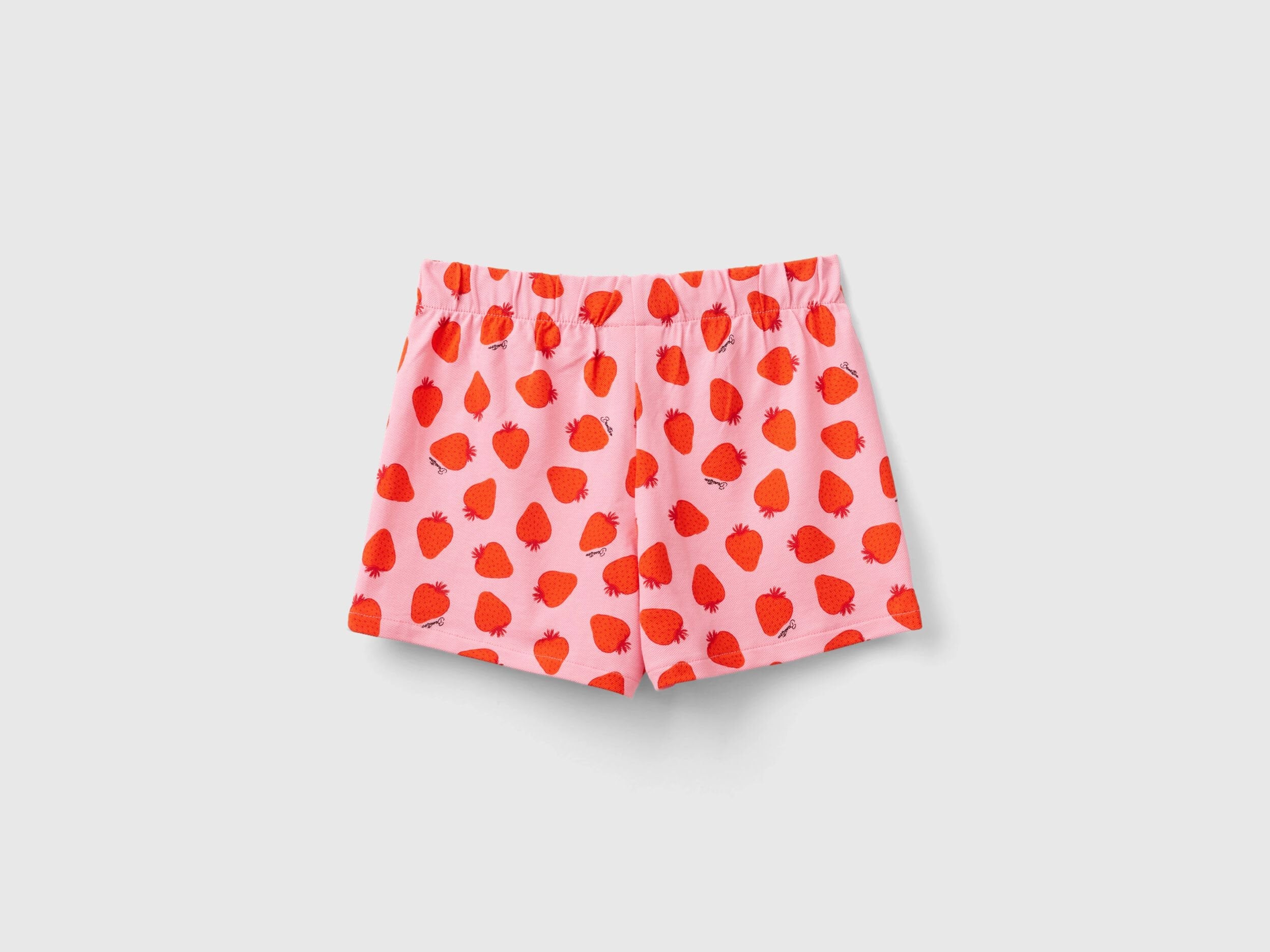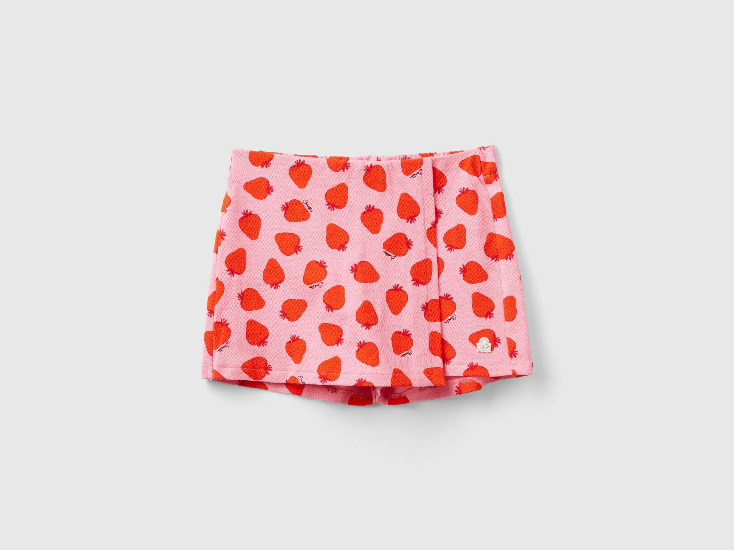 Culottes in stretch cotton pique. Regular fit, waist with internal elastic and lurex logo patch on the bottom. Red strawberry pattern on a pink background. Pop and fun style, for contemporary looks full of personality.