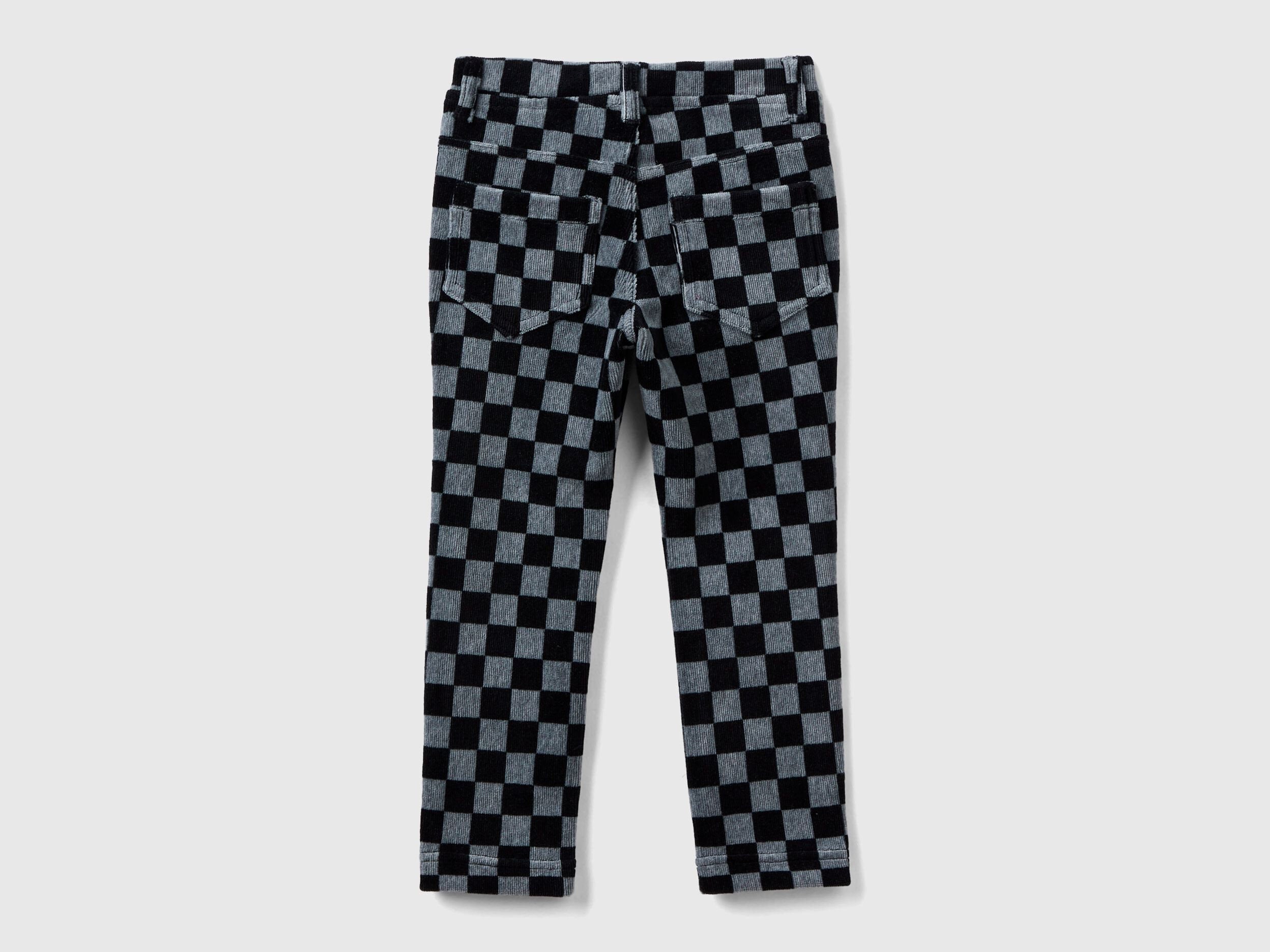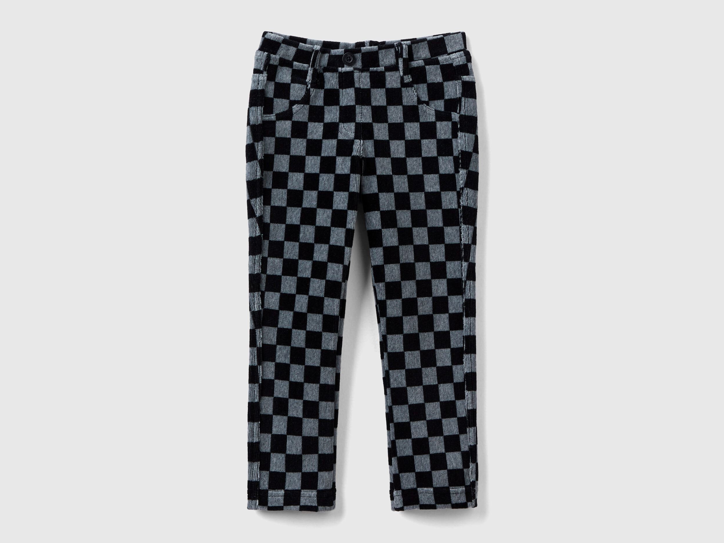 Slim fit long trousers in soft stretch chenille with allover two-tone check print. Inner elastic waistband, mock opening and mock front pockets. Yoke and patch pockets on the back. Vibrant and super comfy.