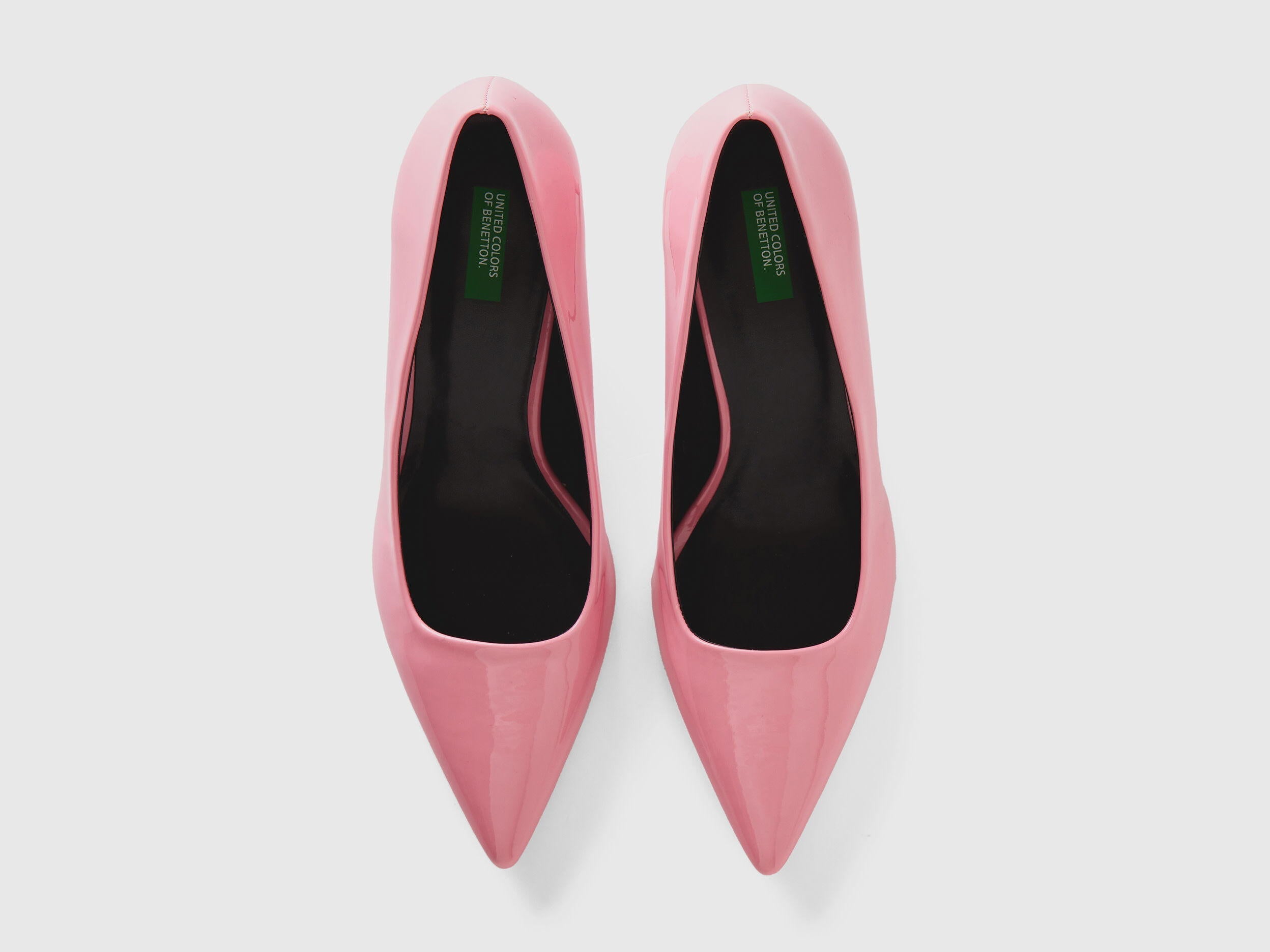 Pump-style shoes in shiny synthetic patent leather. Pointed upper and low stiletto heel. For cool and contemporary urban looks.