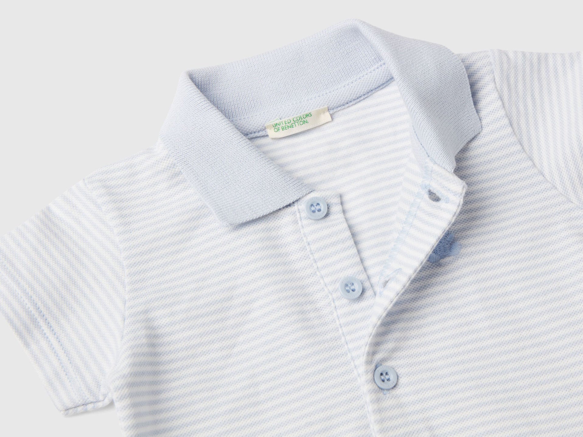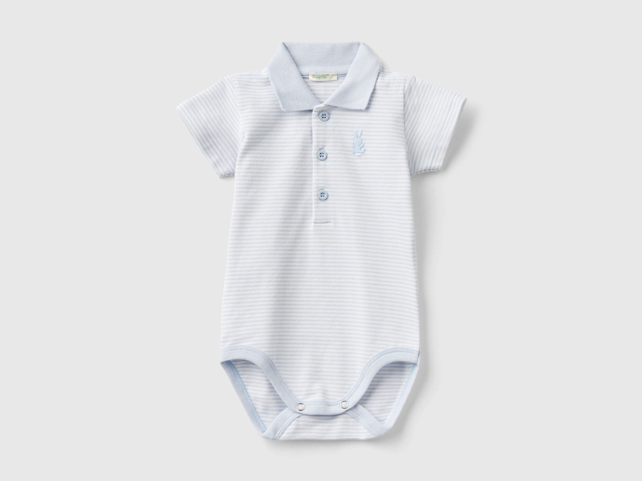 Short sleeve polo bodysuit in yarn dyed striped stretch cotton pique. Bunny embroidered at left breast, classic collar with partial button opening and snap button closure at the crotch. Casual style in a baby version.