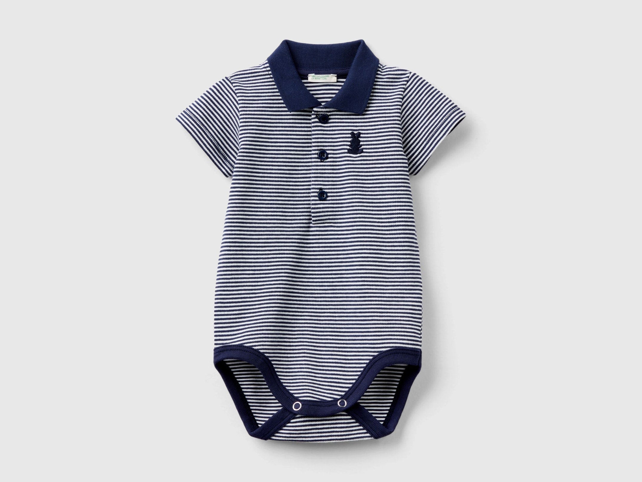 Short sleeve polo bodysuit in yarn dyed striped stretch cotton pique. Bunny embroidered at left breast, classic collar with partial button opening and snap button closure at the crotch. Casual style in a baby version.