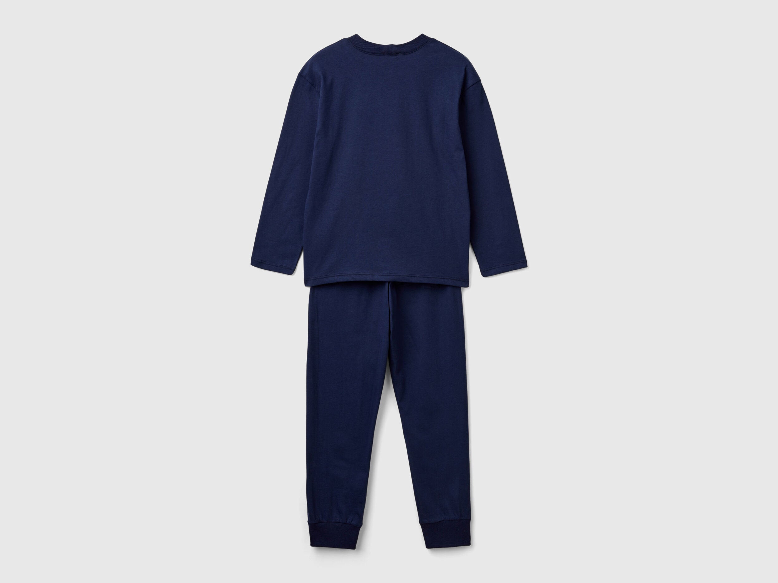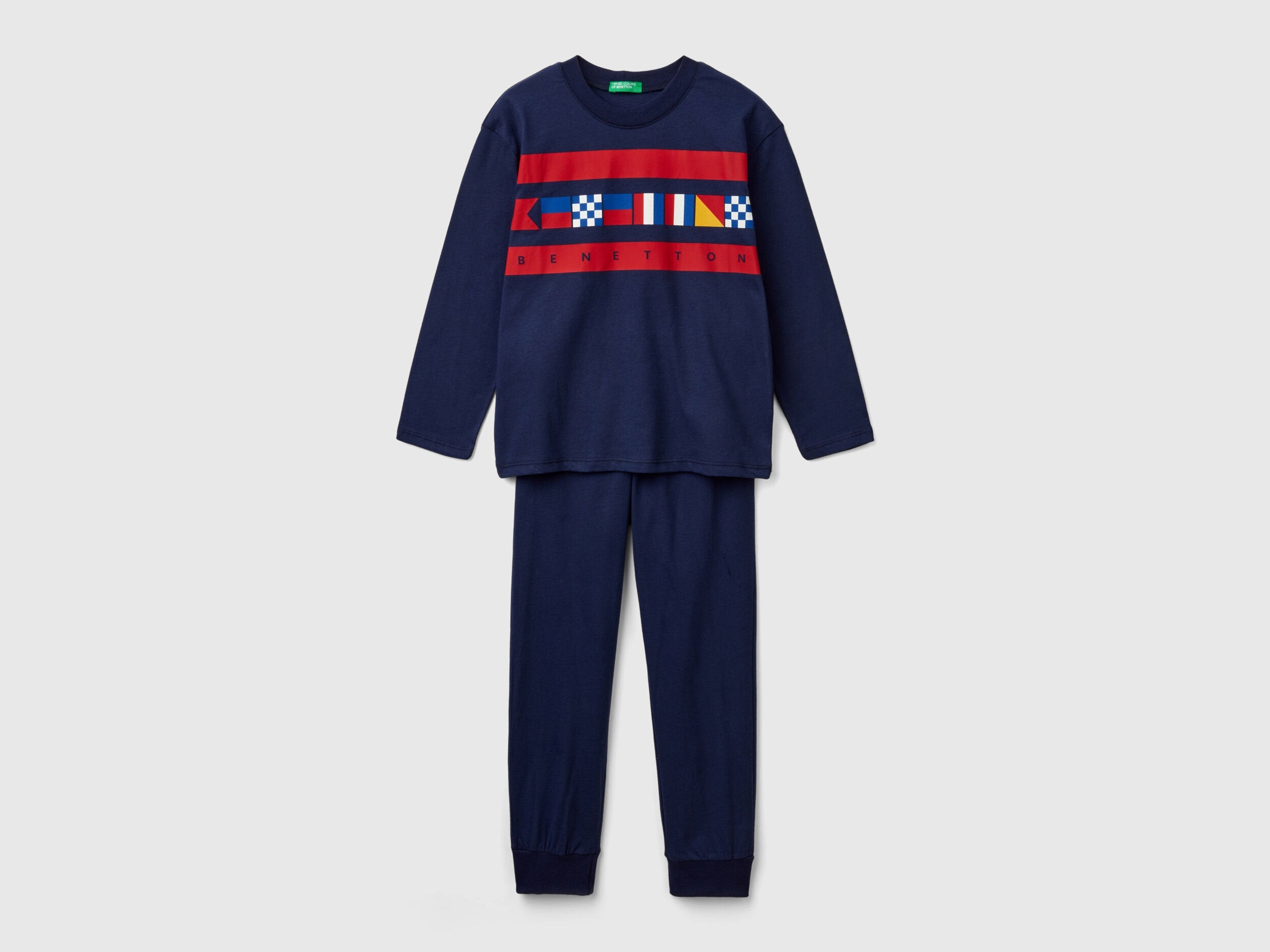 Long pyjamas made of long staple cotton, lightweight and skin friendly, to offer maximum comfort. Long sleeve crew neck top with print on front. Long trousers with internal elastic waist and patch pocket at back.