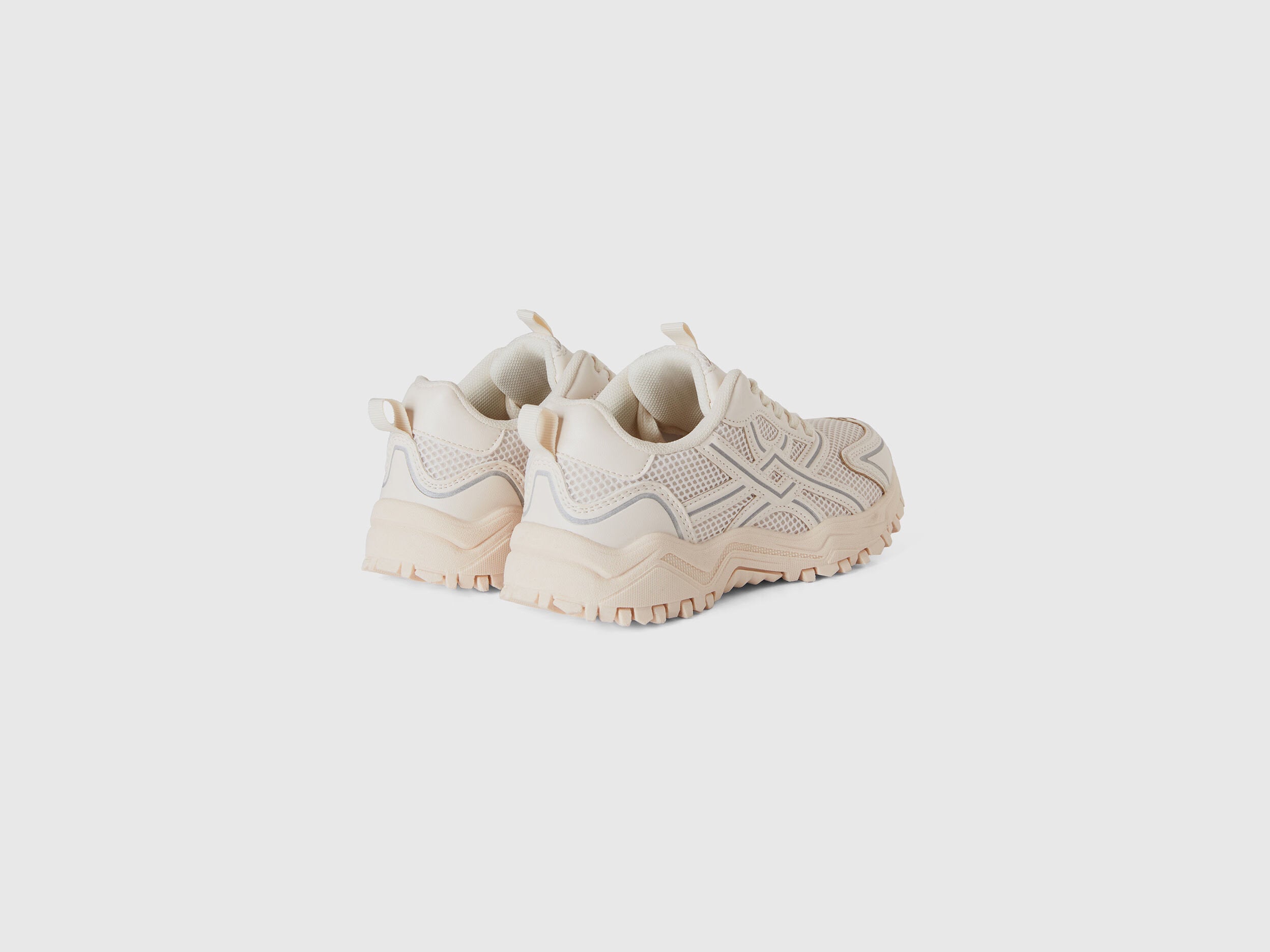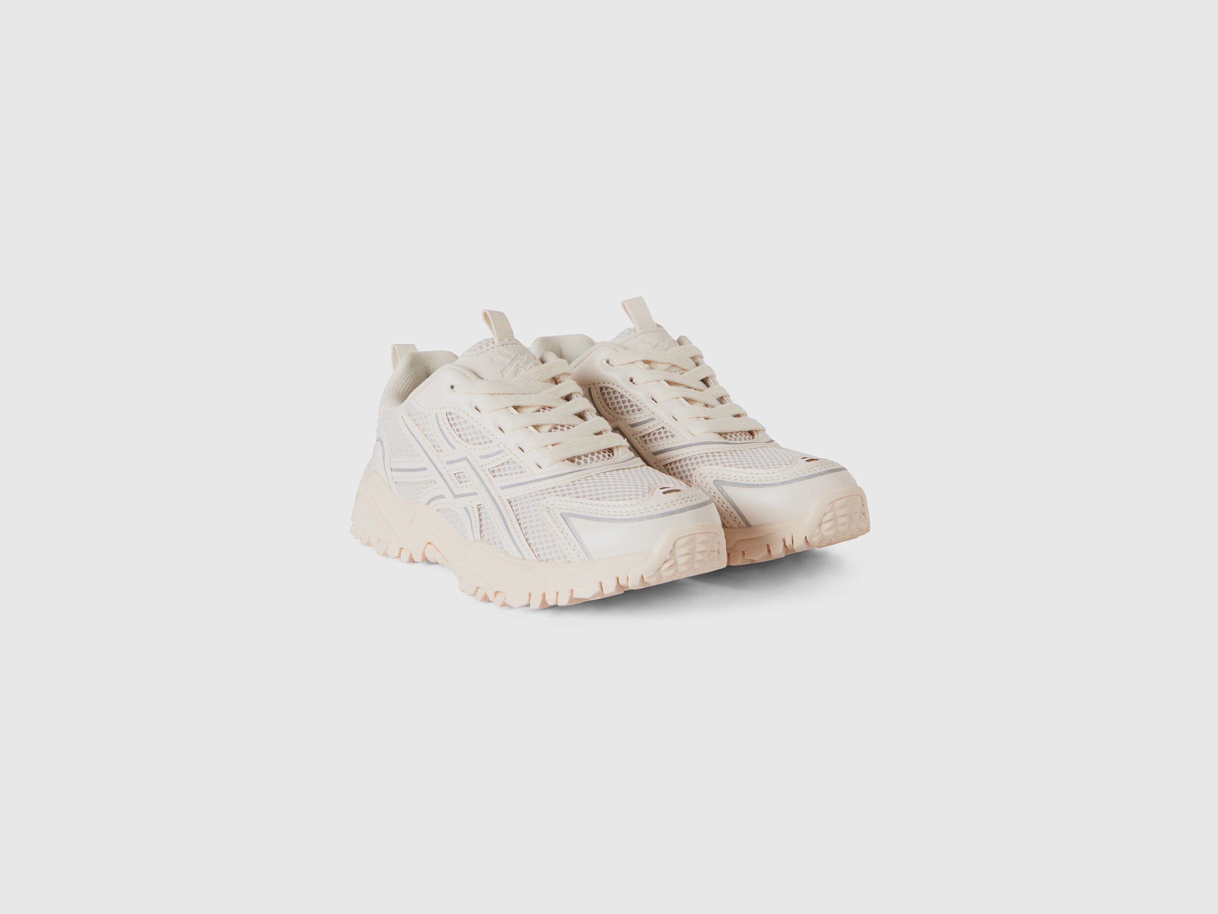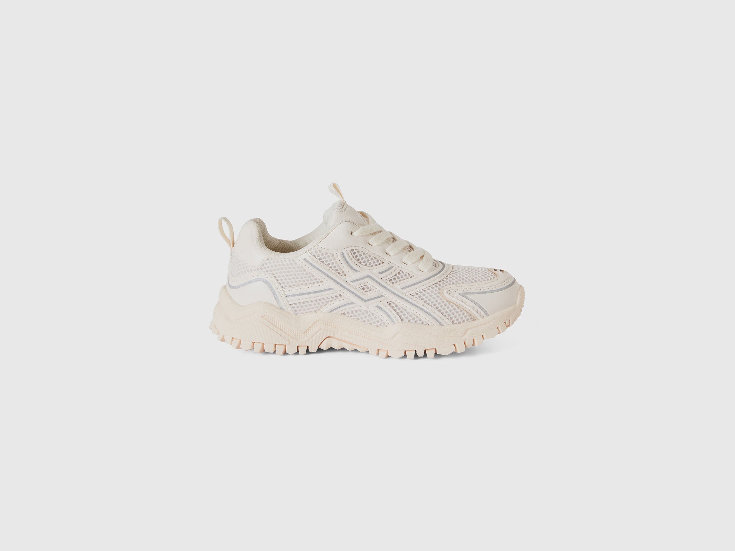Lace-up running shoes. Mesh uppers with imitation leather inserts that make up the logo on the sides. High cushioned rubber sole with molded tread. Perfect for running and playing.