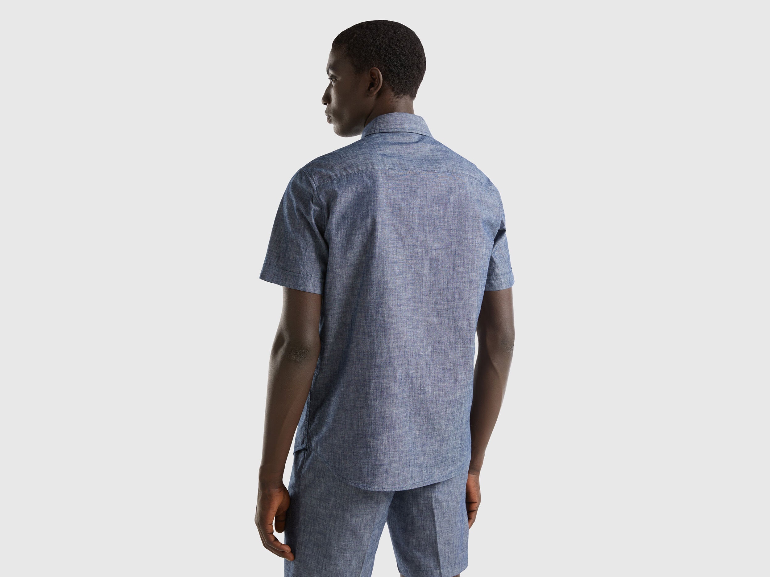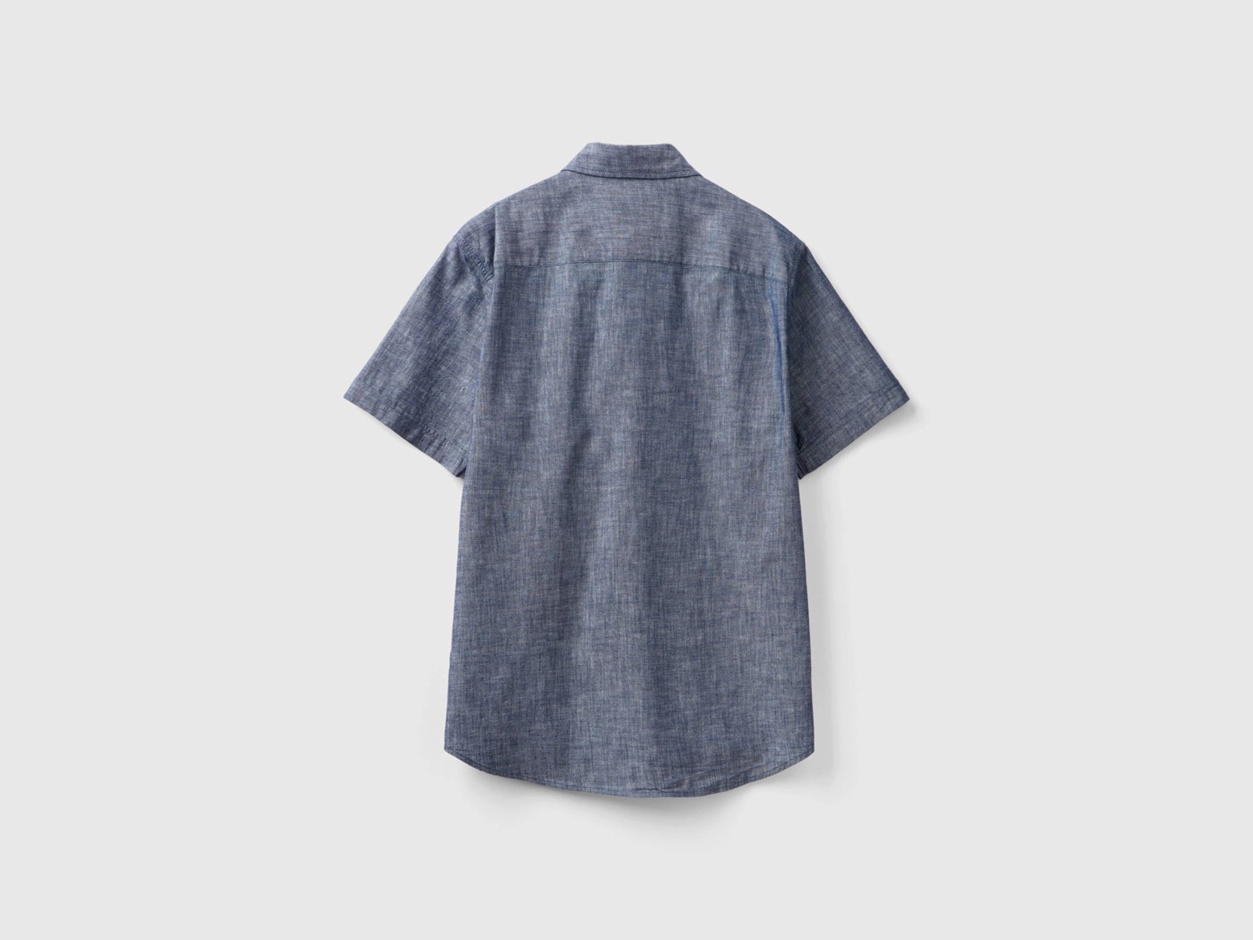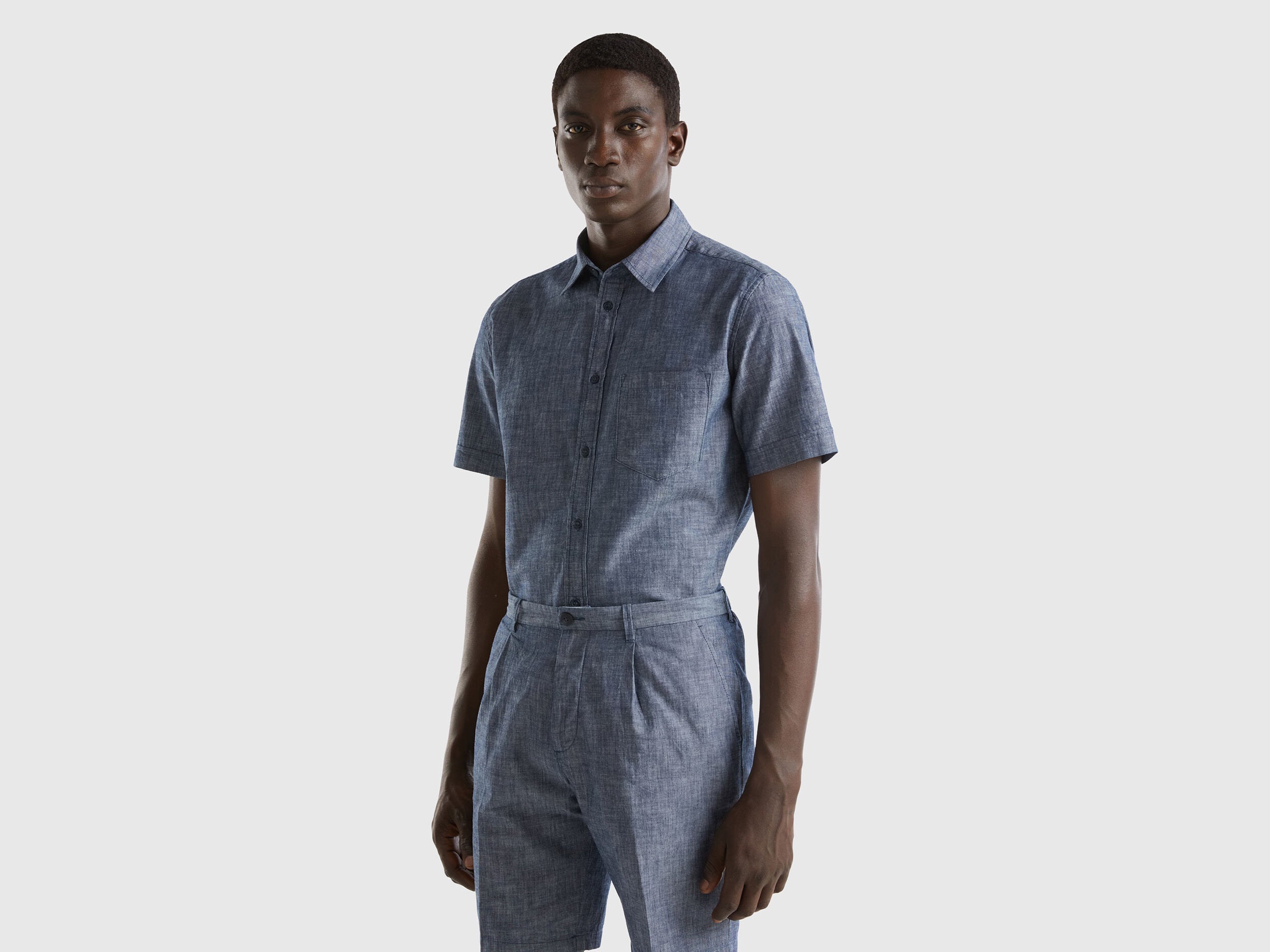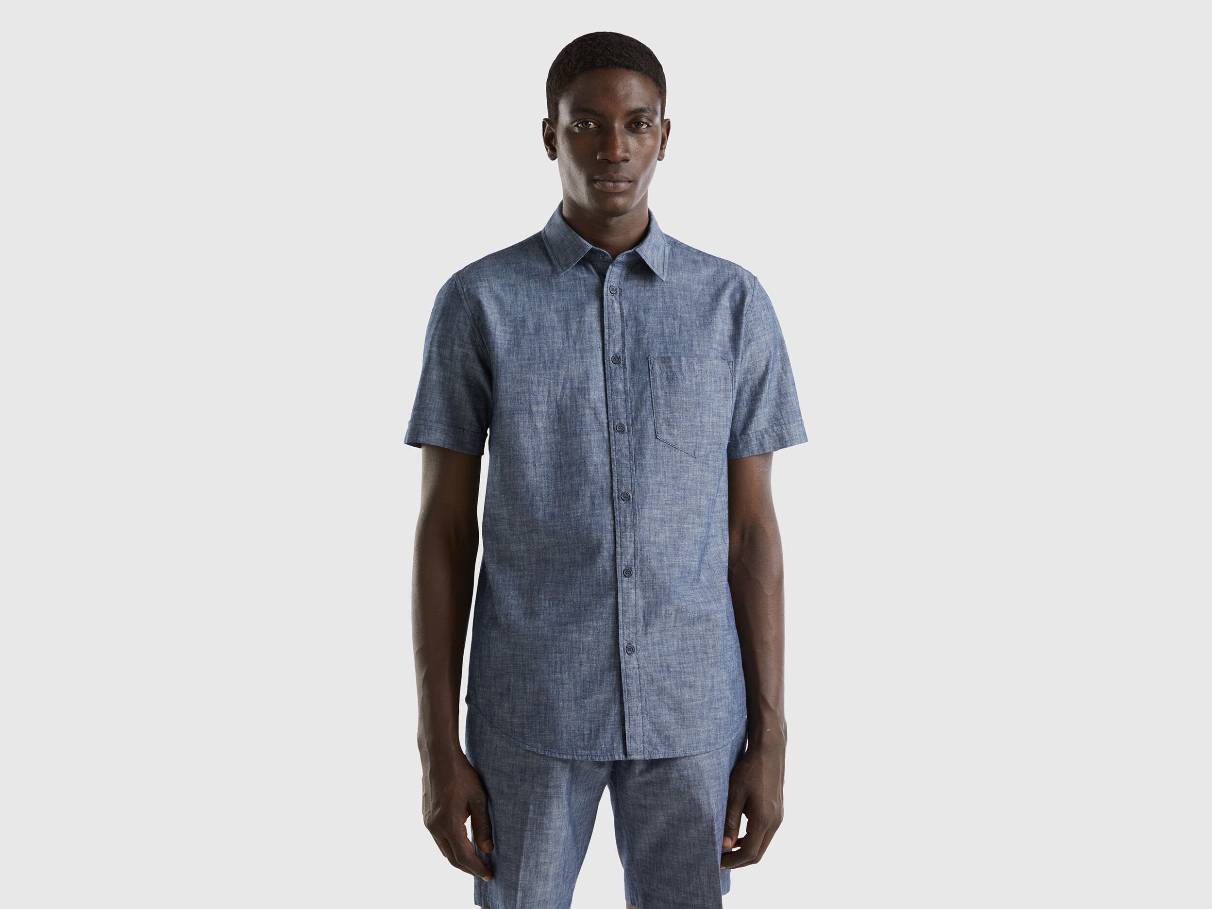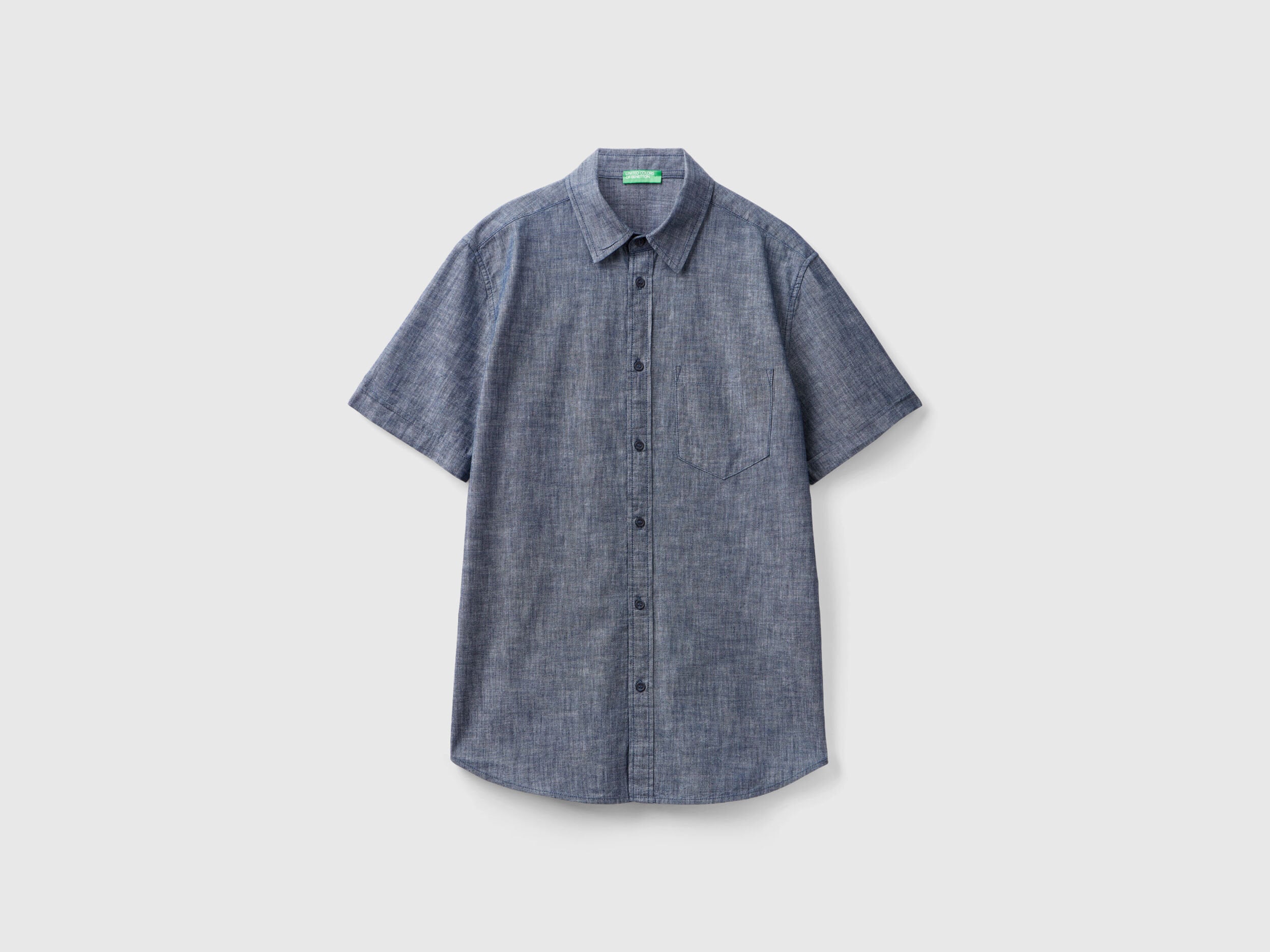 Slim fit short sleeve shirt in pure cotton chambray. Classic collar, front buttoning and breast pocket applique. Lightweight and fresh, a must-have for the summer.